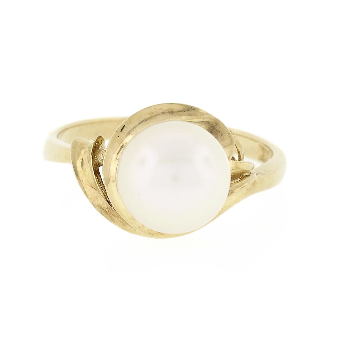 A vintage solid 18k yellow gold solitaire ring, featuring 1 round shape cultured pearl (8mm).The ring is size 5.5, weighs a total of 3.11 grams, and measures 9.7mm wide.