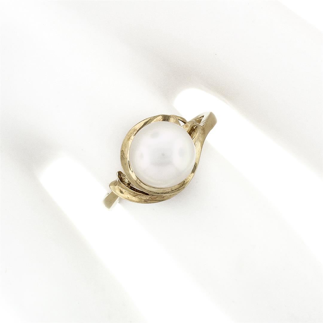 A vintage solid 18k yellow gold solitaire ring, featuring 1 round shape cultured pearl (8mm).The ring is size 5.5, weighs a total of 3.11 grams, and measures 9.7mm wide.