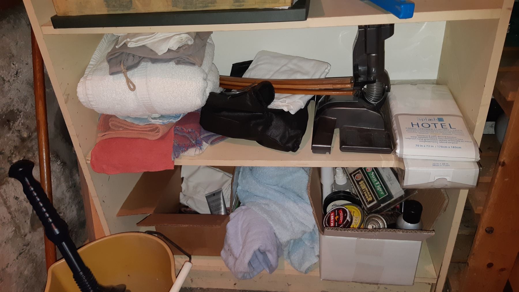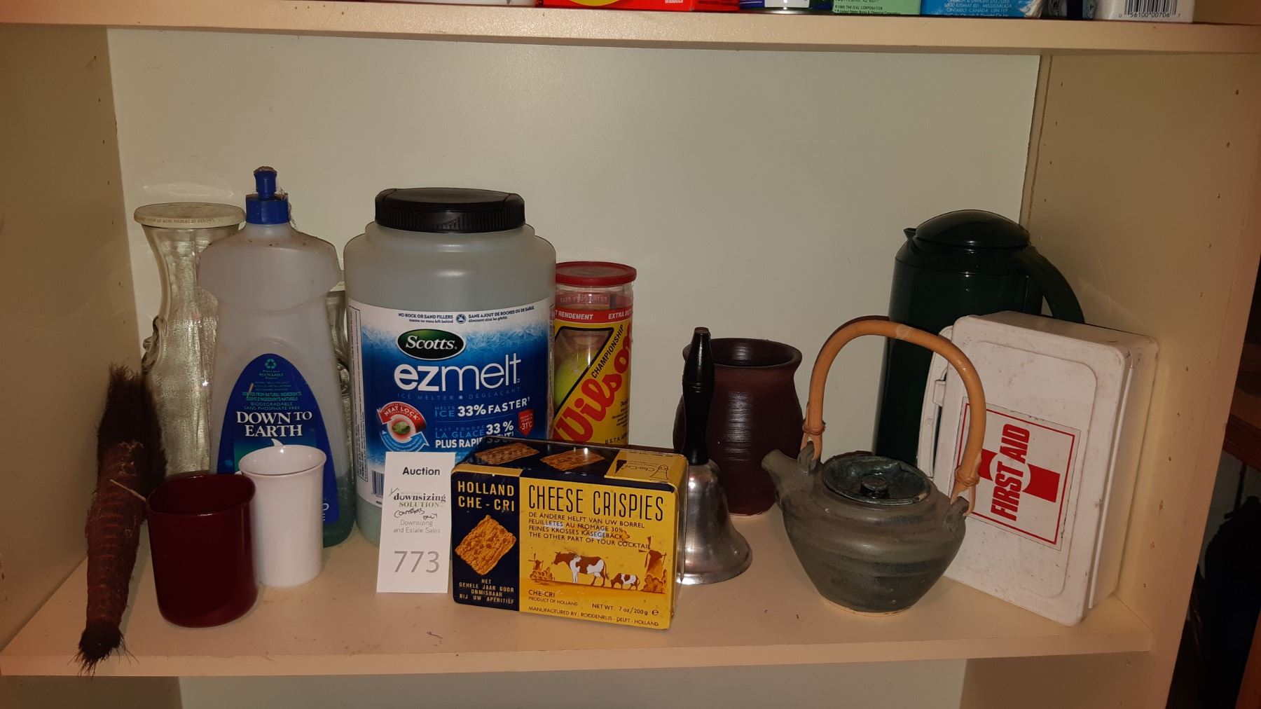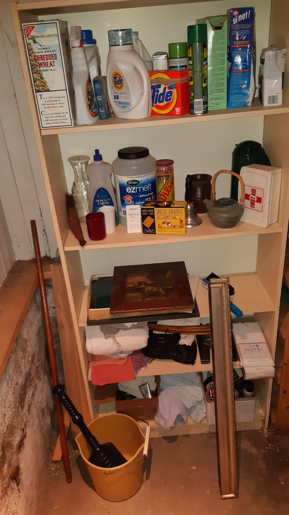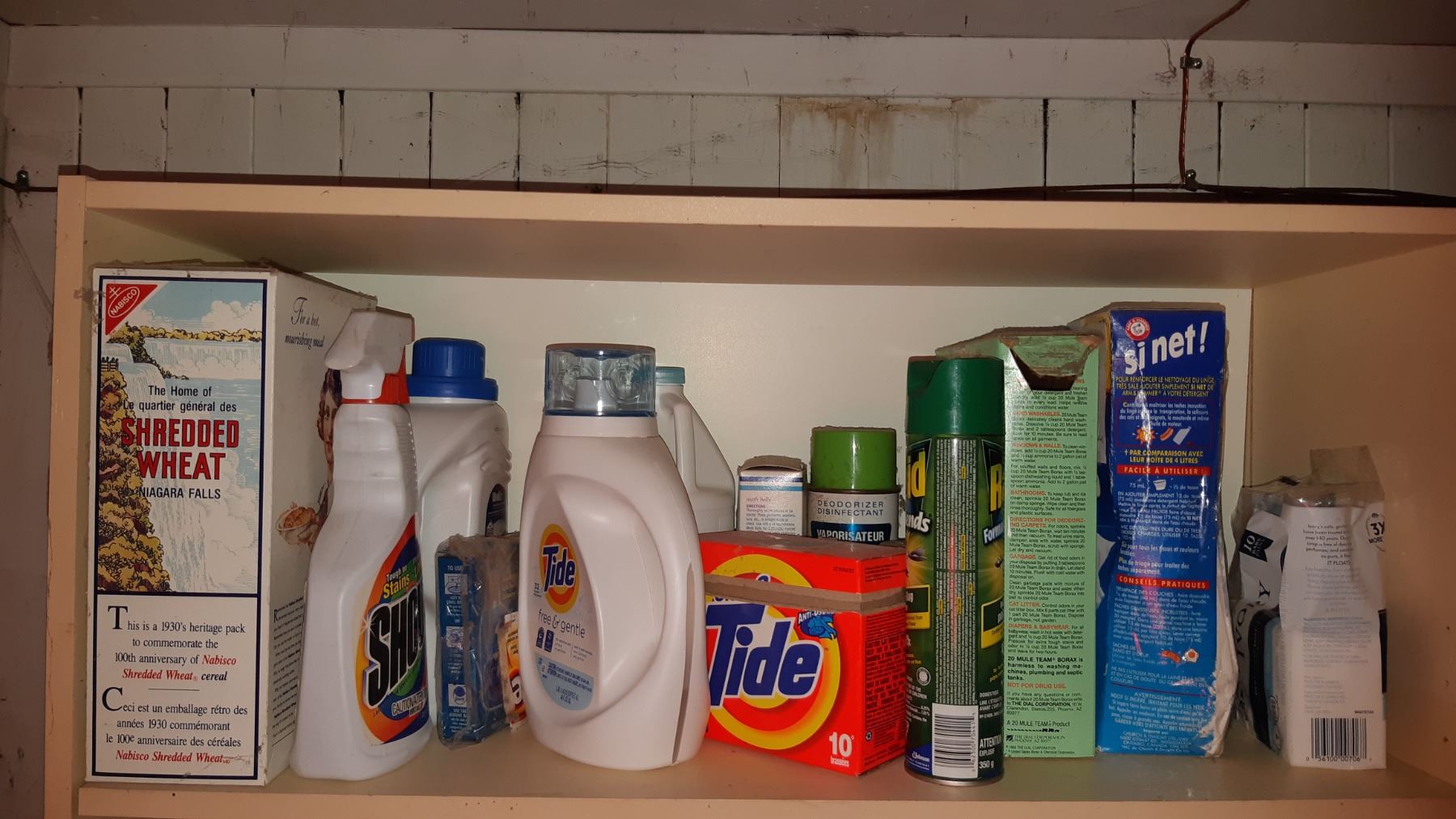 4shelves of cleaning products. Gold shelf 3' bring packing and pickup at 10:30 am