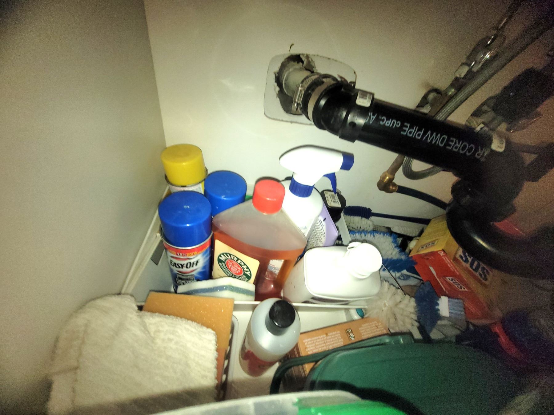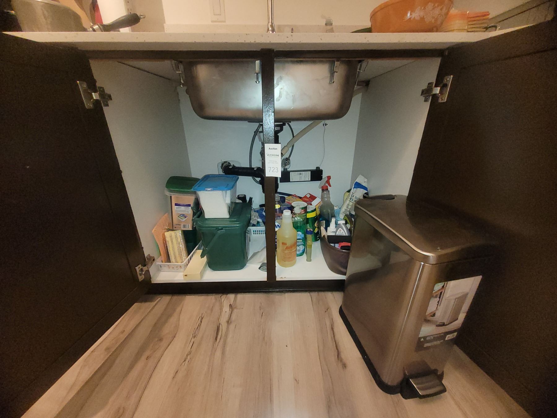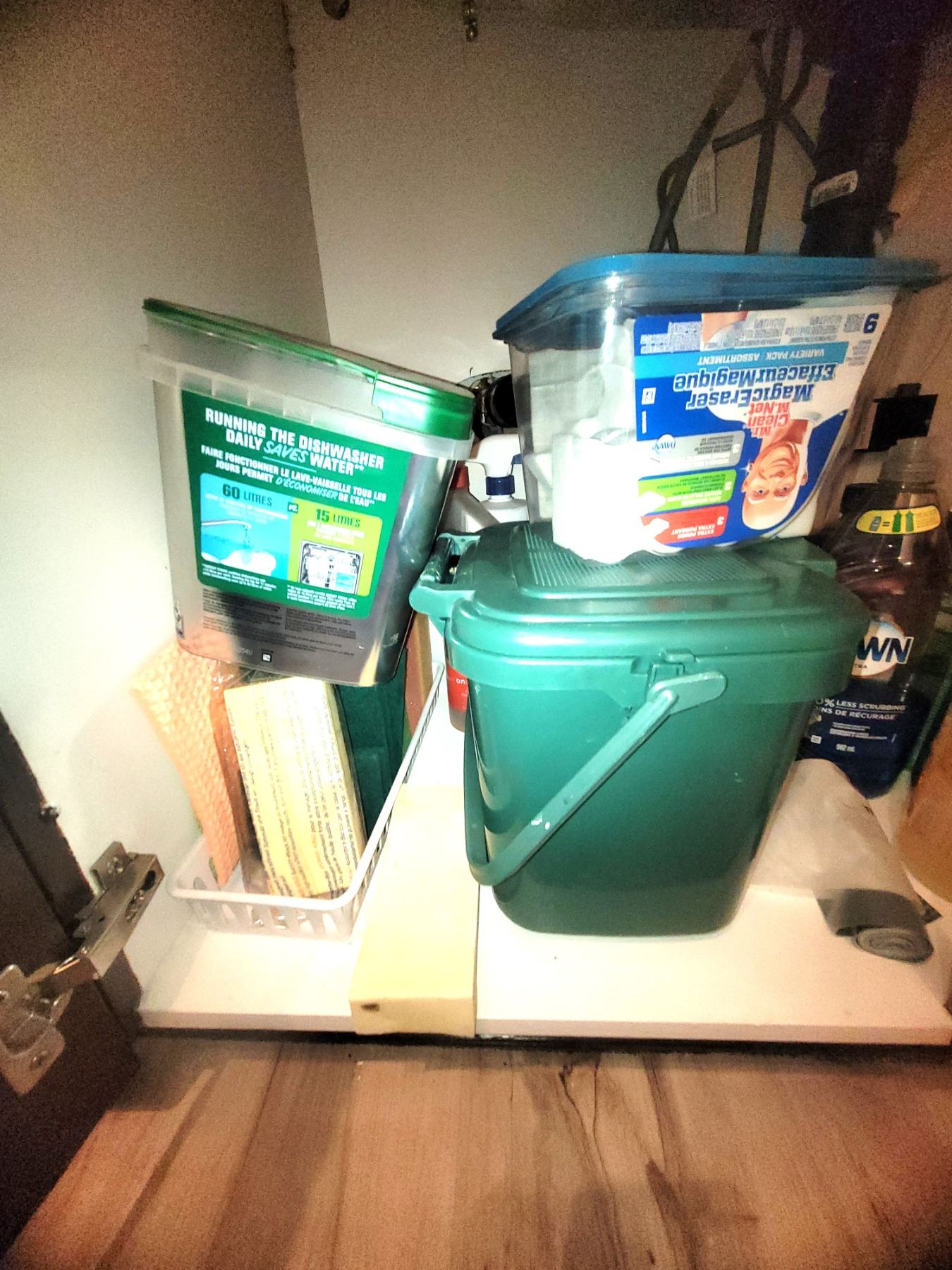 Cleaning supplies & Stainless steel garbage bin. Pickup at 9 am