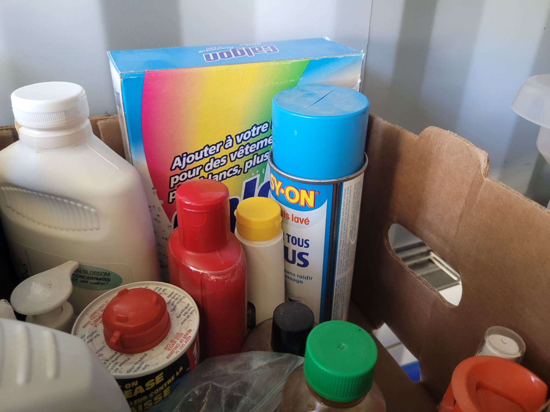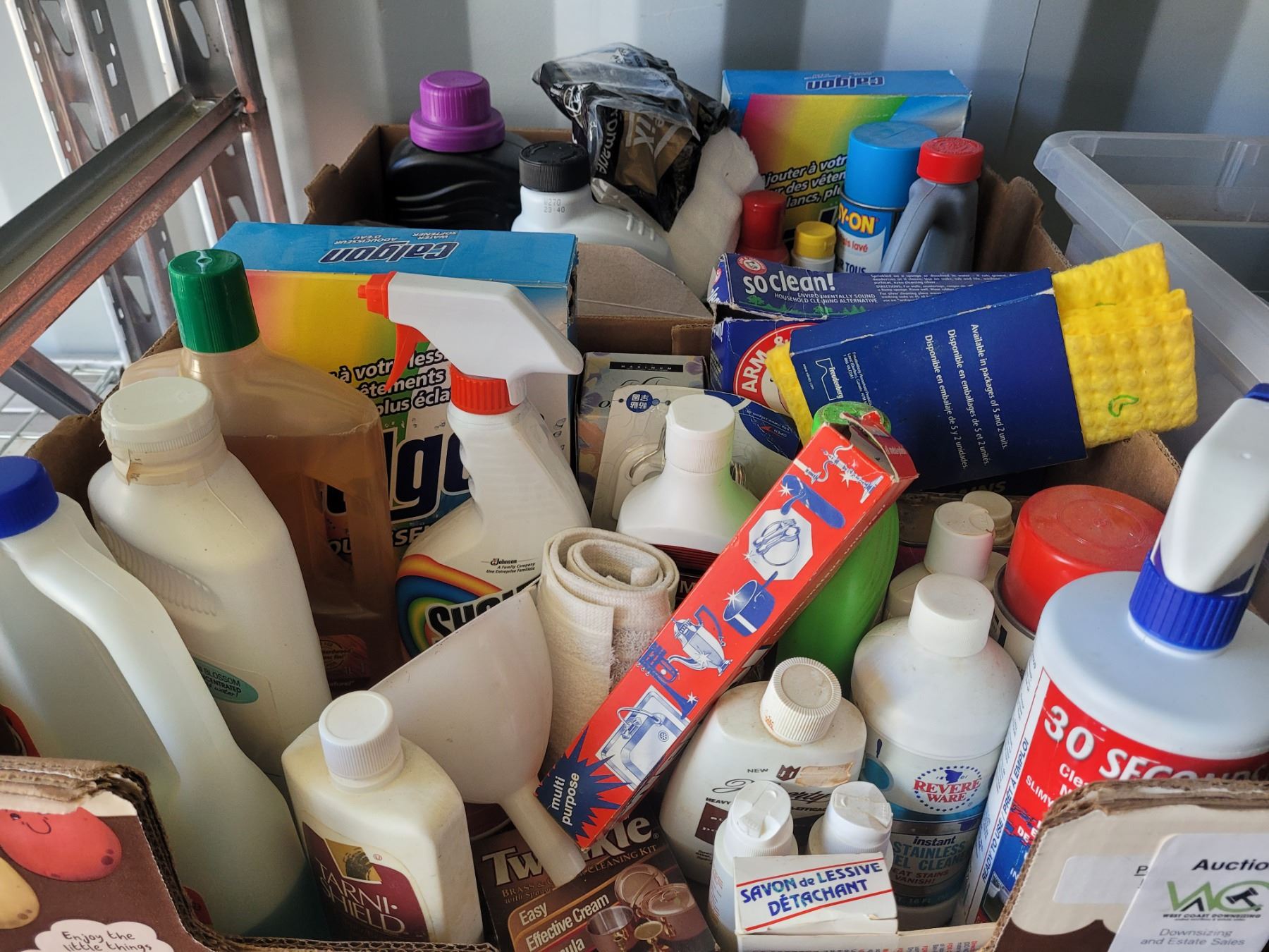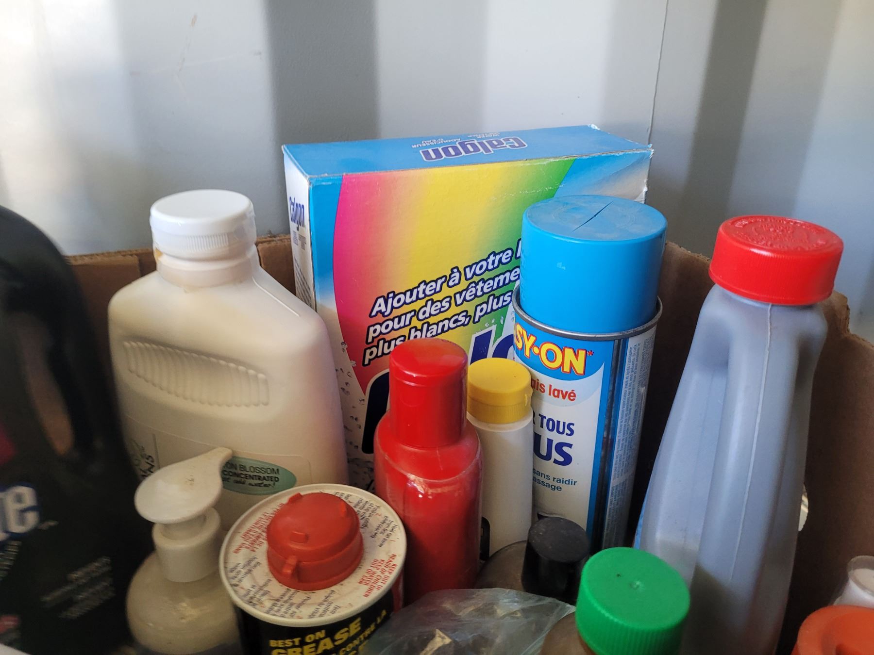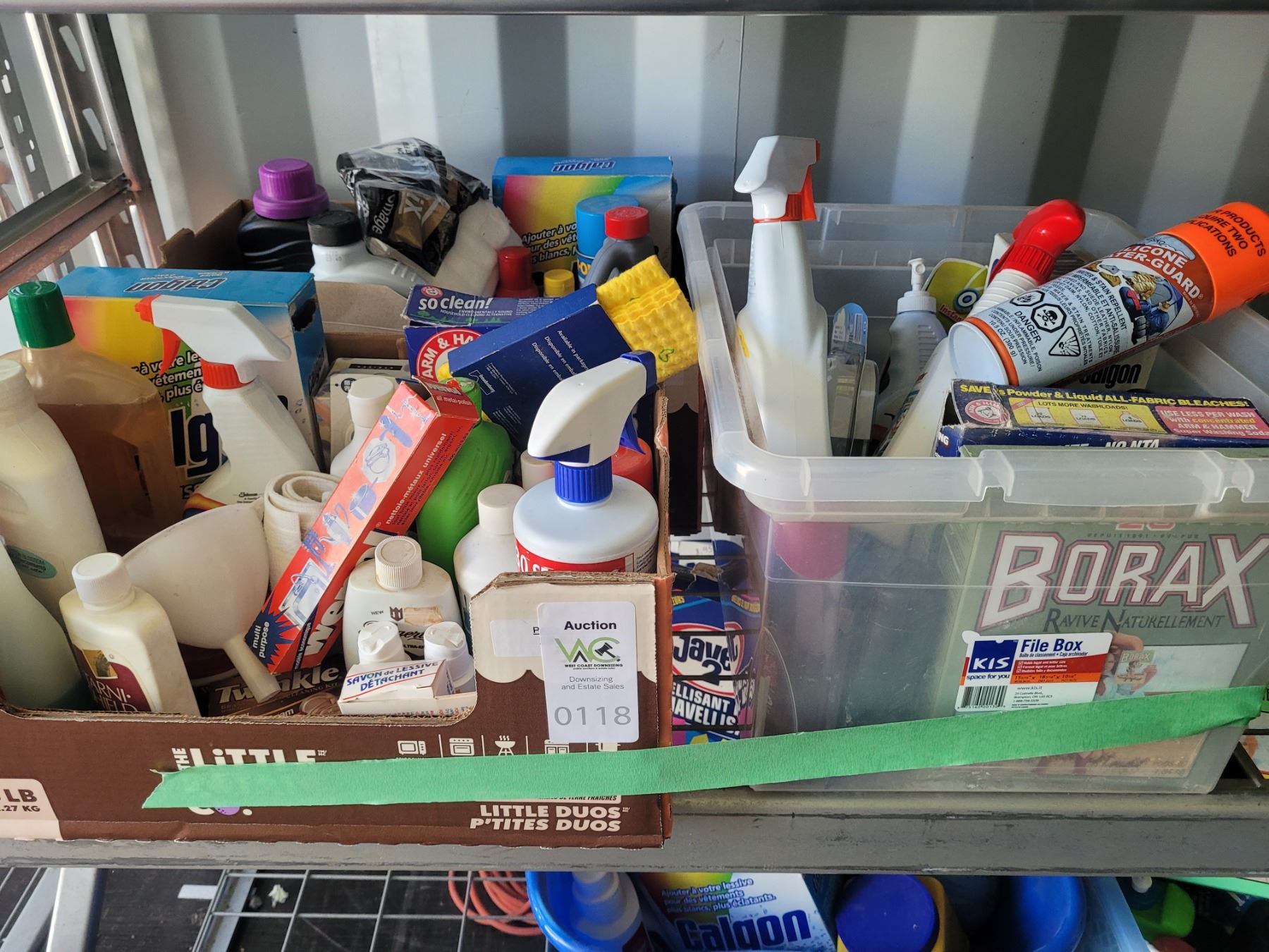 2 containers of cleaning supplies, some are full. Pickup at 10 am