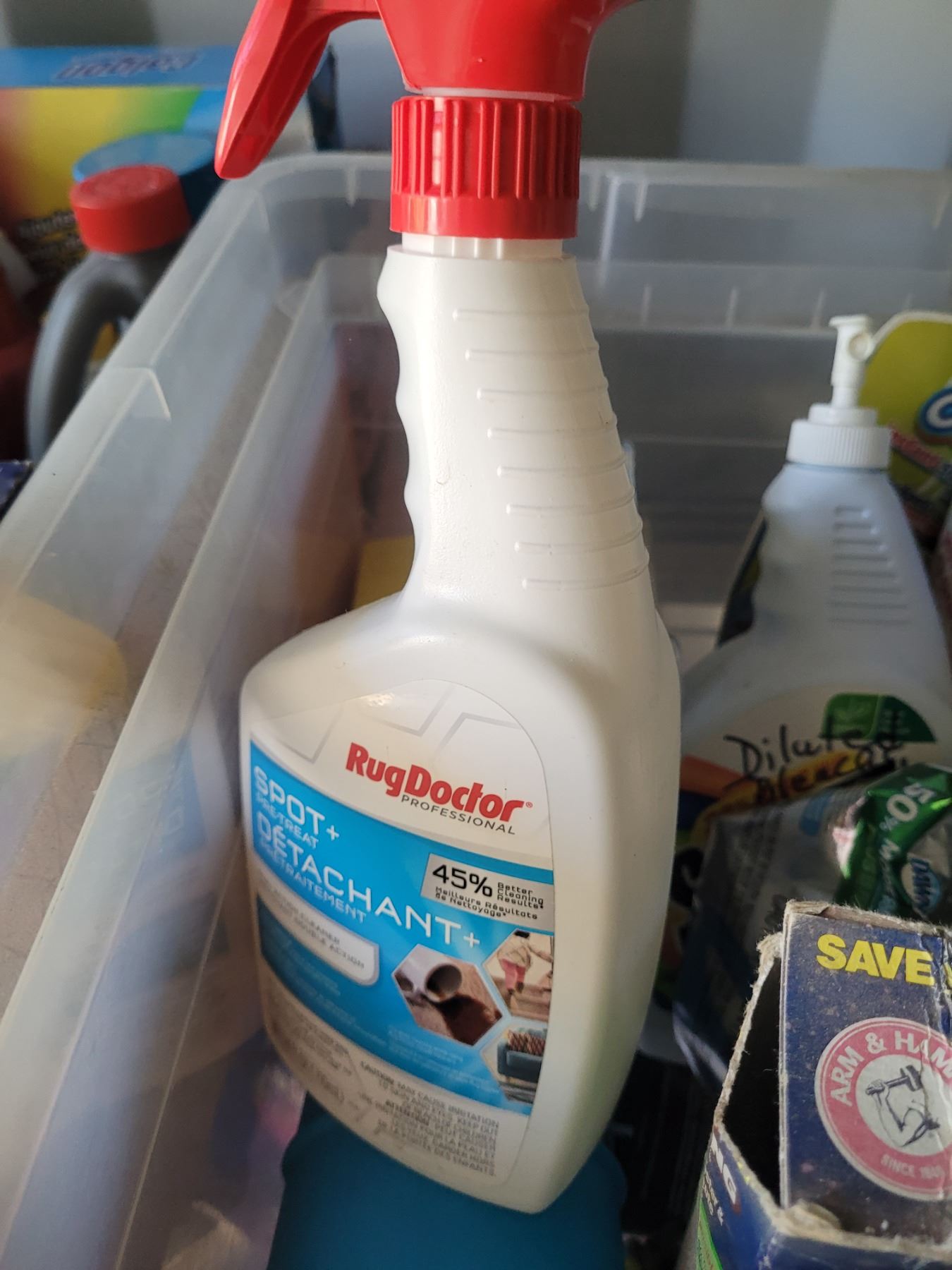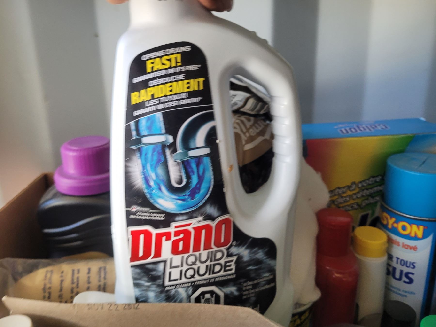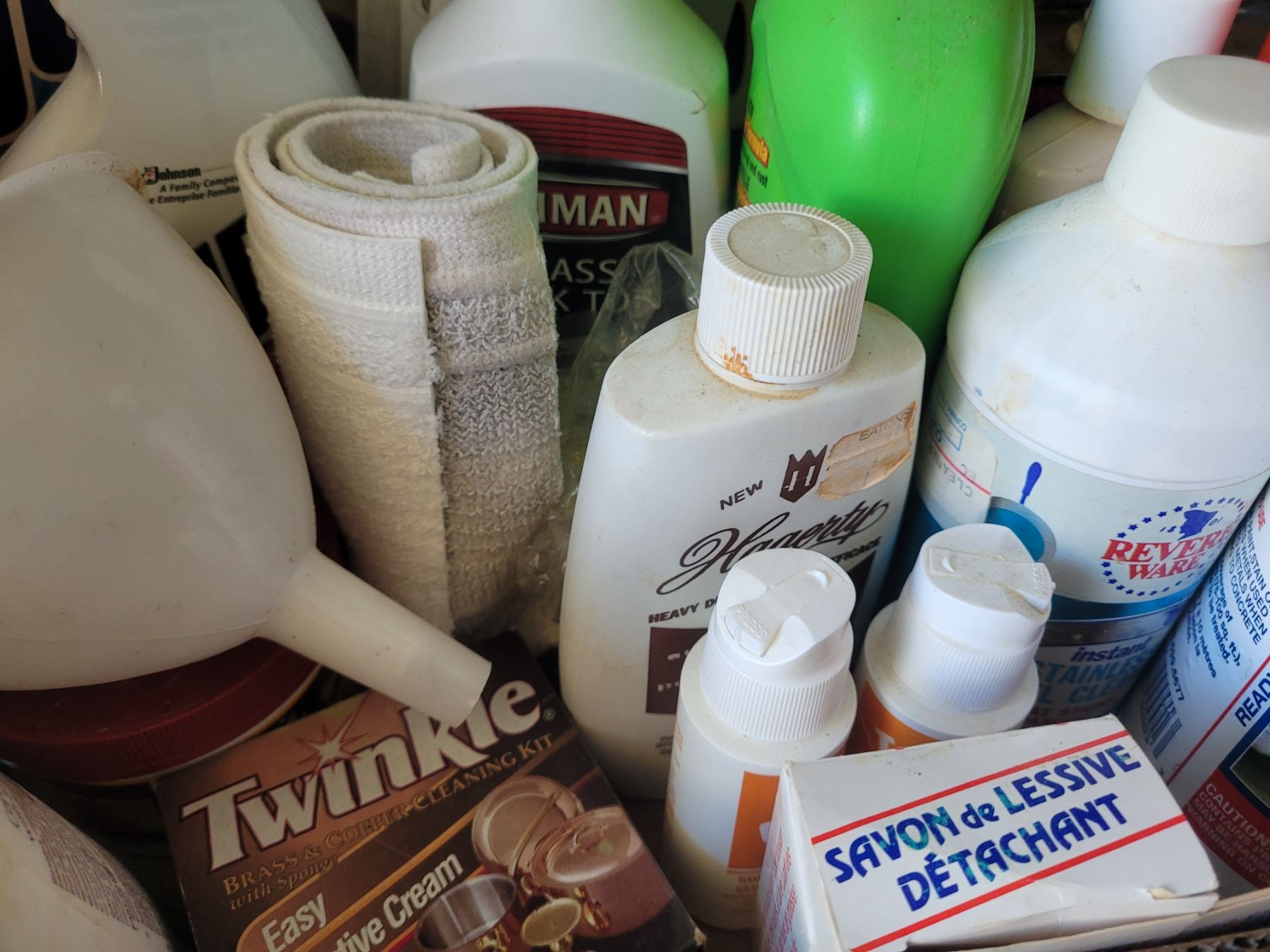 2 containers of cleaning supplies, some are full. Pickup at 10 am