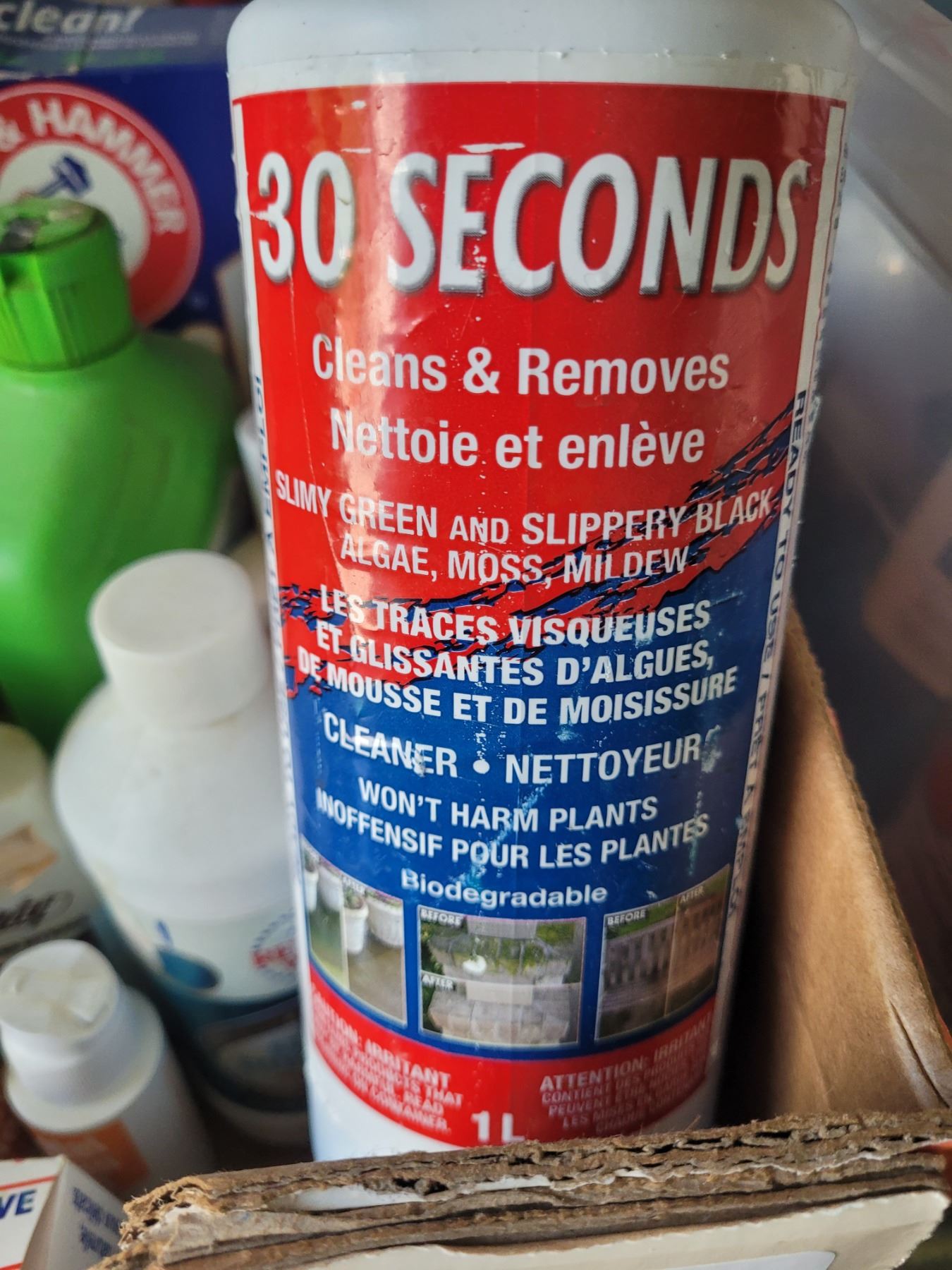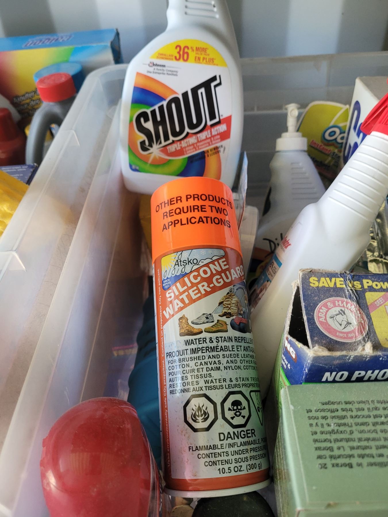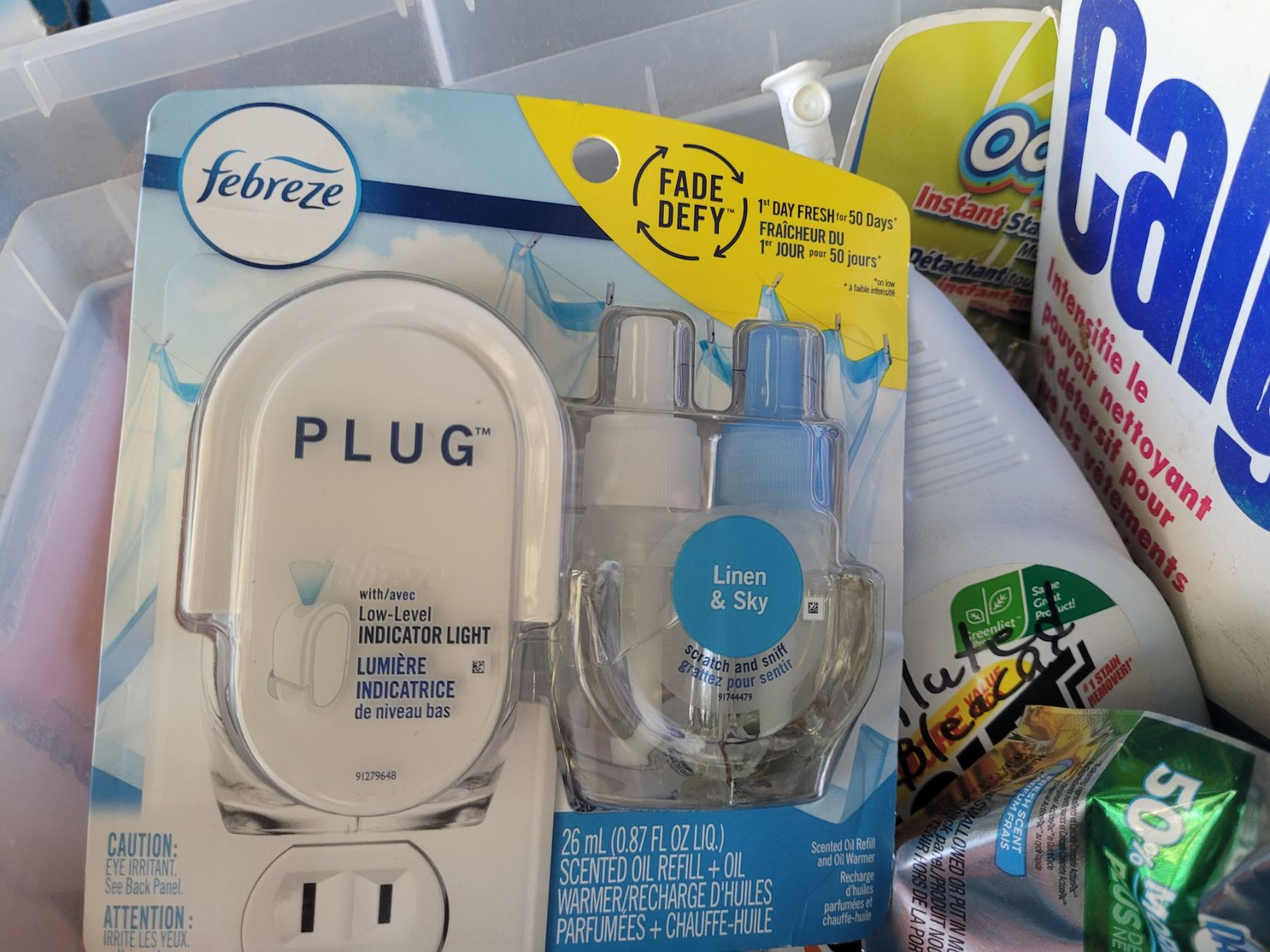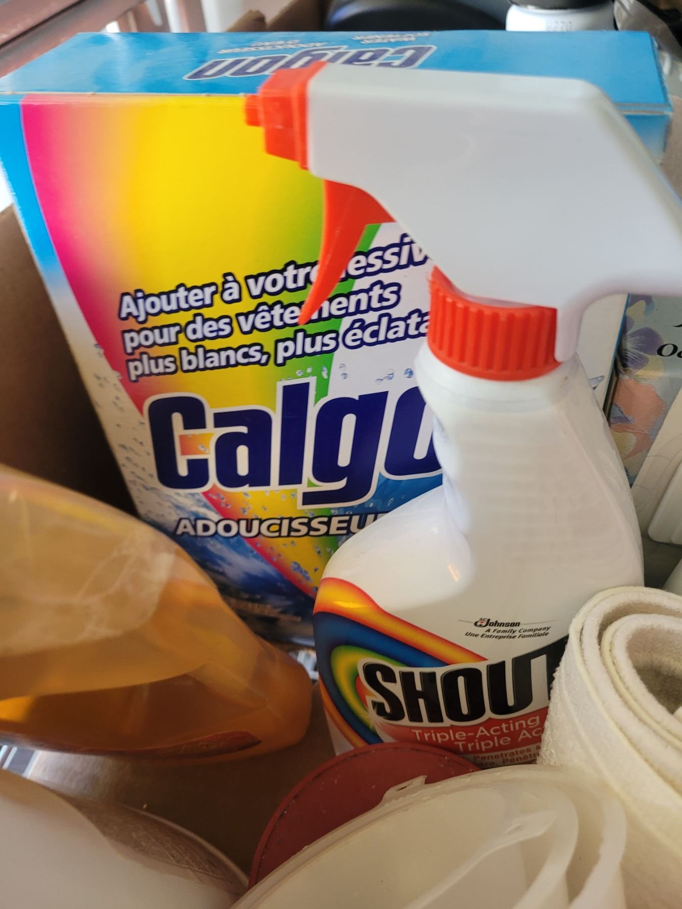 2 containers of cleaning supplies, some are full. Pickup at 10 am