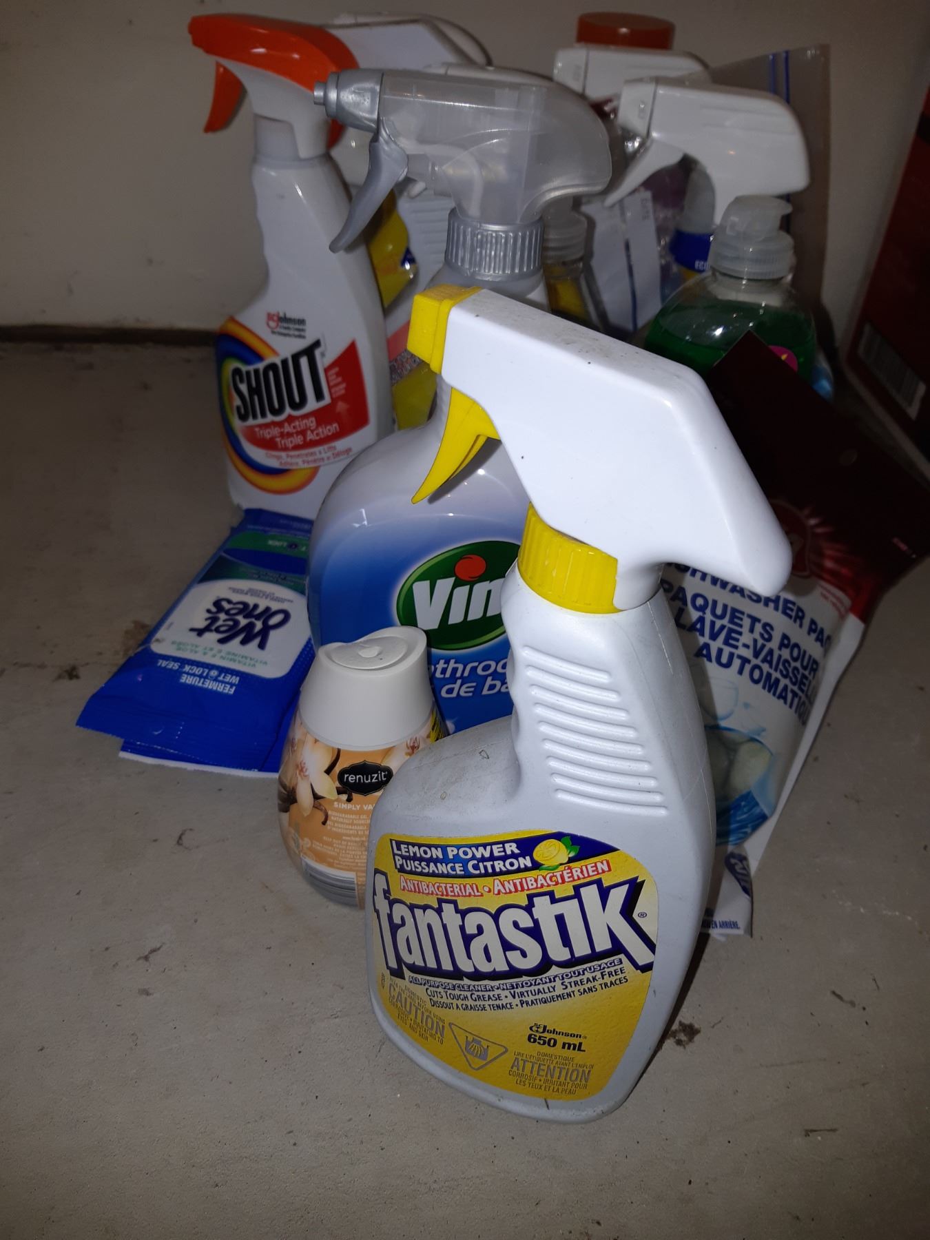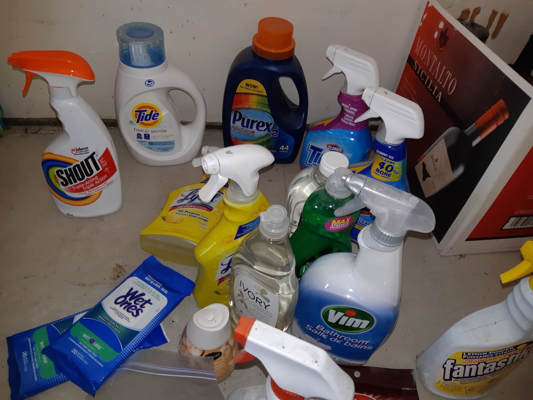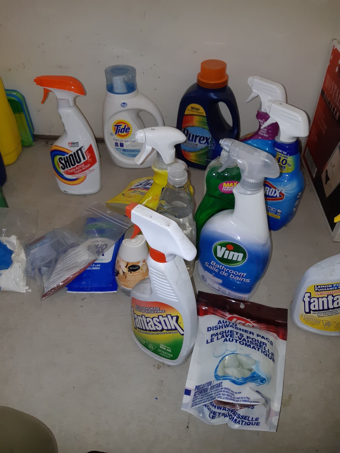 Cleaning supplies, dish, laundry, counter top, not checked for completeness, pickup 9am