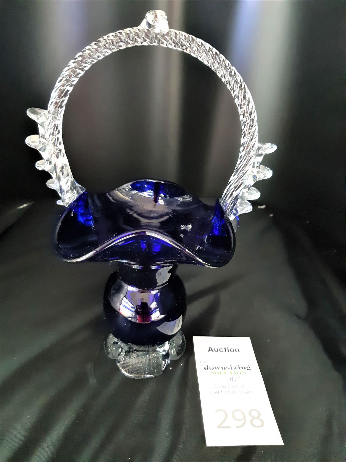 Indigo blue basket style dish with clear handle 10" Pickup at 9 am