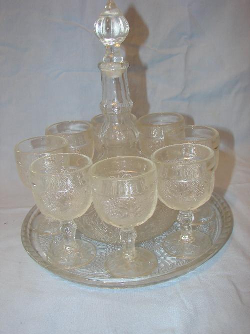 Clear sandwich glass decanter, tray & 8 goblets