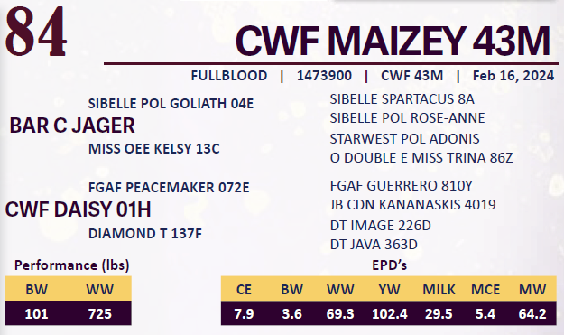 CWF MAIZEY 43M - Horned Fullblood - Exposed to CLEARWATER MIKEY 29M from April 2 - June 10. Vet confirmed caught in first cycle
