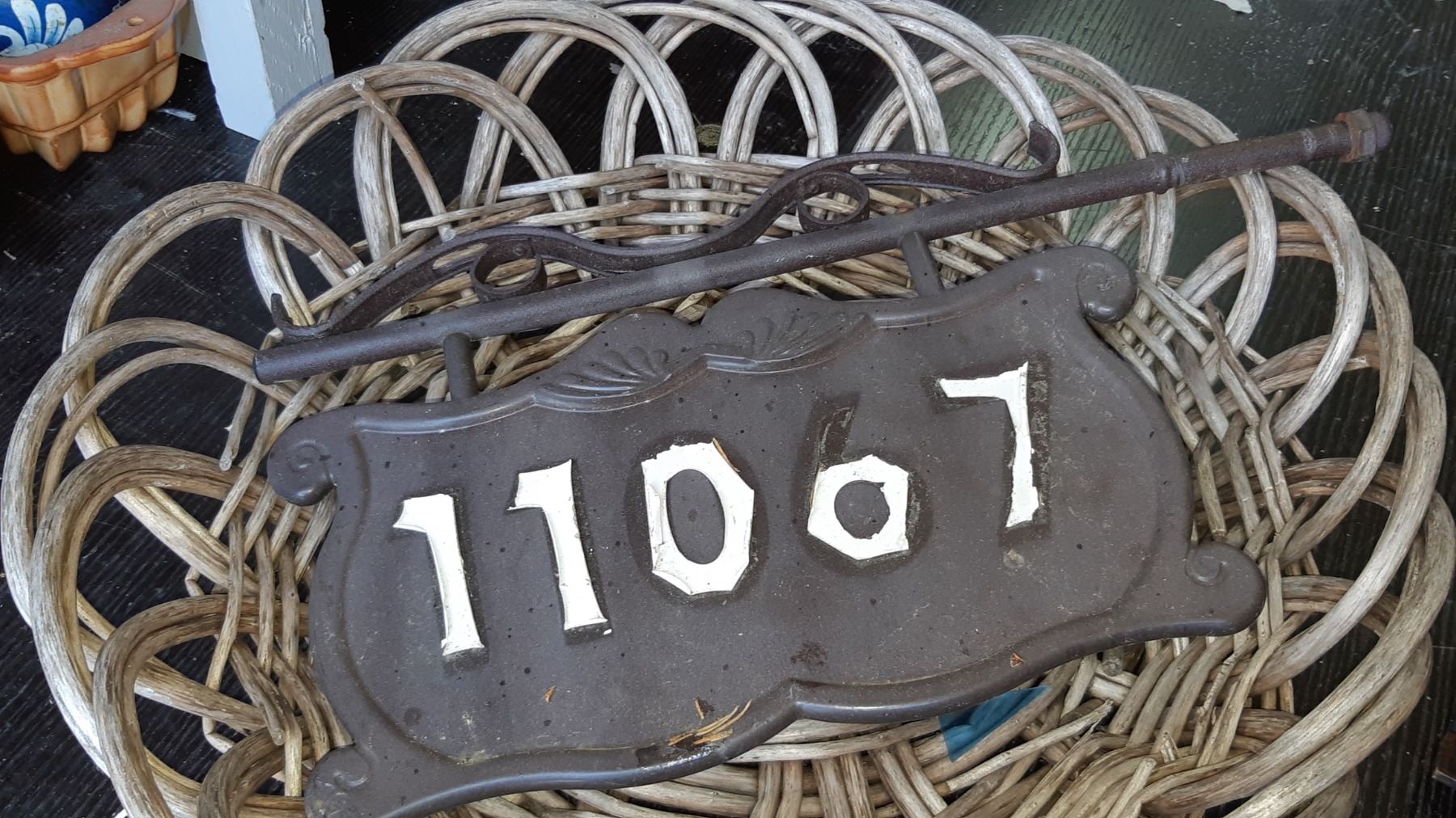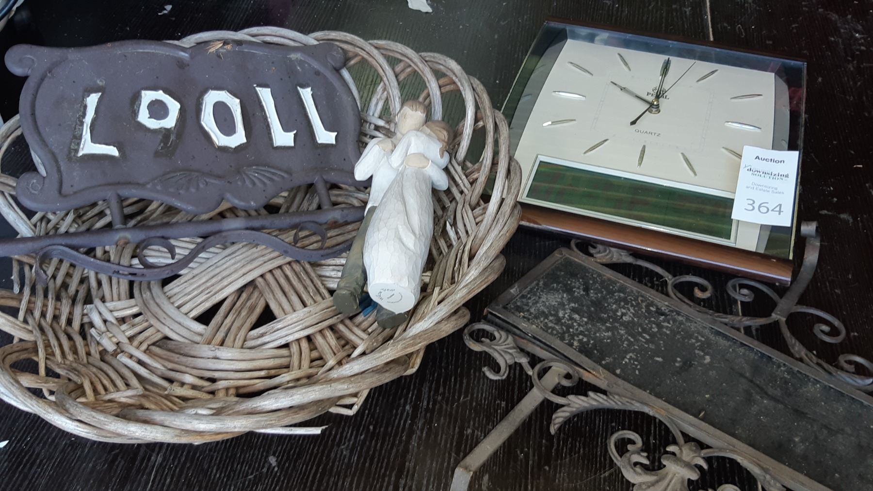 Willow Tree figurine, Pearl brand wall clock, metal sign decor, large wicker basket. Pick up 9-10