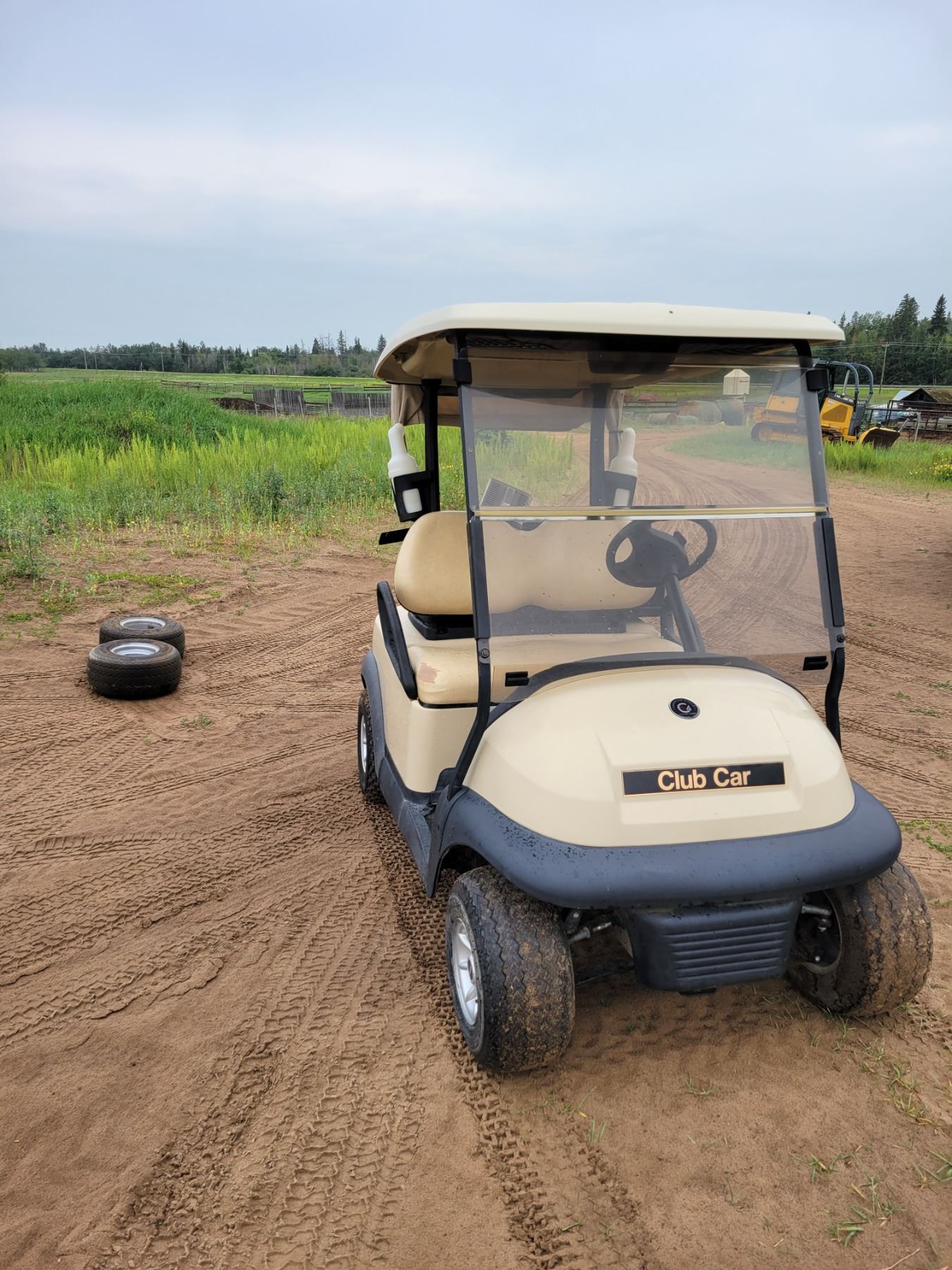 Club Car Golf cart c/w fresh batteries, windshield, charger & 2- Extra Tires, # not legible. Nice Condition.