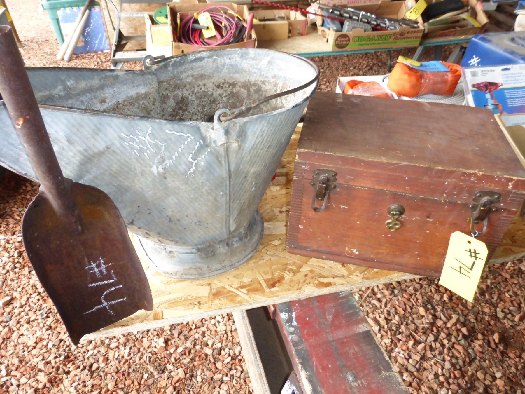 Coal pail, Shovel and Vintage 1st Aid Service Kit (No contents)