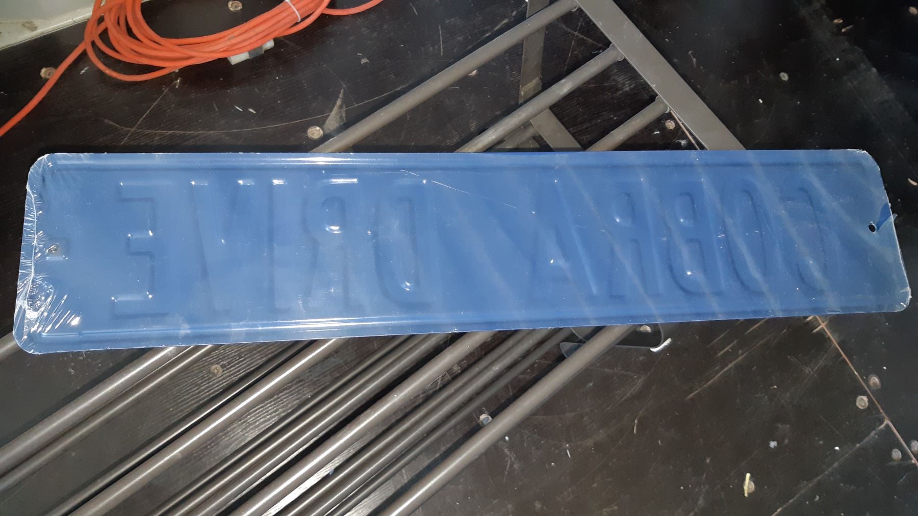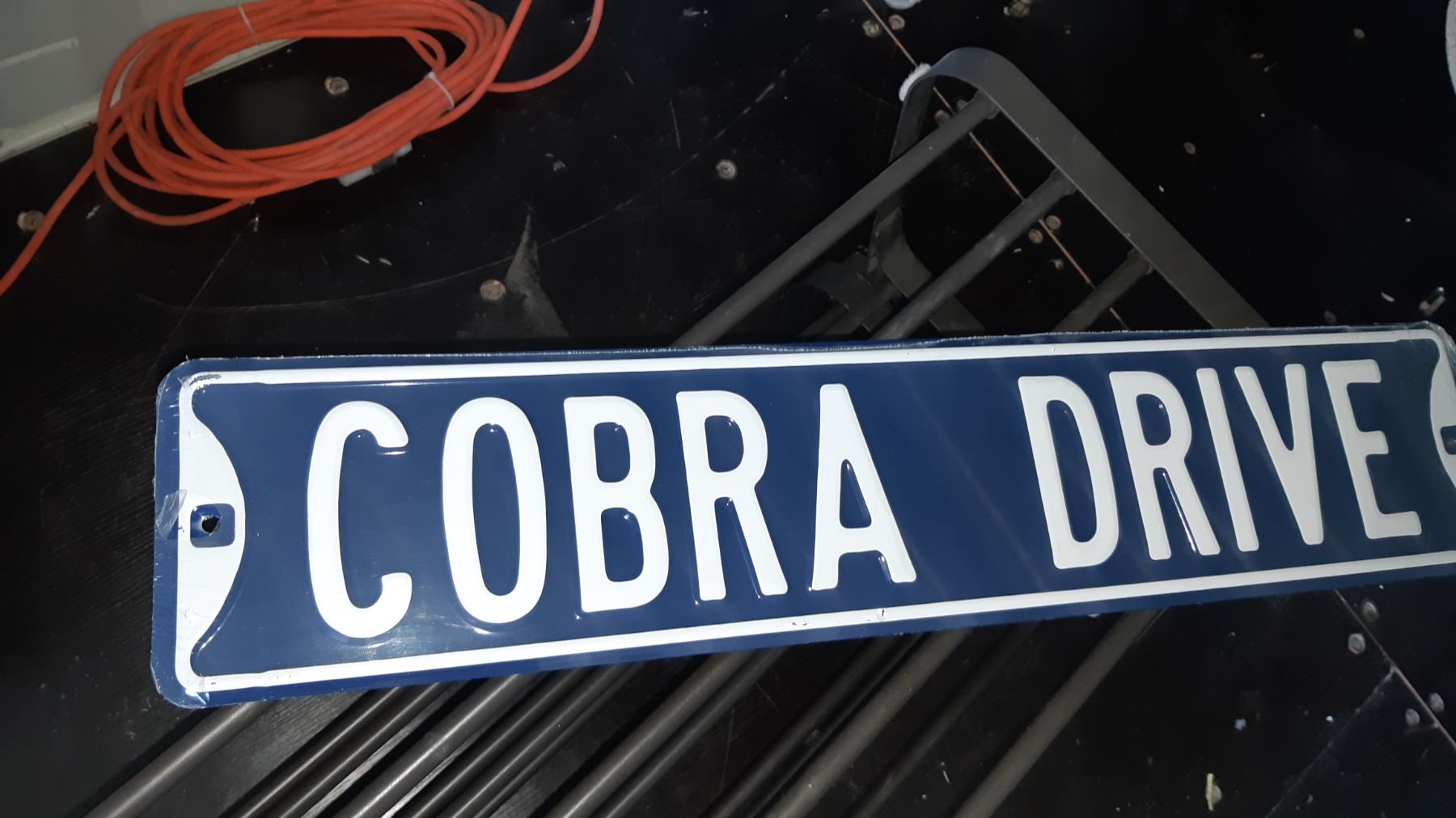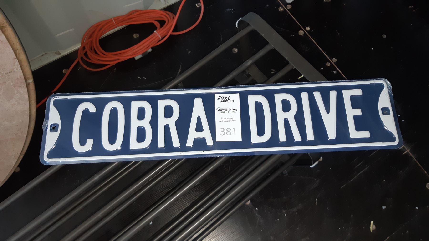 Decorative road sign depicting race car Cobra Dr. Pick up 9-10