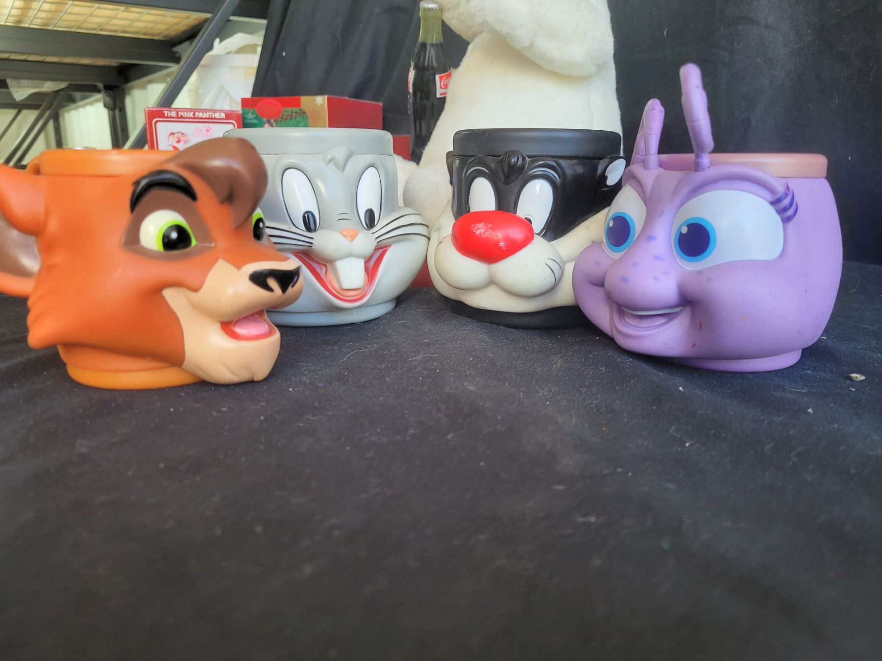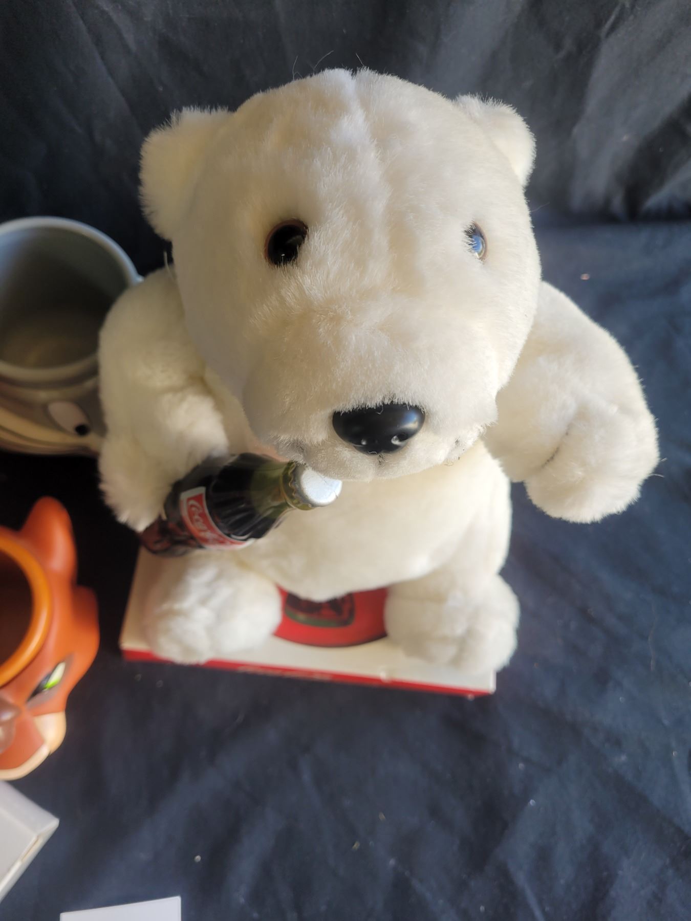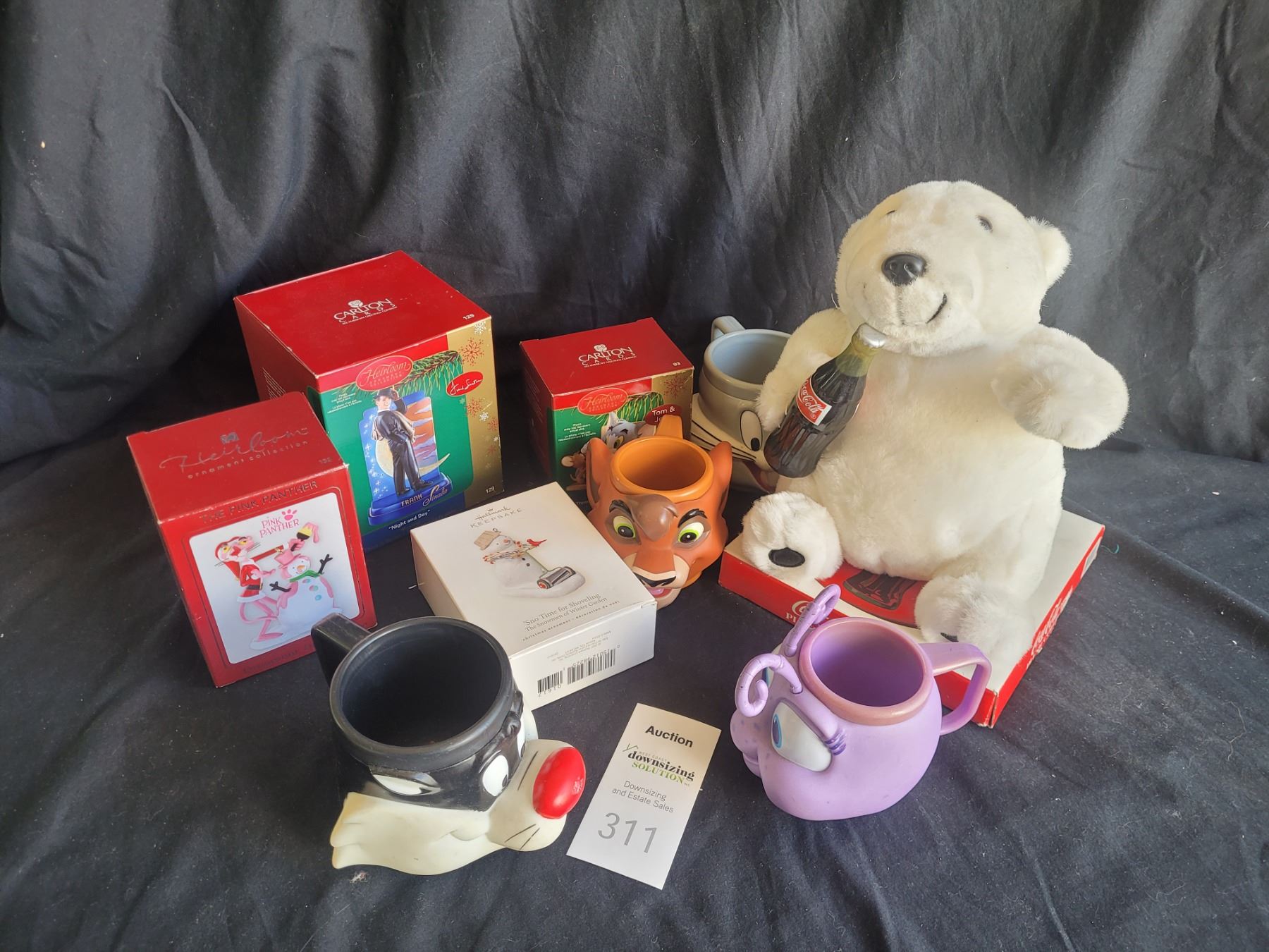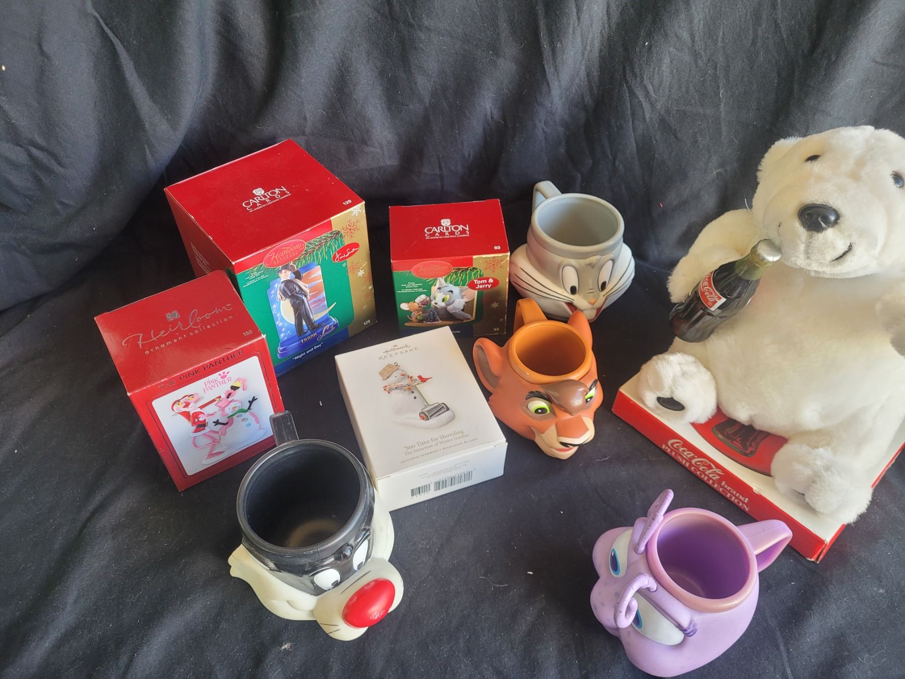 Coca Cola Bear, 4 cartoon mugs, 4 Christmas Ornaments Pickup at 9 am