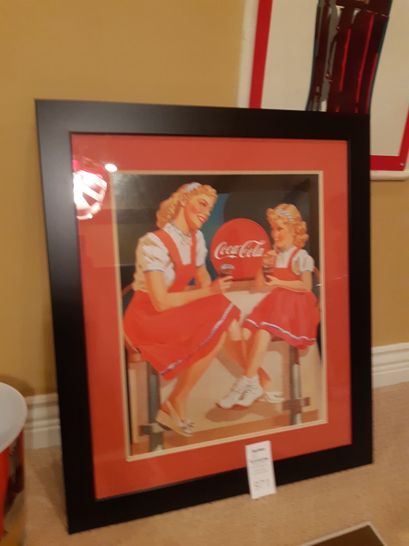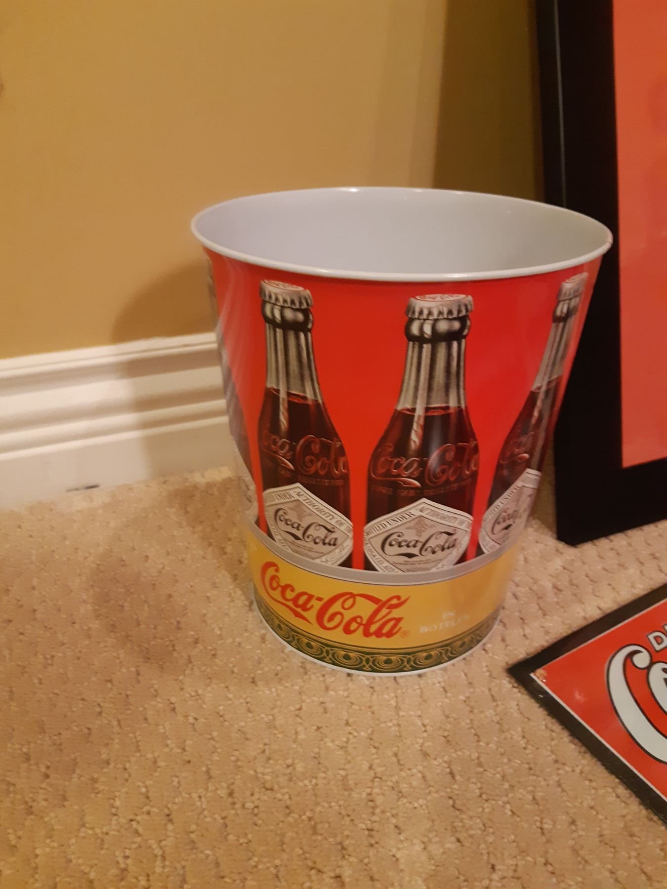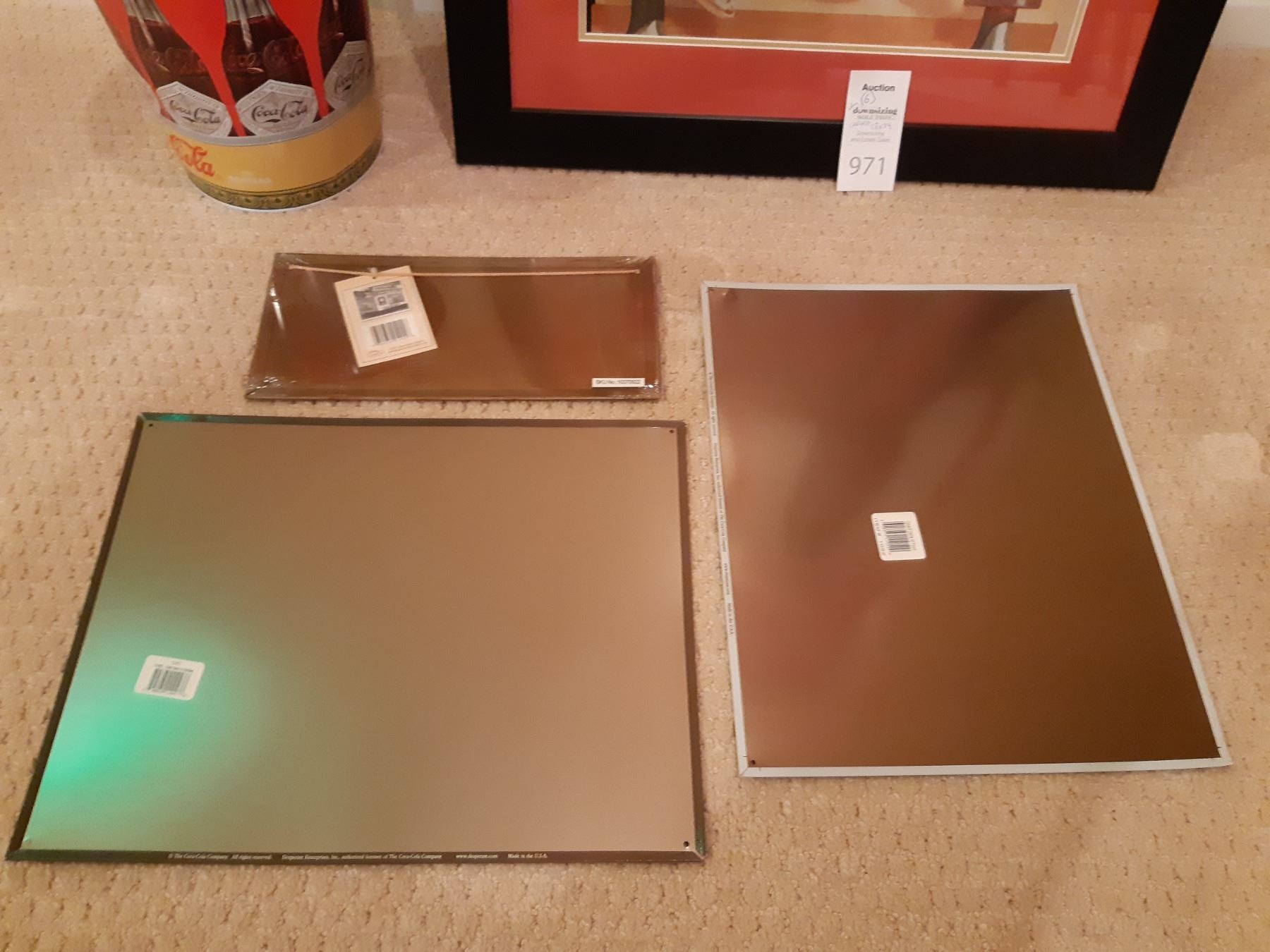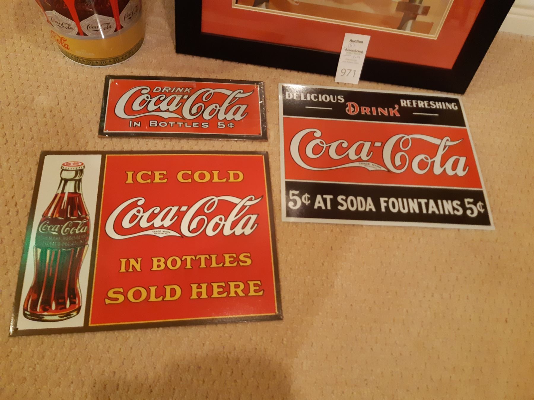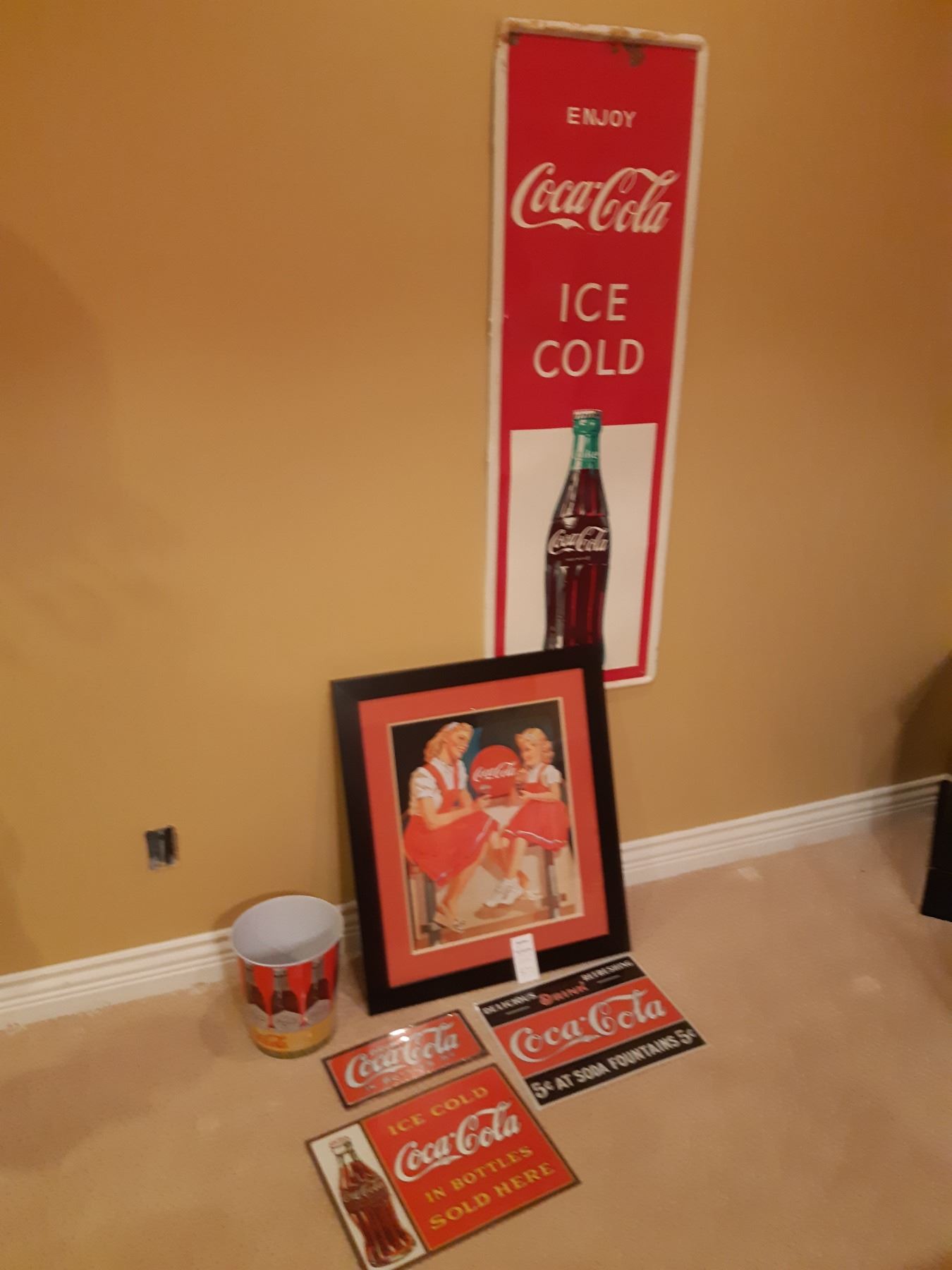 Long metal sign 18x54, framed poster, bin, 3 smaller metal signs. Pickup at 9 am