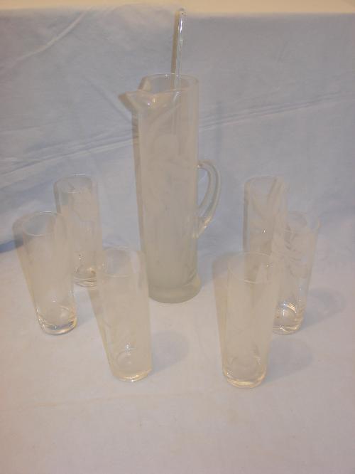 Cocktail Set, glass pitcher w/stir stick, 6 glasses