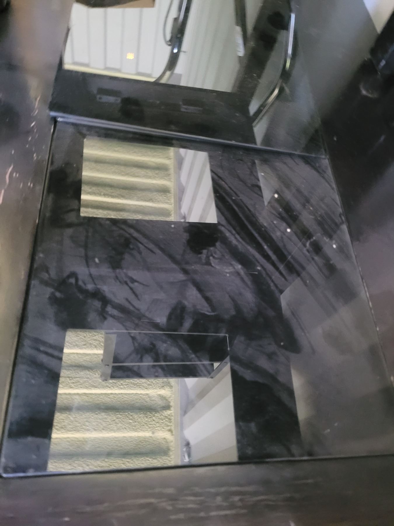 Coffee table with smoked glass insert 47x24x18 and two matching end tables with 2 pieces of smoked glass inserts. One small metal table. Note scratches. Pickup at 11 am