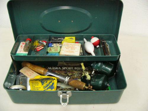 Collection of vintage fishing equipment including 2 telescoping rods new with original tag from 1954; 2 Shakespeare Push Button Wonder Cast #1774 reels; assorted antique fishing tackles (47)