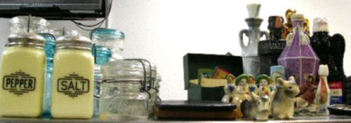 Collectors: bottles, bells, brass easel, collectors cards, collectors card album and cards with cats, dogs, etc, war ration book with stamps, How to Play Pinochle, collection of fruit jars (189)