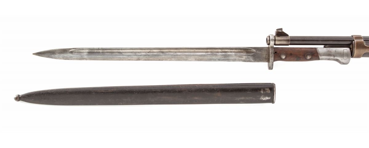 Colombian FN 24/30 Bolt Action Carbine, #823, .30-06 cal., 17-1/2'' barrel, blue finish, bright bolt, walnut stock, with leather sling, bayonet and scabbard. Condition is very good to fine as lightly import marked. Crest has been removed from chamber area. Stock with light overall marks from handling and some oil darkening. Crisp action, fine bore. Est.: $250-$400. (C&R)