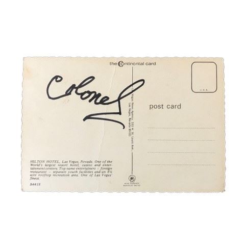 Original, hand signed postcard of the Las Vegas Hilton from Colonel Tom Parker (1909-1997) who was the manager of Elvis Presley from 1955 to the day he died in 1977. This comes direct from the collection of Aaron Presley and was given to him directly from the Colonel. This is the first time anything from his collection has been made available to the public.