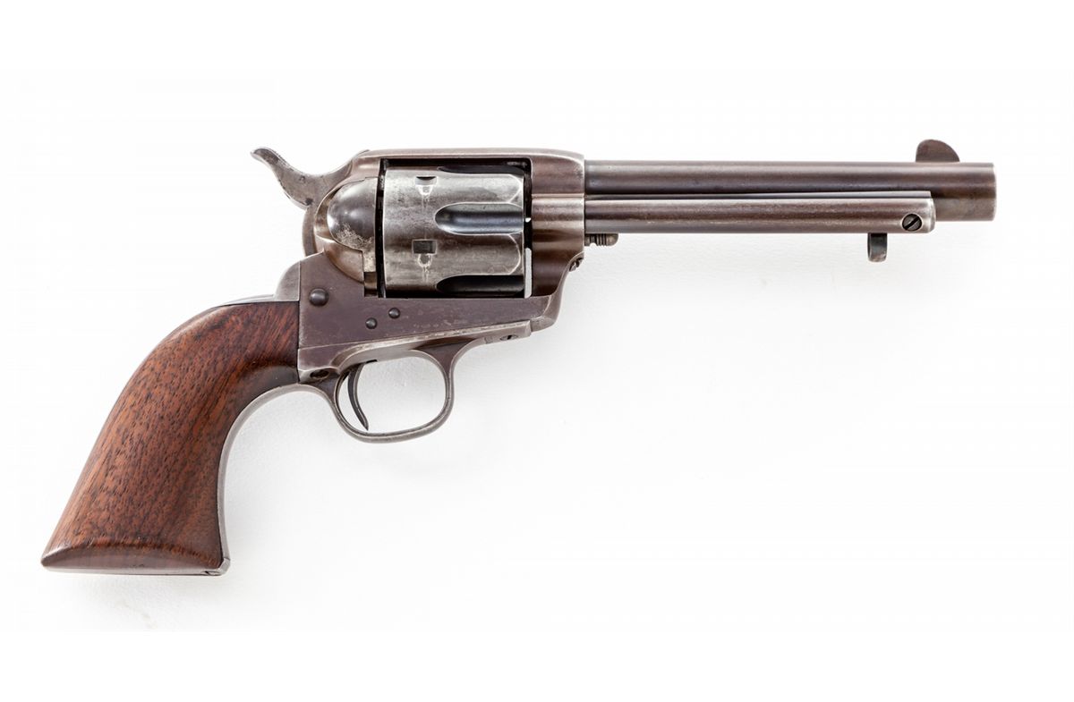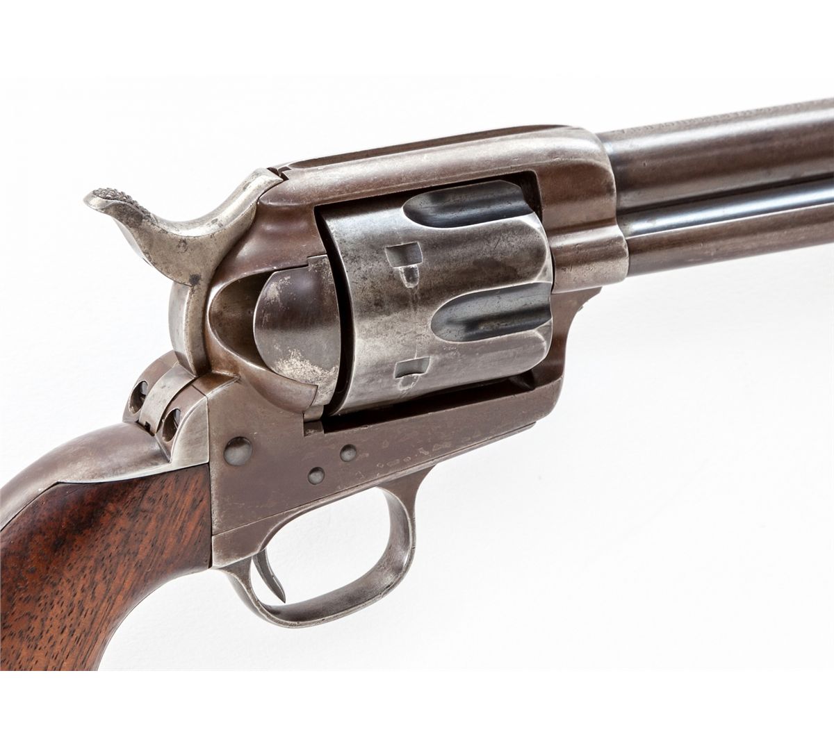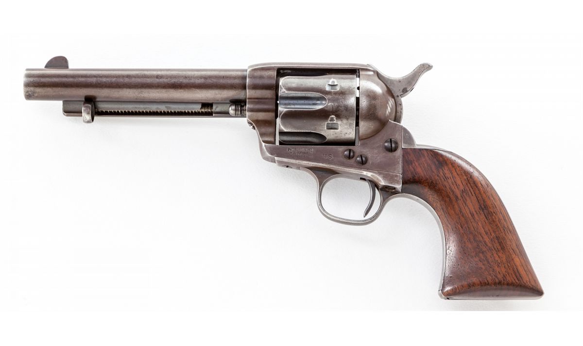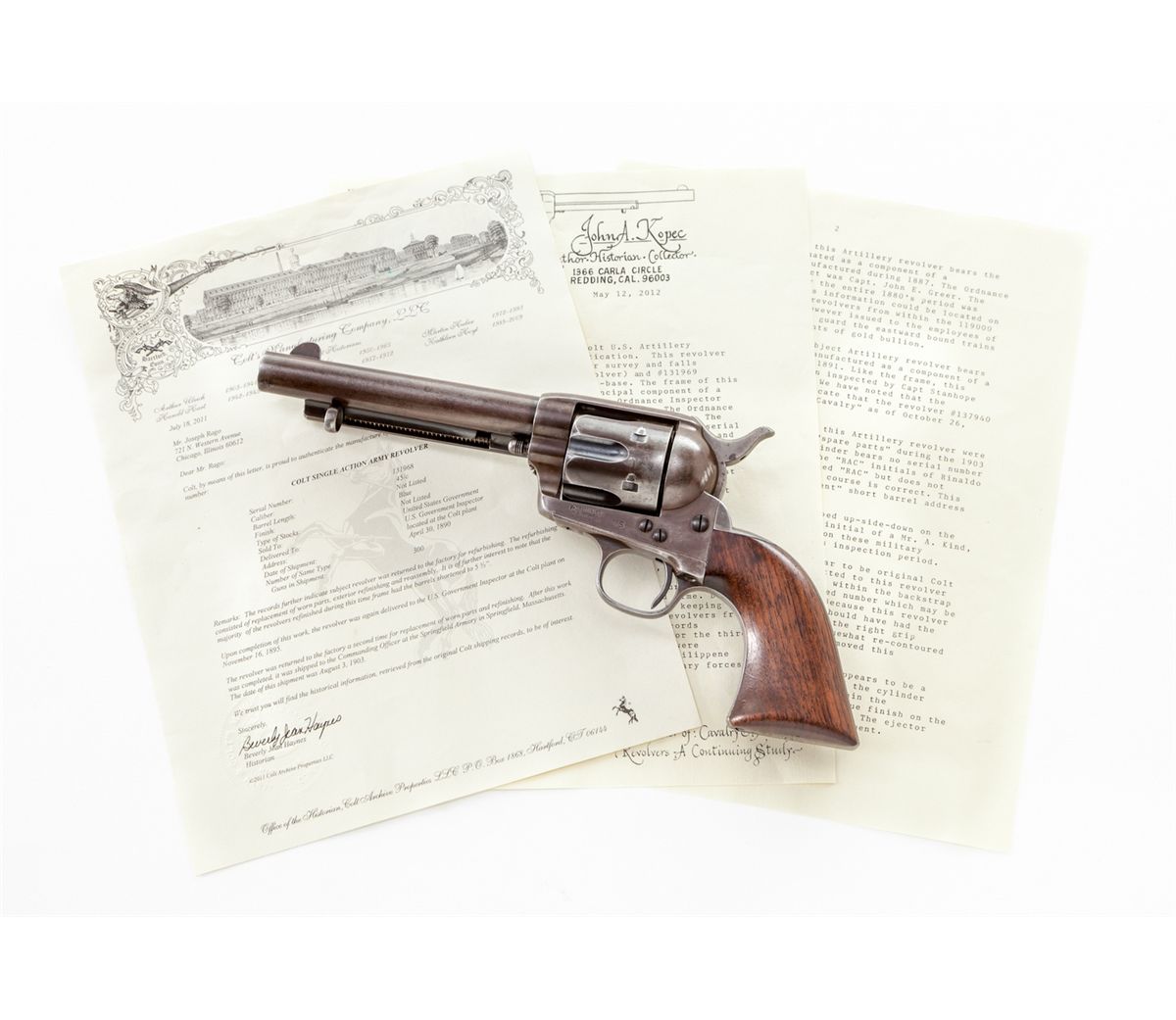 Colt Artillery Model Single Action Revolver, #131968, .45 Colt cal., 5-1/2'' barrel, blue and case hardened finish, U.S. marked frame, cartouched walnut grips, with mixed parts, having twice been returned to the Colt Factory, as per factory letter. Originally shipped April 30, 1890, and returned to the Colt Factory Nov. 16, 1895, for conversion to Artillery Model. The revolver was later returned to the factory Aug. 3, 1903, and was then shipped to the Commanding Officer of the Springfield Armory. According to the Kopec letter, most of these revolvers were destined to be issued to our troops during the Philippine Insurrection, with yet others issued to the Philippine Constabulary forces. Barrel and cylinder are both unnumbered and were installed during the 1903 refurbishment. Rear of the cylinder, barrel and grips are marked ''RAC'' (Rinaldo A. Carr) as the primary inspector during the 1903 period. Condition is very good with light general overall toning to blue. Cylinder has thinned to approx. 60% with good solid color in flutes. Grips with general even smoothing. Action is crisp, bore is fine. Est.: $5,000-$7,500. (Antique)