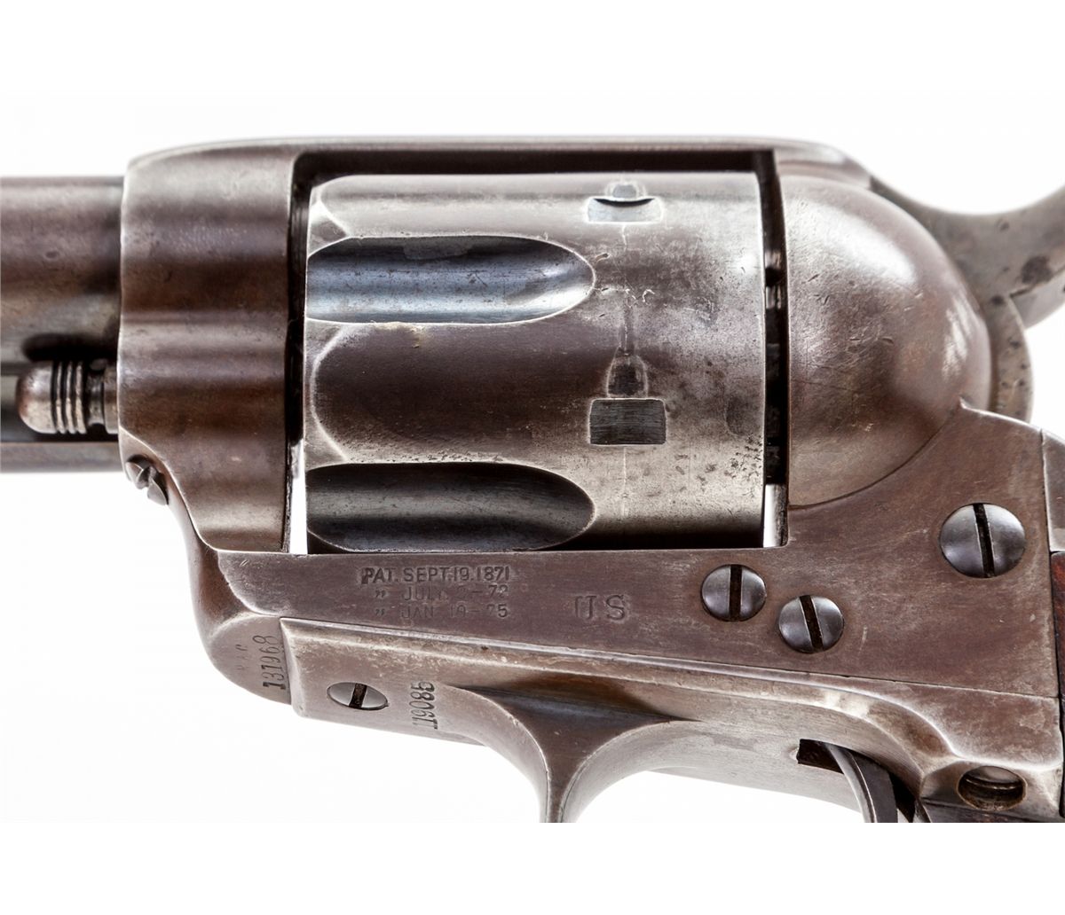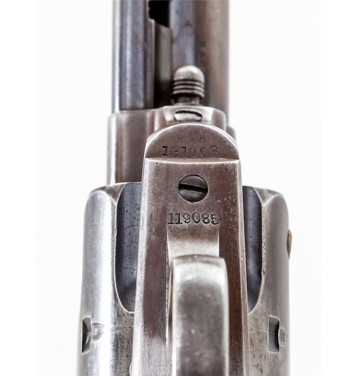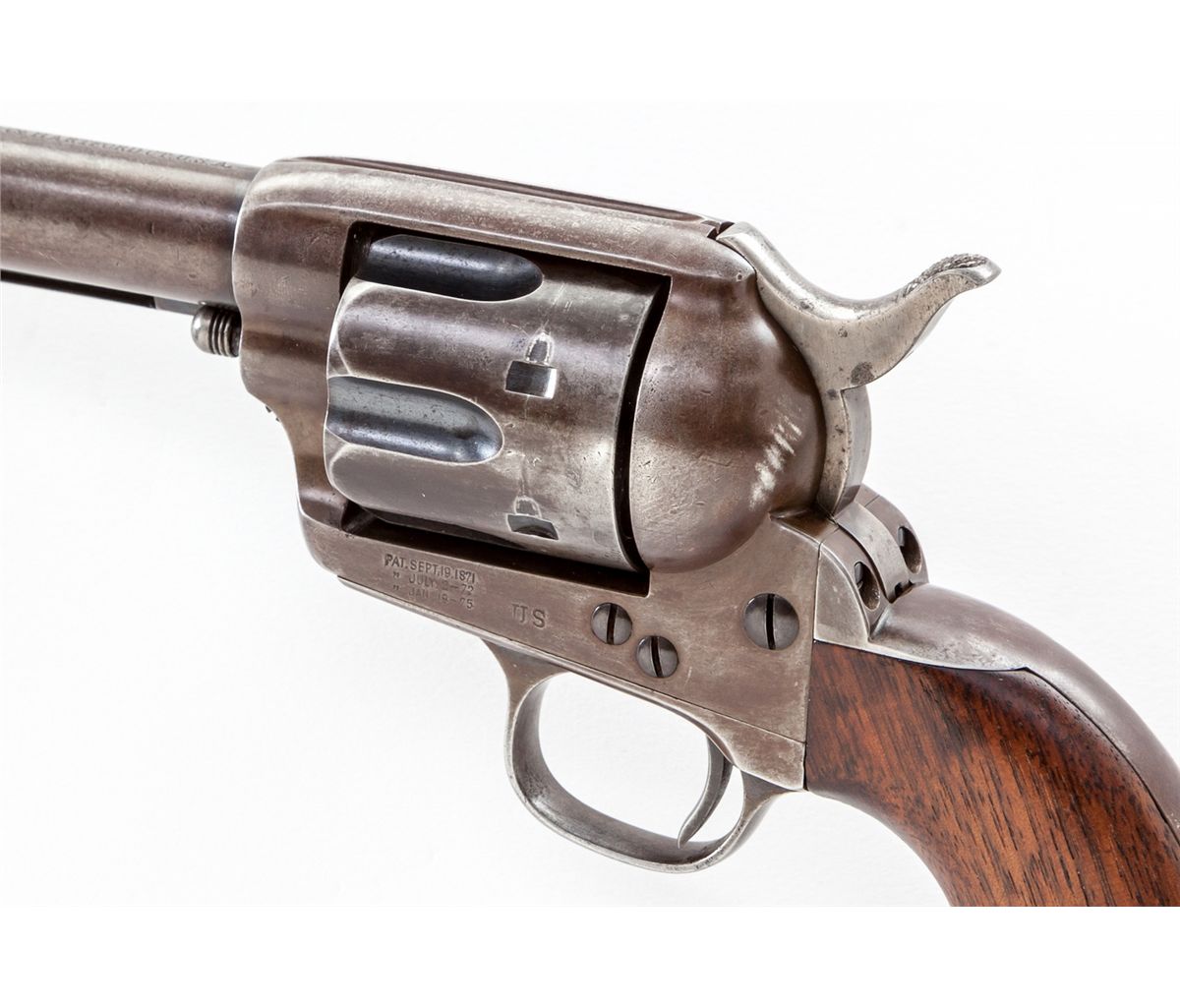 Colt Artillery Model Single Action Revolver, #131968, .45 Colt cal., 5-1/2'' barrel, blue and case hardened finish, U.S. marked frame, cartouched walnut grips, with mixed parts, having twice been returned to the Colt Factory, as per factory letter. Originally shipped April 30, 1890, and returned to the Colt Factory Nov. 16, 1895, for conversion to Artillery Model. The revolver was later returned to the factory Aug. 3, 1903, and was then shipped to the Commanding Officer of the Springfield Armory. According to the Kopec letter, most of these revolvers were destined to be issued to our troops during the Philippine Insurrection, with yet others issued to the Philippine Constabulary forces. Barrel and cylinder are both unnumbered and were installed during the 1903 refurbishment. Rear of the cylinder, barrel and grips are marked ''RAC'' (Rinaldo A. Carr) as the primary inspector during the 1903 period. Condition is very good with light general overall toning to blue. Cylinder has thinned to approx. 60% with good solid color in flutes. Grips with general even smoothing. Action is crisp, bore is fine. Est.: $5,000-$7,500. (Antique)
