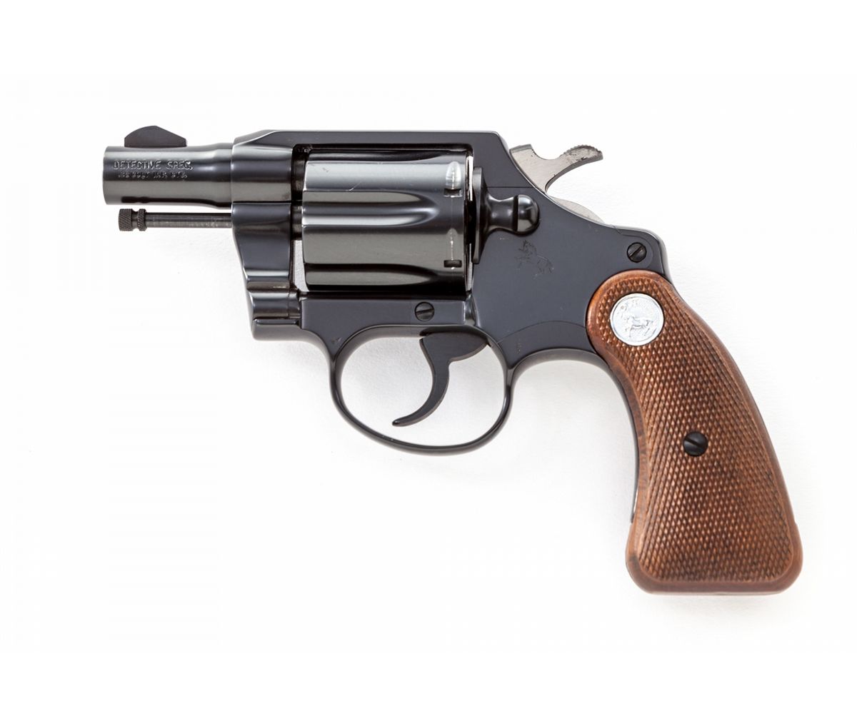 Colt Detective Special Double Action Revolver, #M11474, .32 Colt cal., 2'' barrel, blue finish, factory checkered walnut grips with Colt medallions. Dating from 1975. Condition is excellent showing only minor carbon spotting to bright sides of hammer, minor surface scratches, and very light edgewear. Scarce in .32 cal. Est.: $600-$800. (Modern) (Ernest A. Bryant III estate)