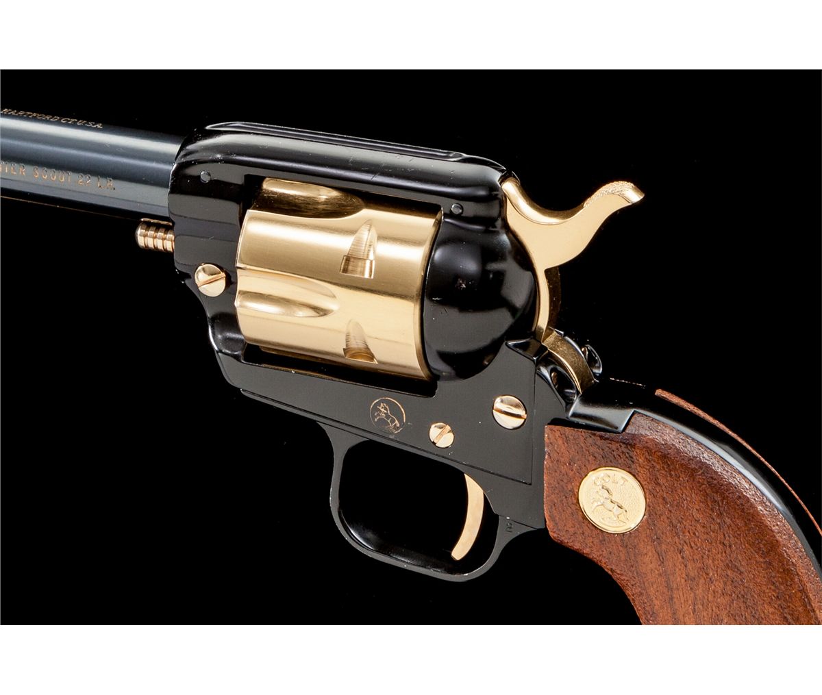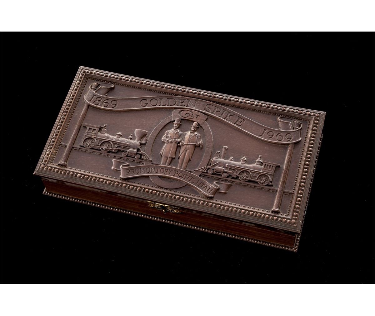 Colt Golden Spike Commemorative Single Action Revolver, 1869-1969, #8117GS, .22 LR cal., 6'' barrel, blue and gold finish, hardwood grips with gold Colt medallions, in presentation display case with ''golden spike''. Condition is excellent, appearing as new. Est.: $750-$1,000. (Modern)