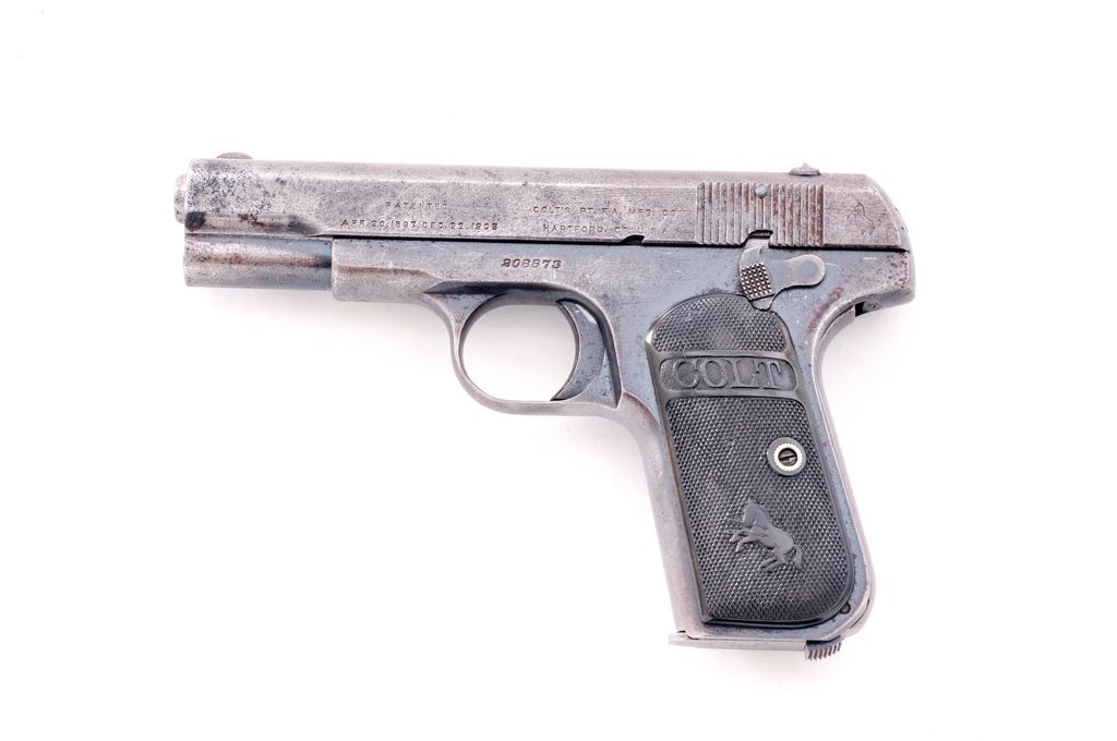 Colt Model 1903 Type III Pocket Hammerless Semi-Automatic Pistol, #208873, .32 ACP cal., 4'' barrel, blue finish, hard rubber Colt grips, standard fixed sights, with one factory magazine marked on base ''CAL. 32 / COLT''. Mfg'd 1916. Metal rates as fair to good with approx. 20% blue finish, with some areas of darker spotting and light pitting. Grips are good with a few moderate flat spots to the checks; ''Rampant Colt'' and ''Colt'' lettering are both clear and well defined. Action is nice and smooth; bore with some light frosting in the grooves and rates good overall. Est.: $200-$400. (C&R/PPT)