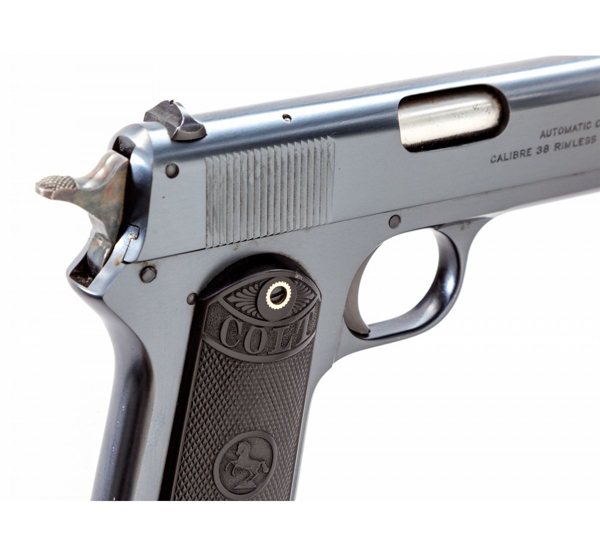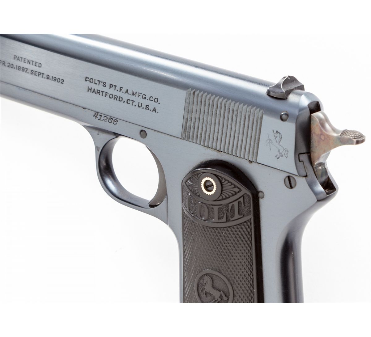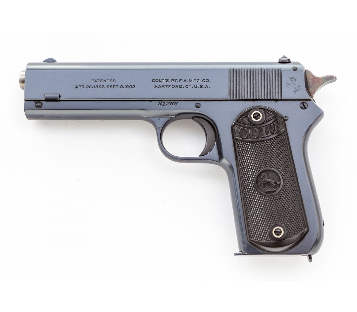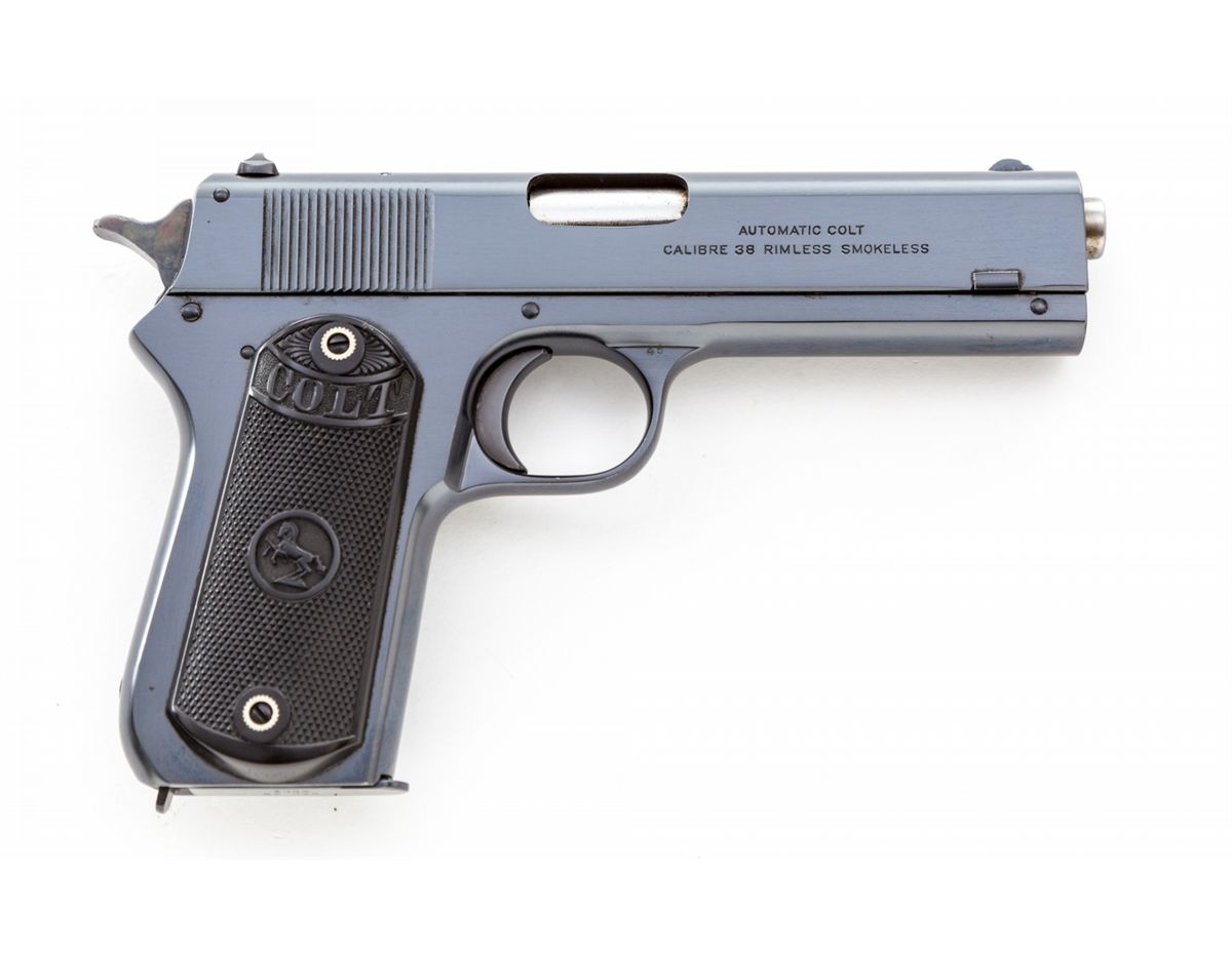 Colt Model 1903 Pocket Hammer Semi-Automatic Pistol, #41266, .38 ACP cal., 4-1/2'' barrel, blue finish, factory checkered hard rubber grips, with original magazine. As shipped to Simmons Hardware, Sioux City, IA, on Jan. 30, 1924, with factory letter verifying all features. Condition is excellent retaining approx. 99%+ original finish, vivid case hardened hammer, and crisp grips, with internal (possibly factory) grease preservative. Would only improve with a box. Est.: $2,500-$4,000. (C&R)