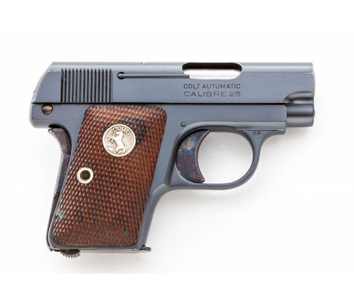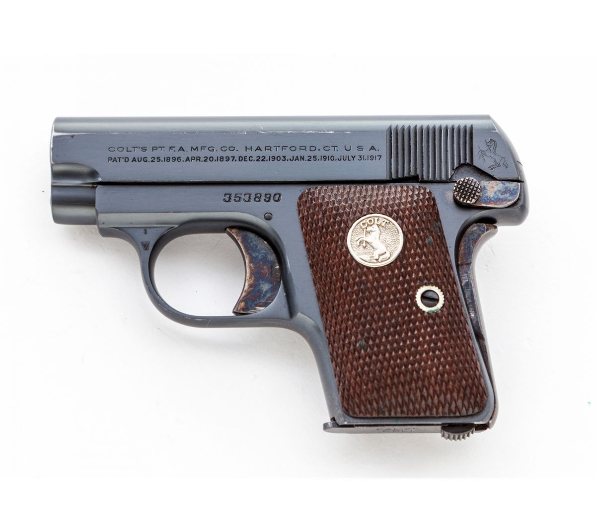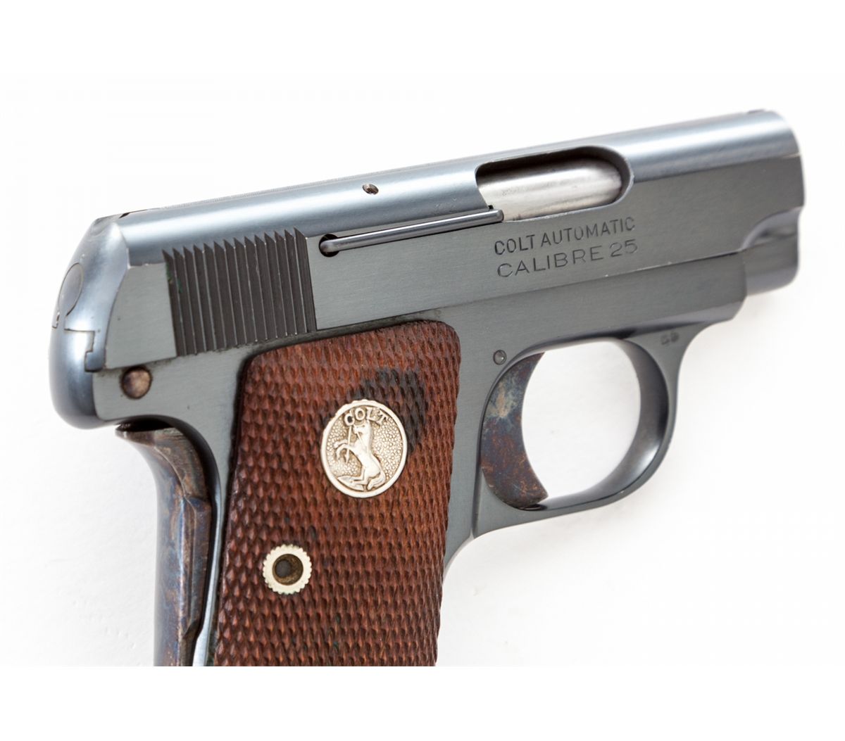 Colt Model 1908 Vest Pocket Semi-Automatic Pistol, #353890, .25 ACP cal., 2'' barrel, blue finish, factory checkered walnut grips with medallions. Mfg'd 1926. Condition is excellent retaining approx. 97% original blue with minor thinning to top left edge of slide. Grips with minor discoloration to right panel. Action is crisp, bore is bright. Est.: $500-$750. (C&R) (Ernest A. Bryant III estate)