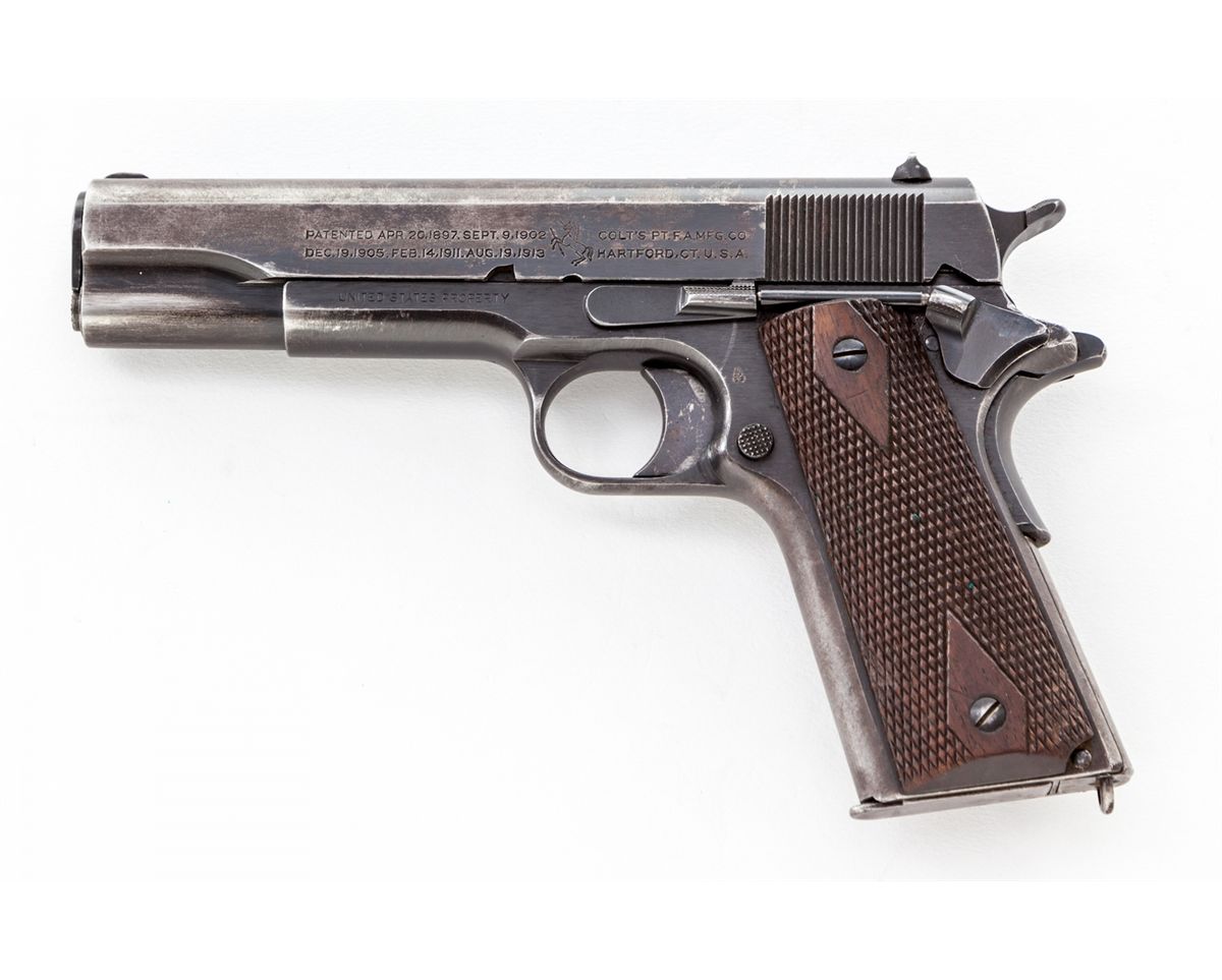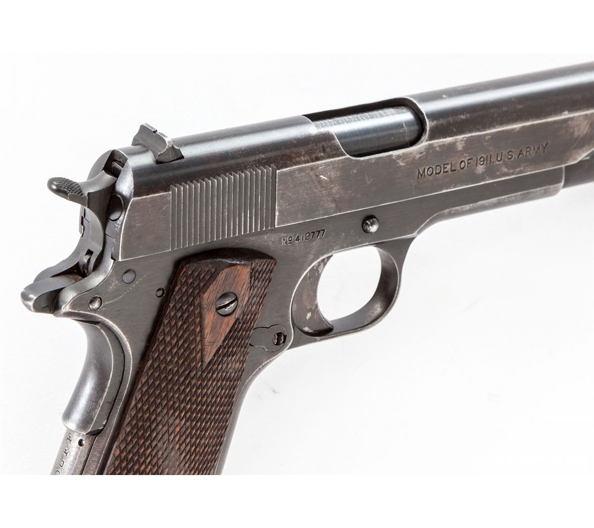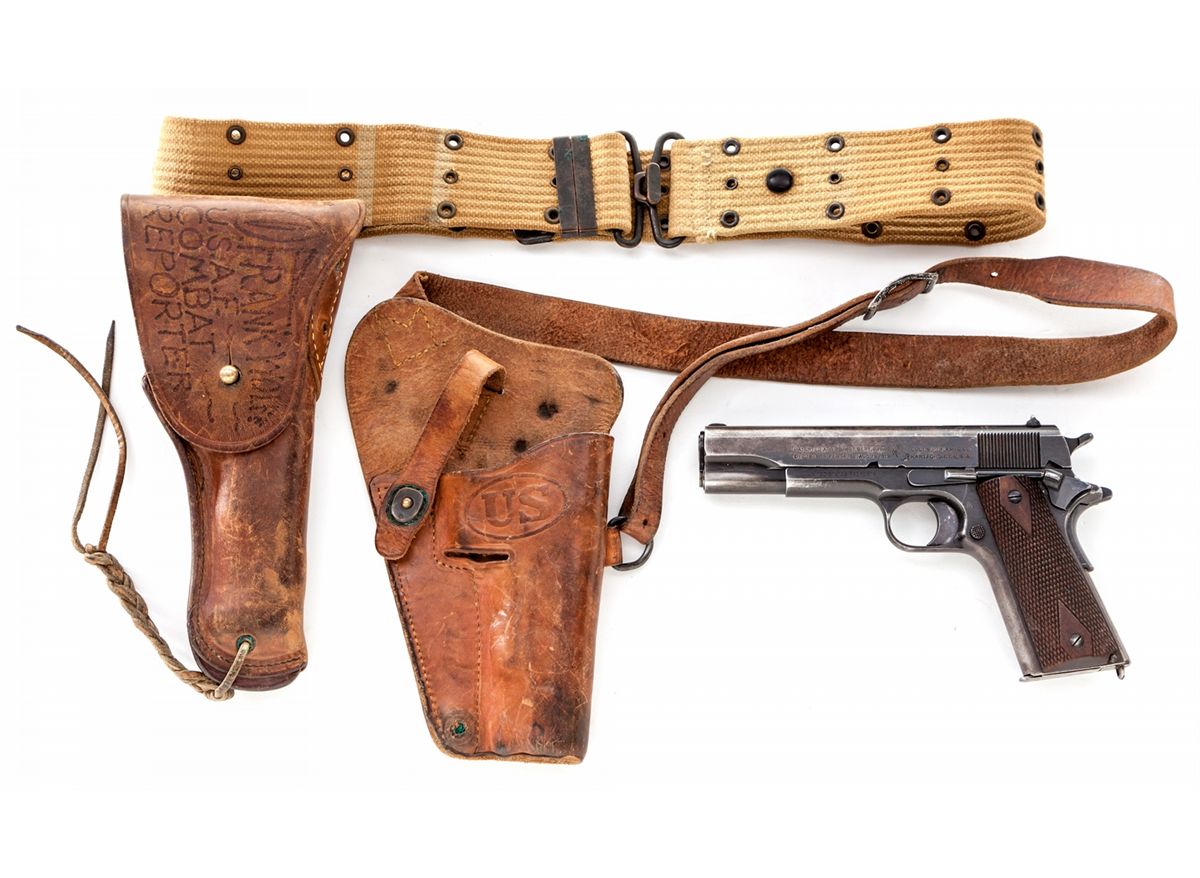 Colt Model 1911 Semi-Automatic Pistol, #412777, .45 ACP cal., 5'' barrel, blue finish, checkered large diamond walnut grips, in GI belt holster with additional Boyt/43 marked shoulder holster. All belonging to O. Frank Wolfe. Capt. Wolfe was in the Army Air Corps during WWII and later during Korea was assigned the job of being a U.S. Air Force combat reporter. Flap of holster is marked ''O. Frank Wolfe, USAF Combat Reporter''. Mainspring housing of the pistol is stamped ''O. Frank Wolfe/O 310342''. Condition is very good retaining approx. 85% thinning and flaking blue. Barrel is a WWII Colt replacement type. Left grip panel is crisp; right grip panel with moderate flattening. Action is crisp, bore is very good. Holster with moderate general scuffing and missing several rivets from back portion. Shoulder holster is missing its belt loop. Est.: $1,200-$1,800. (C&R)