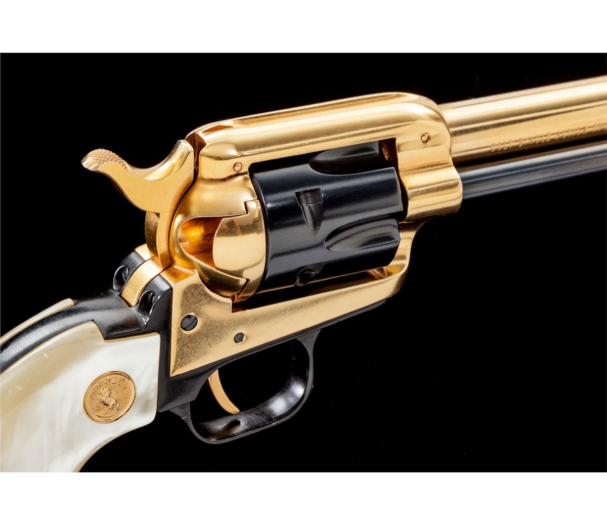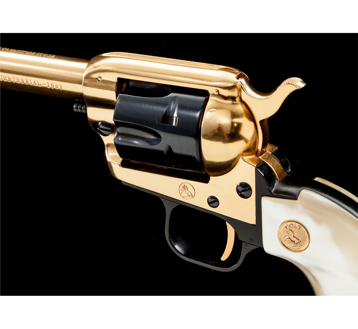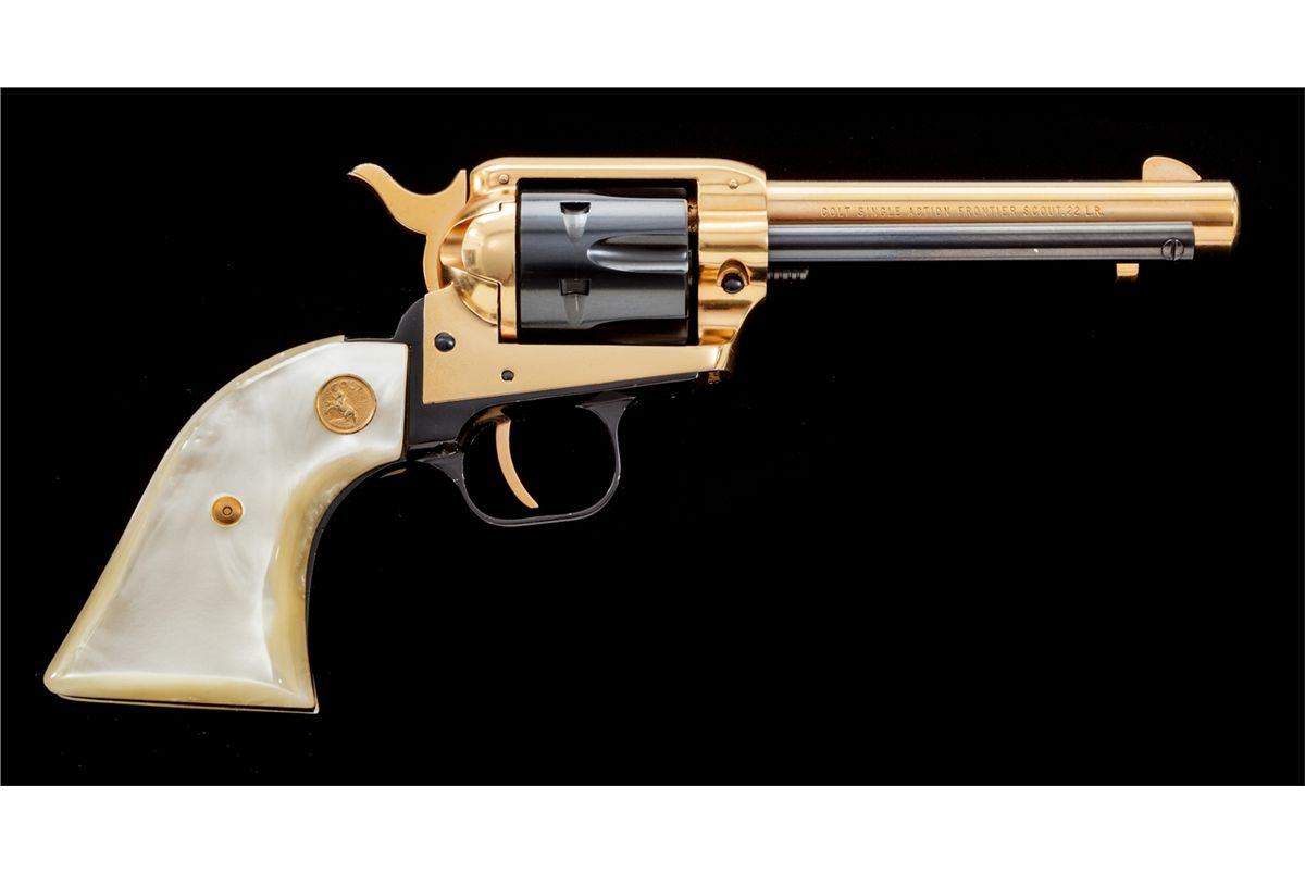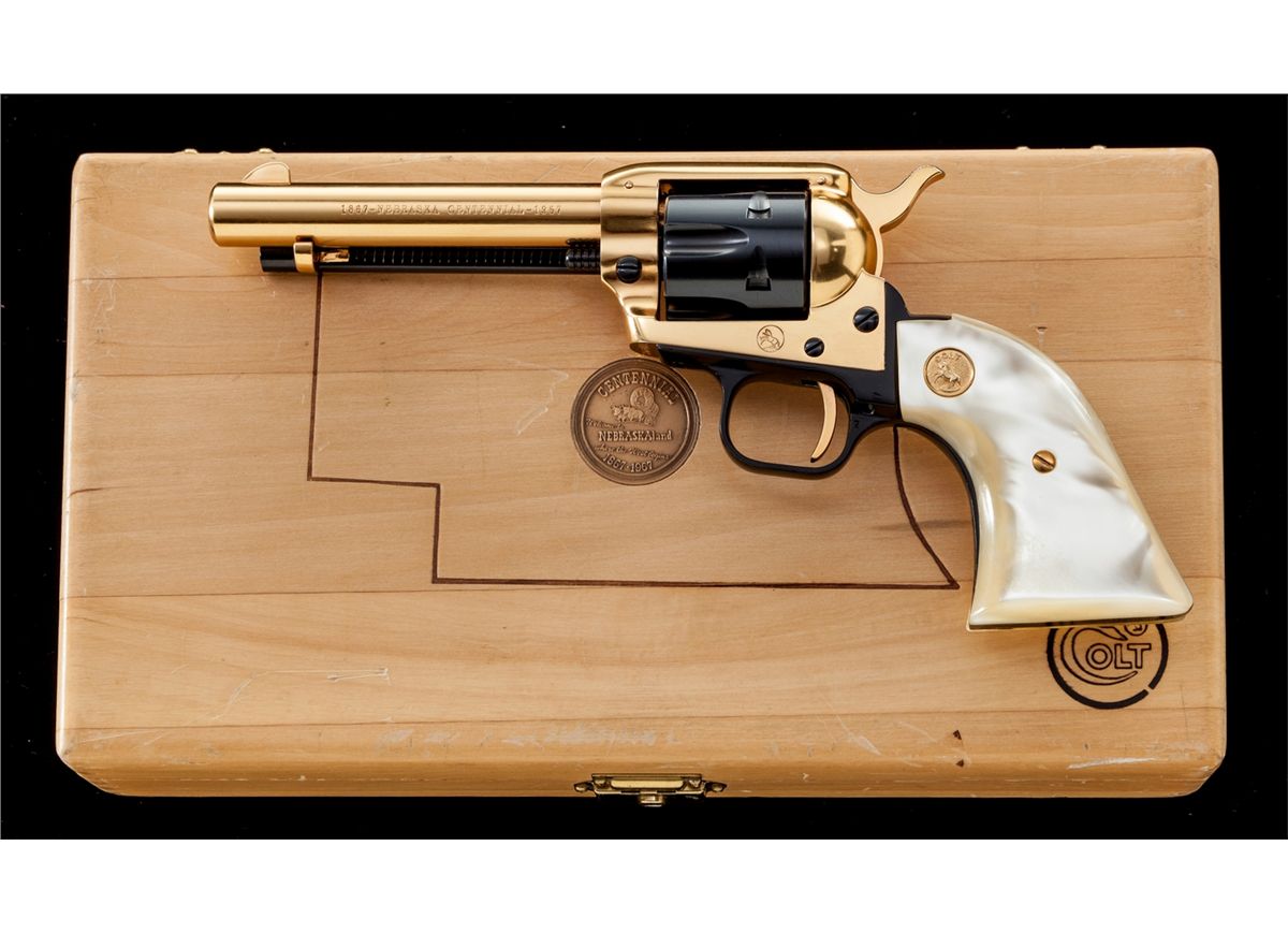 Colt Nebraska Centennial Frontier Scout Commemorative Single Action Revolver, 1867-1967, #3864NEB, .22 LR cal., 4-1/2'' barrel, blue and gold finish, factory faux pearl medallion grips, in presentation display case. Condition is excellent, appearing as new. Est.: $600-$800. (Modern)