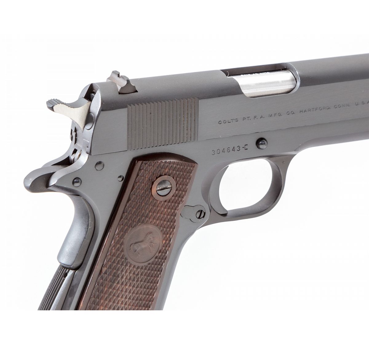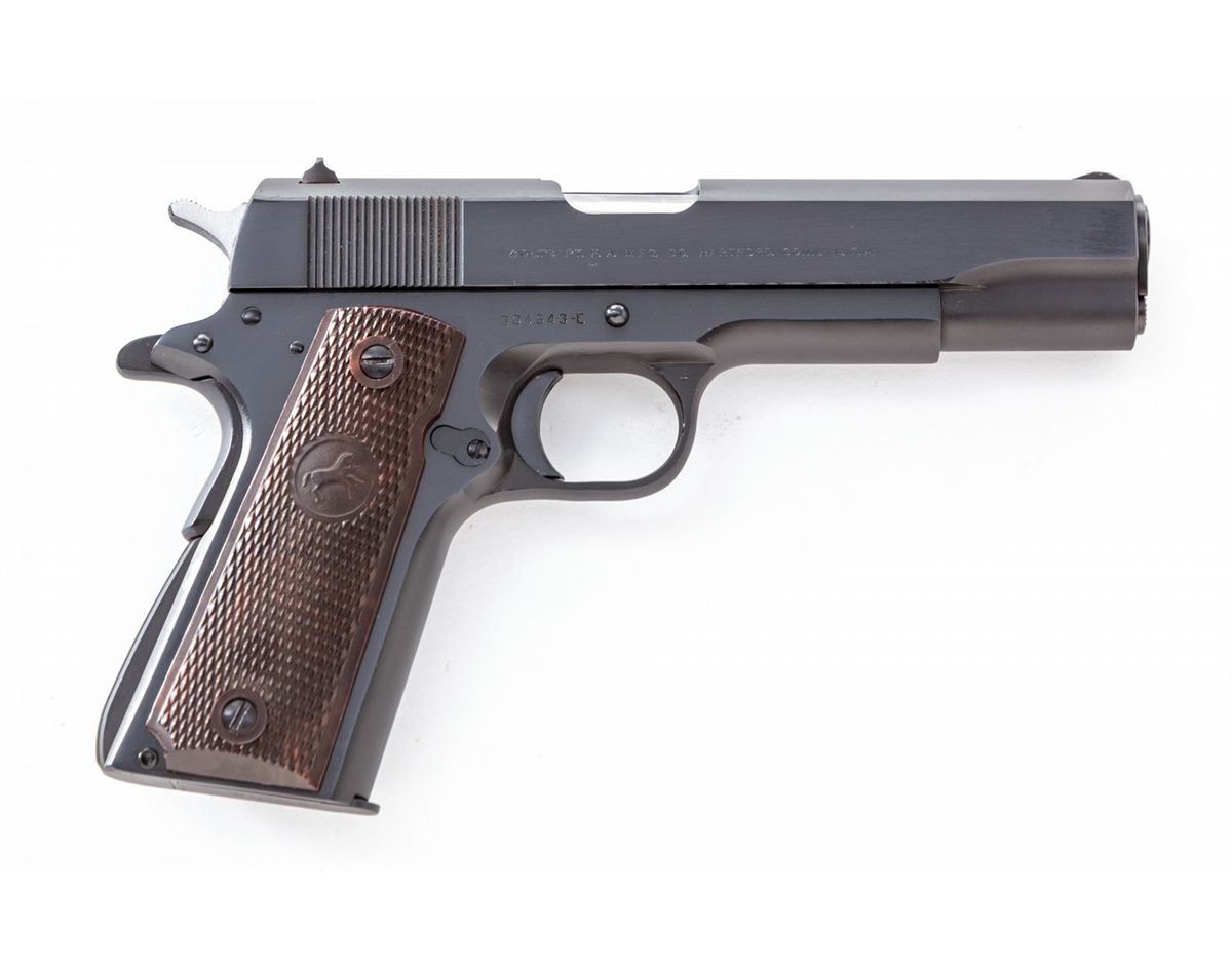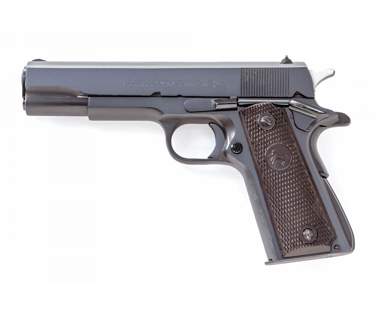 Colt Pre-Series 70 Gov't Model Semi-Automatic Pistol, #304643C, .45 ACP cal., 5'' barrel, blue finish, factory checkered brown plastic grips with Rampant Colt logo, in original box. Mfg'd 1966. Condition is excellent, appearing as new and unfired, with just the slightest marks in actioning area. Box with minor scuffing and good yellow end label. Est.: $1,000-$1,500. (Modern)