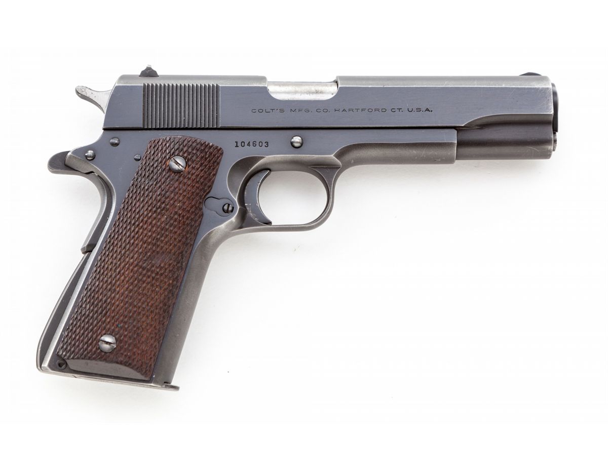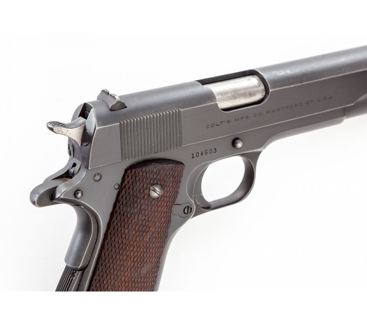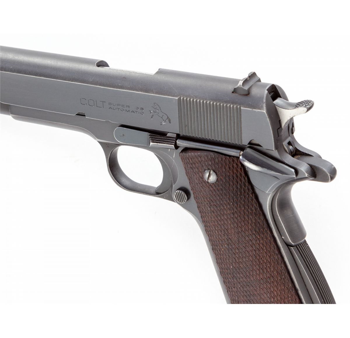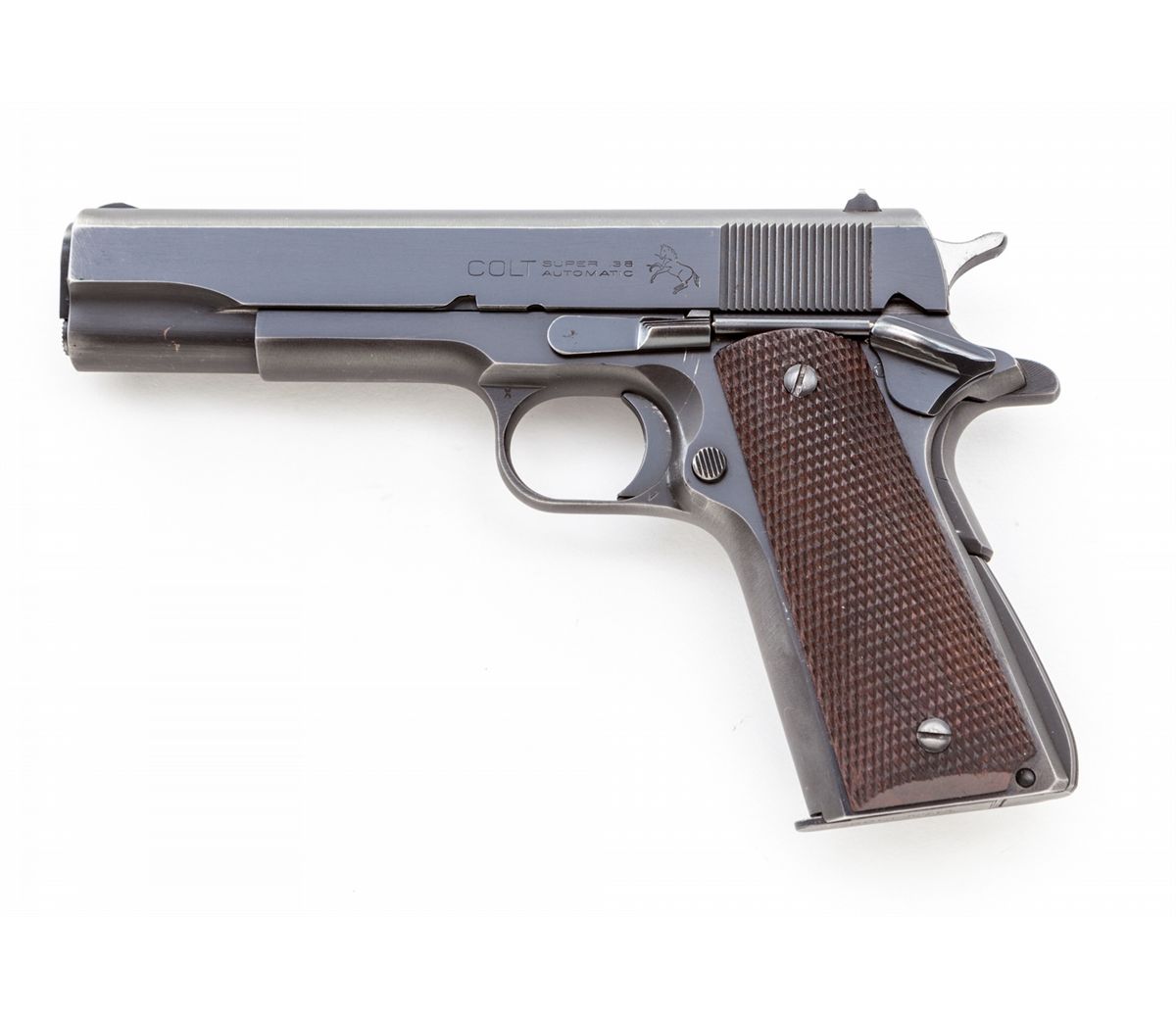 Colt Super .38 Semi-Automatic Pistol, #104603, .38 Super cal., 5'' barrel, blue finish, with early checkered walnut grips, with one correct factory magazine. Mfg'd 1952. Condition is excellent retaining approx. 97%+ original finish with very light thinning at high edges and front strap. Grips show minor flattening. Action is tight, bore is excellent. Est.: $2,000-$3,000. (C&R)