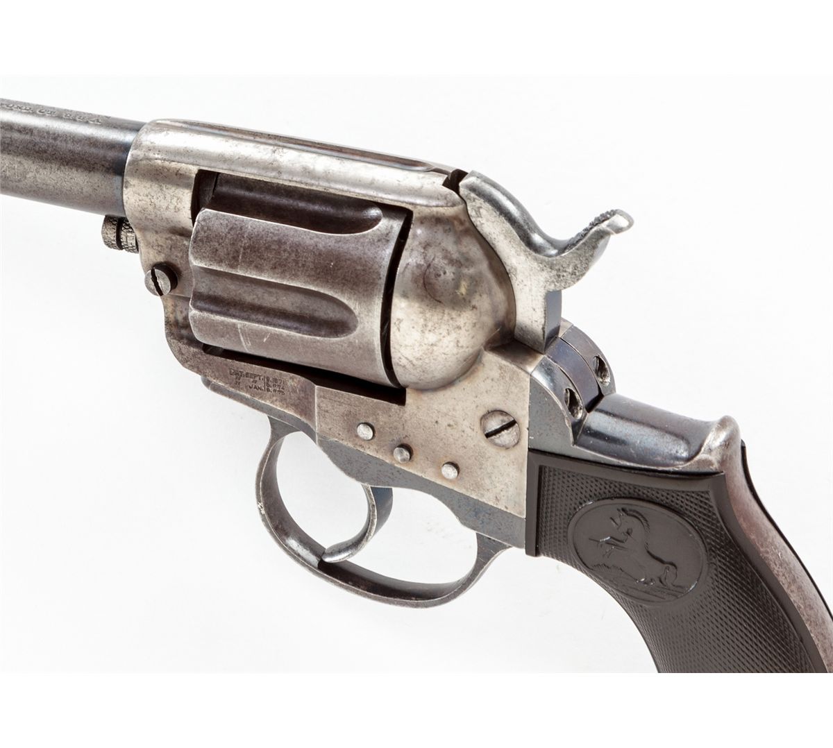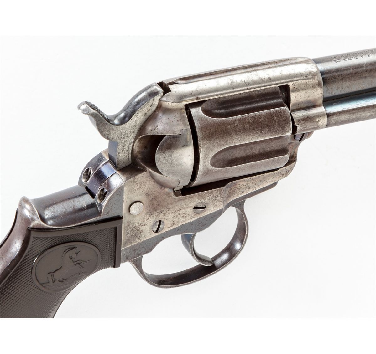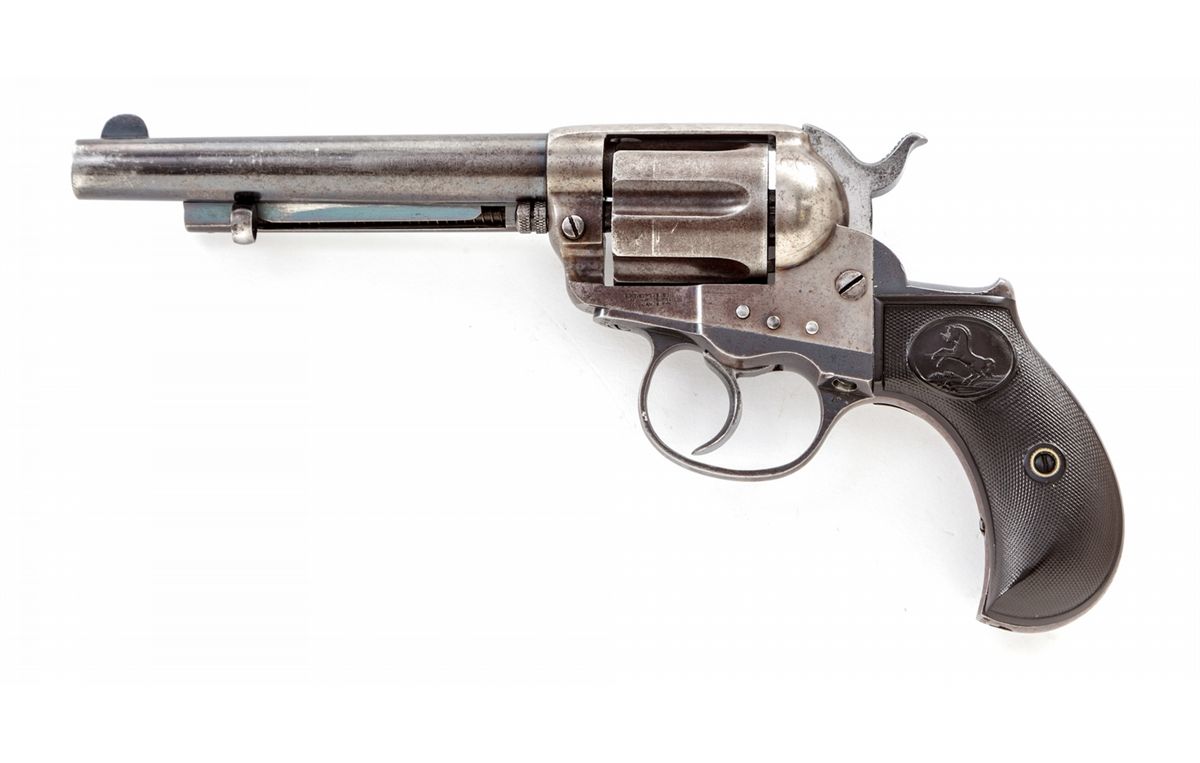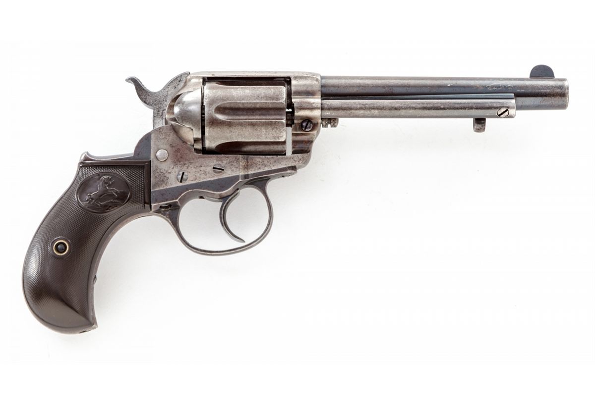 Colt Thunderer Double Action Revolver, #63348, .41 cal., rare 5'' etched panel barrel, blue and case hardened finish, factory bird's head checkered hard rubber grips with Colt logo. Shipped to Colt's Patent Firearms Mfg. Co., Jan. 10, 1888, ten guns in shipment, with factory letter verifying all features. Condition is very good to near fine retaining approx. 75% blue to barrel, 20% thinning and toning blue to cylinder having mostly toned brown; backstrap and triggerguard show 50% blue having moderately toned. Case hardened frame with very faint traces of finish. Action is crisp in both single and double action; bore is fine. Est.: $800-$1,200. (Antique)