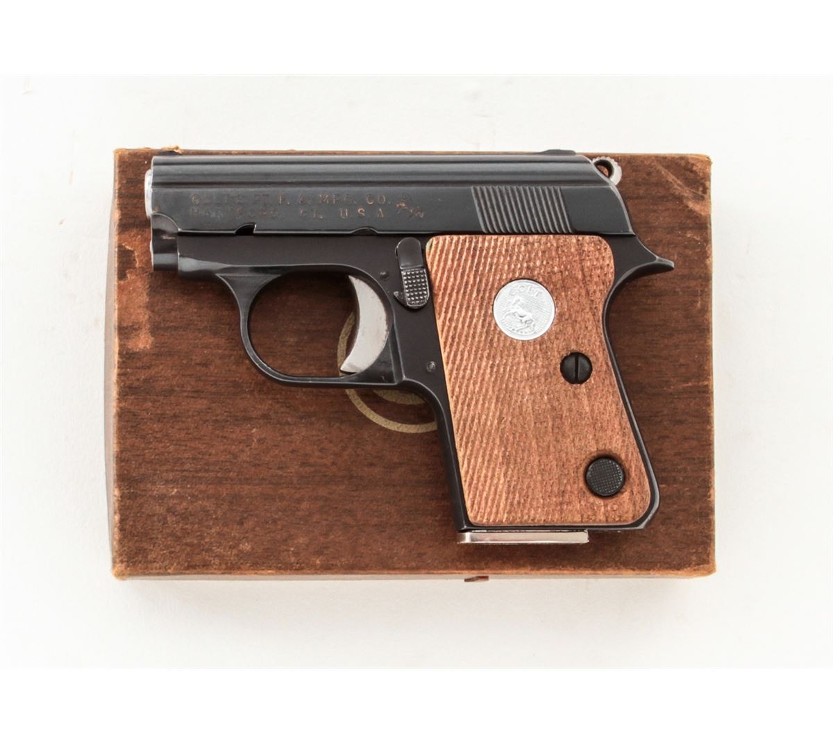 Colt Vest Pocket Semi-Automatic Pistol, #OD35576, .25 cal., 2'' barrel, blue finish, checkered medallion walnut grips, with one magazine, in original simulated woodgrain box with instructions. Made in Spain. Condition is excellent showing very light wear at muzzle. Est.: $300-$500. (C&R/PPT)