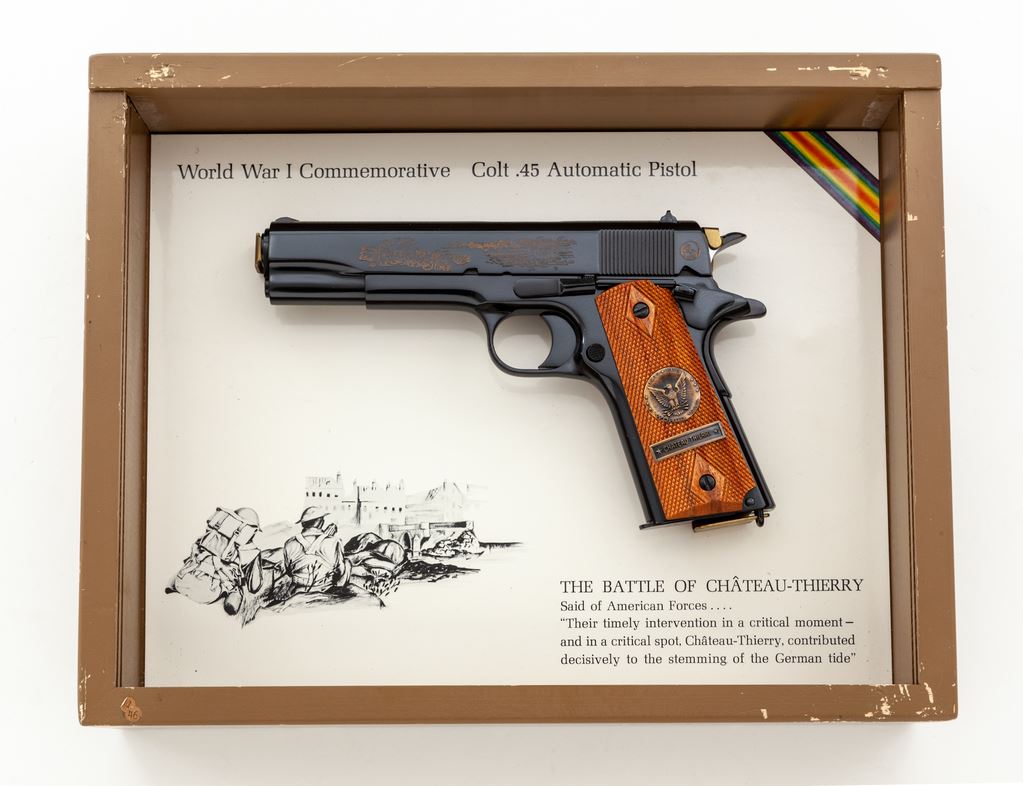Colt WWI ''Battle of Chatteau Thierry'' Commemorative 1911 Semi-Automatic Pistol, #1490-CT, .45 ACP cal., 5'' barrel, dark blue finish, checkered wood grips with commemorative medallions, standard sights, and one original magazine. Gold highlighted engraving includes ''1917 World War I Commemorative 1967'' banner to right side of slide; left side with battle scene. In original hanging display case with clear plexi-glass front and battle information on back. Pistol is in excellent overall condition, appearing as new and unfired. Metal shows only a few insignificant slight handling marks. Factory lettering and engraving is crisp. Grips are also excellent with clean untarnished medallions. Action is smooth, bore is excellent. Wood display case with intermittent moderate storage wear to the painted finish. Est.: $800-$1,200. (C&R)(Sierra Sid's Casino, Sparks, NV.)
