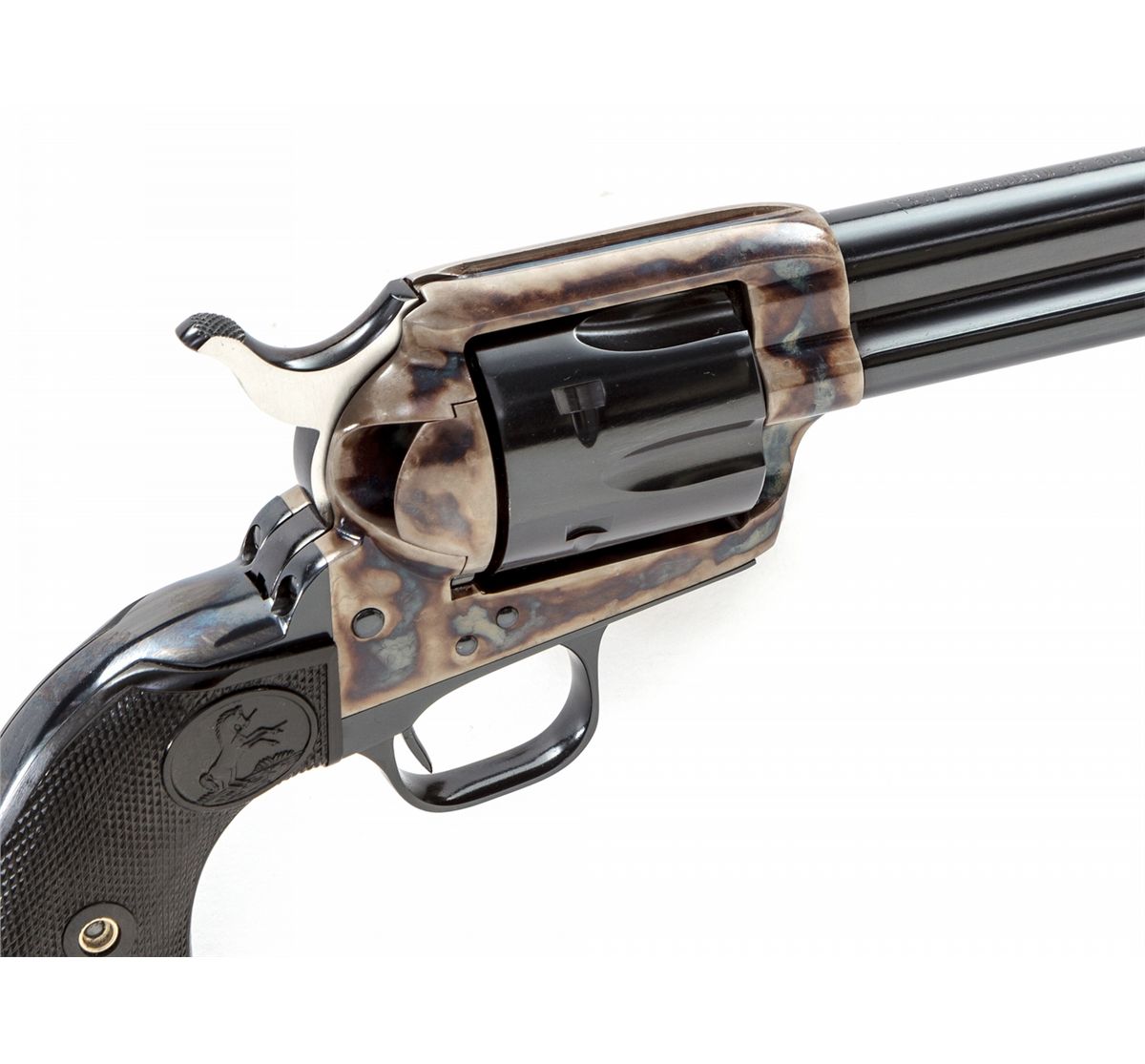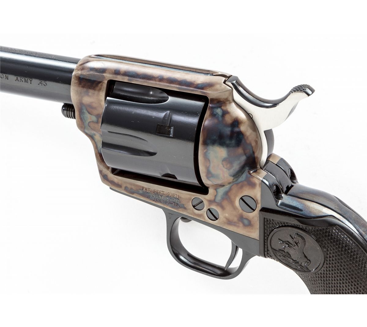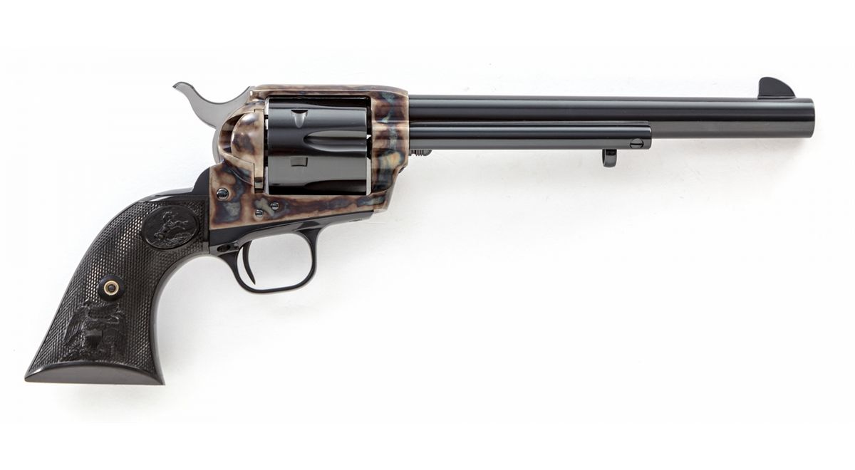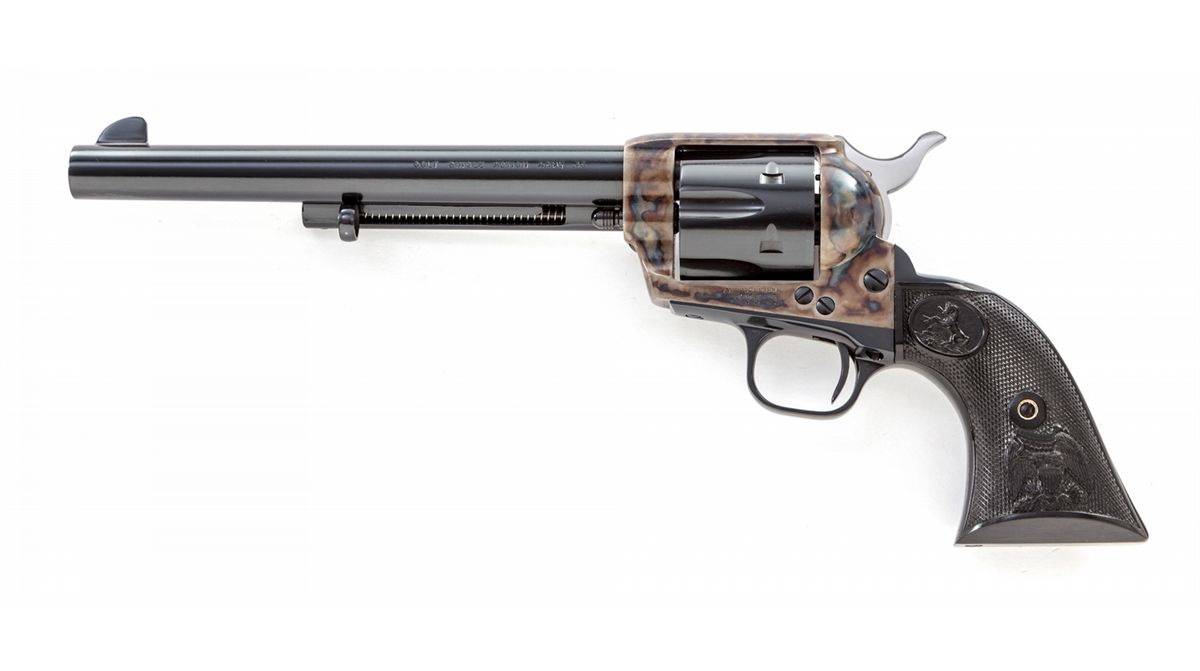 Colt Late 3rd Generation Single Action Revolver, #S38708A, .45 Colt cal., 7-1/2'' barrel, blue and case hardened finish, factory checkered American eagle black plastic grips. Condition is excellent, appearing new and unfired with unturned cylinder, in original blue box with white slip cover. Est.: $1,800-$2,400. (Modern)