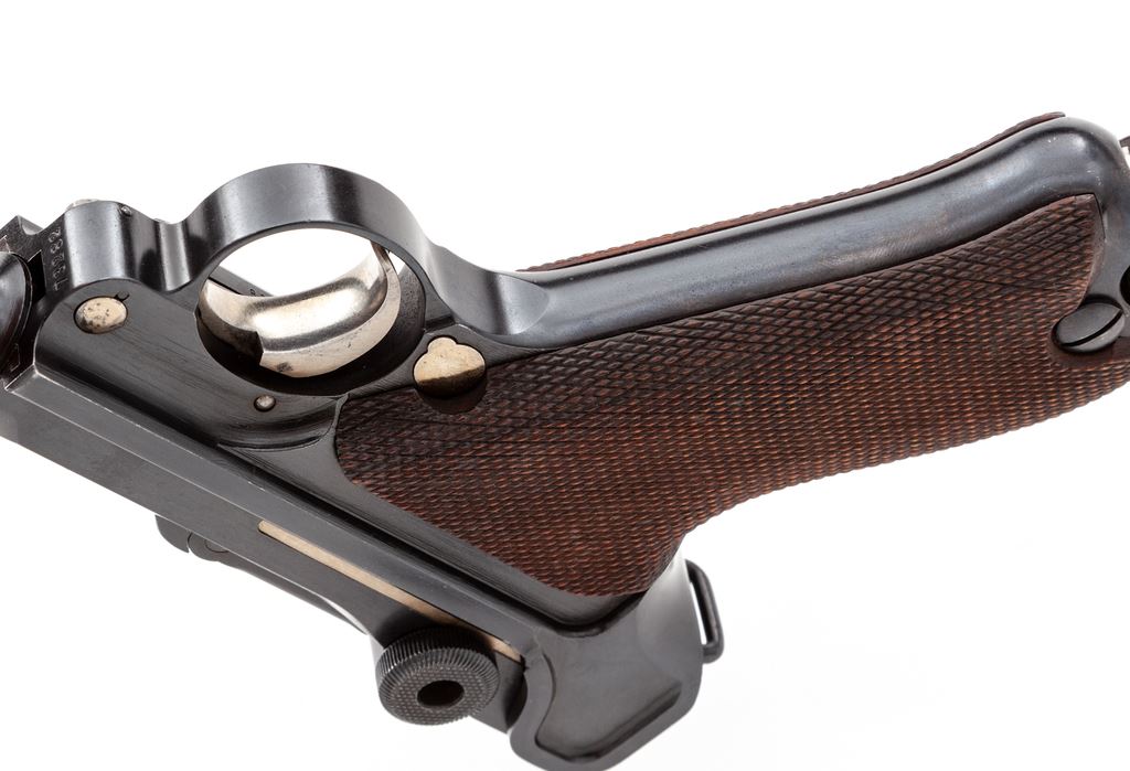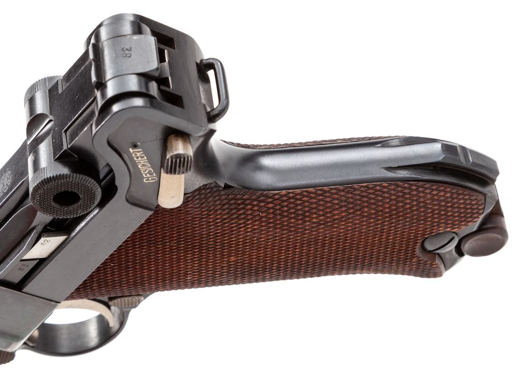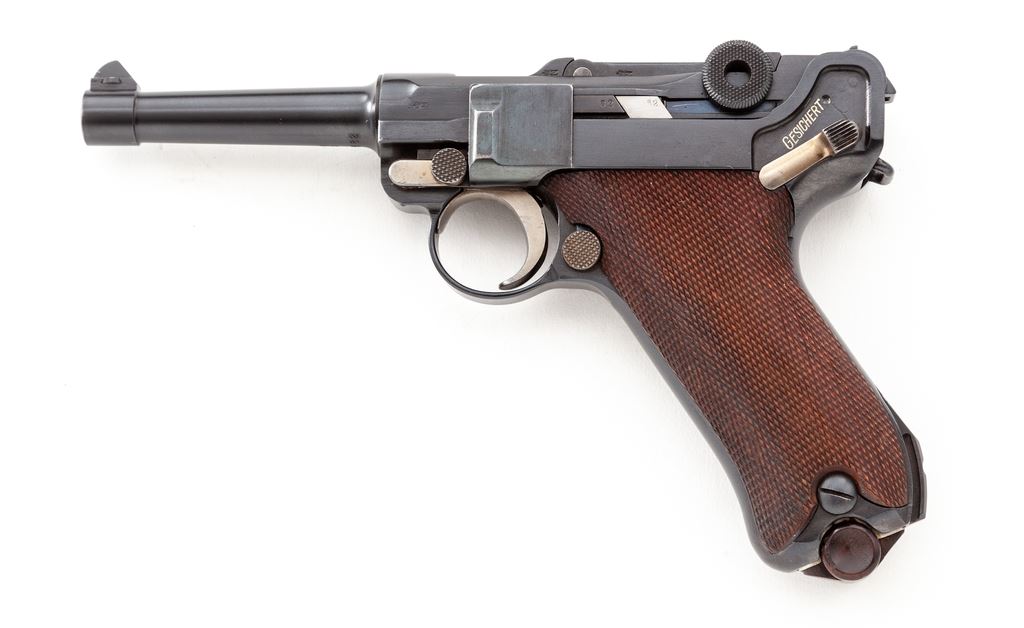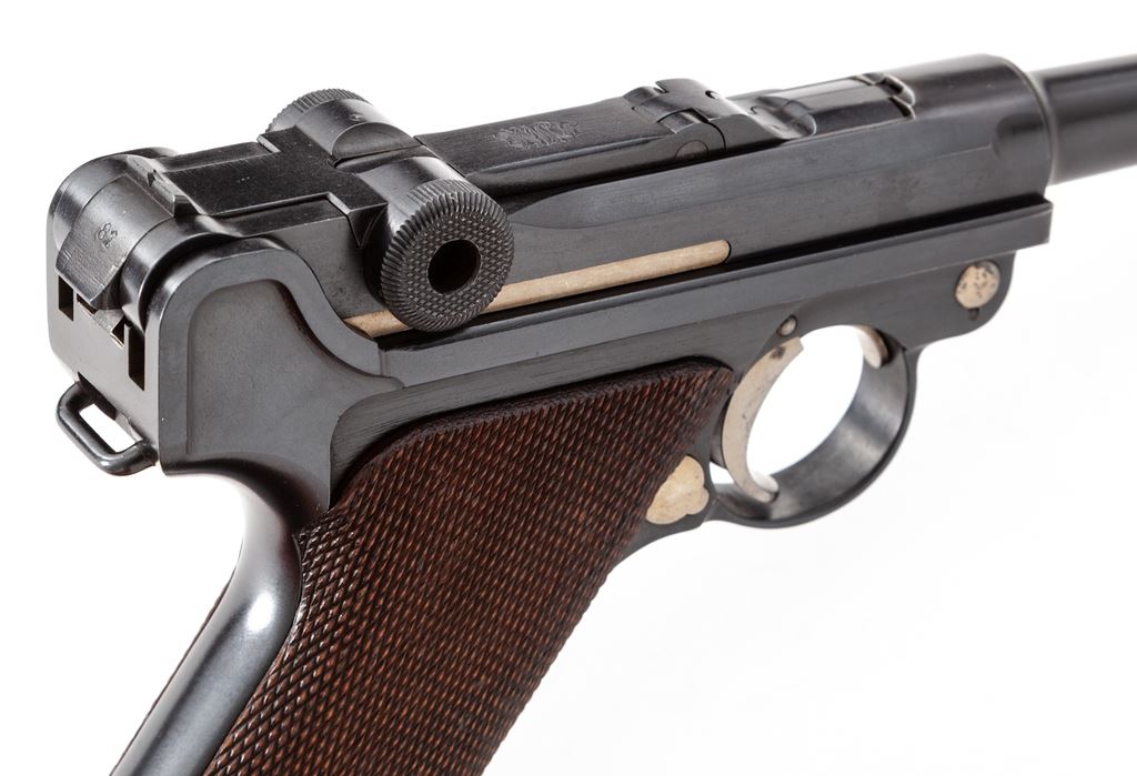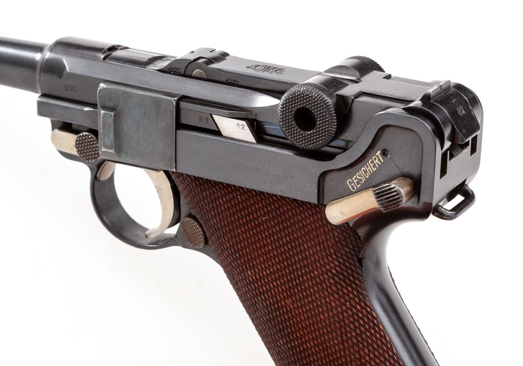 Commercial Model 1919 Luger, by DWM, #73282, .30 Luger cal., 3.75'' barrel, blue finish, straw small parts, checkered walnut grips, with one unmarked wood based tin-plated magazine. ''(Crown)/N'' markings to upper receiver and bottom of barrel. Chamber area blank, toggle marked DWM, ''Geischert/Geladen'' thumb safety and extractor, with all visible matching numbers. Condition is excellent retaining approx. 98% lightly thinning blue, which appears to be original as serial numbers to bottom of barrel are clearly stamped through the finish. Straw small parts have thinned to approx. 90%. Grips show minor wear. Crisp action, fine bore. Est.: $1,000-$1,500. (C&R/PPT)