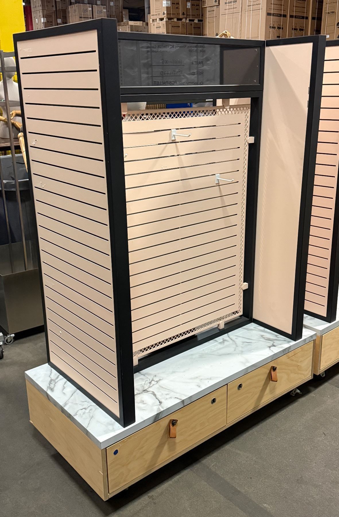 Commercial heavy duty retail slatwall display gondola w/ marble base, hooks & casters - approx 4ft W