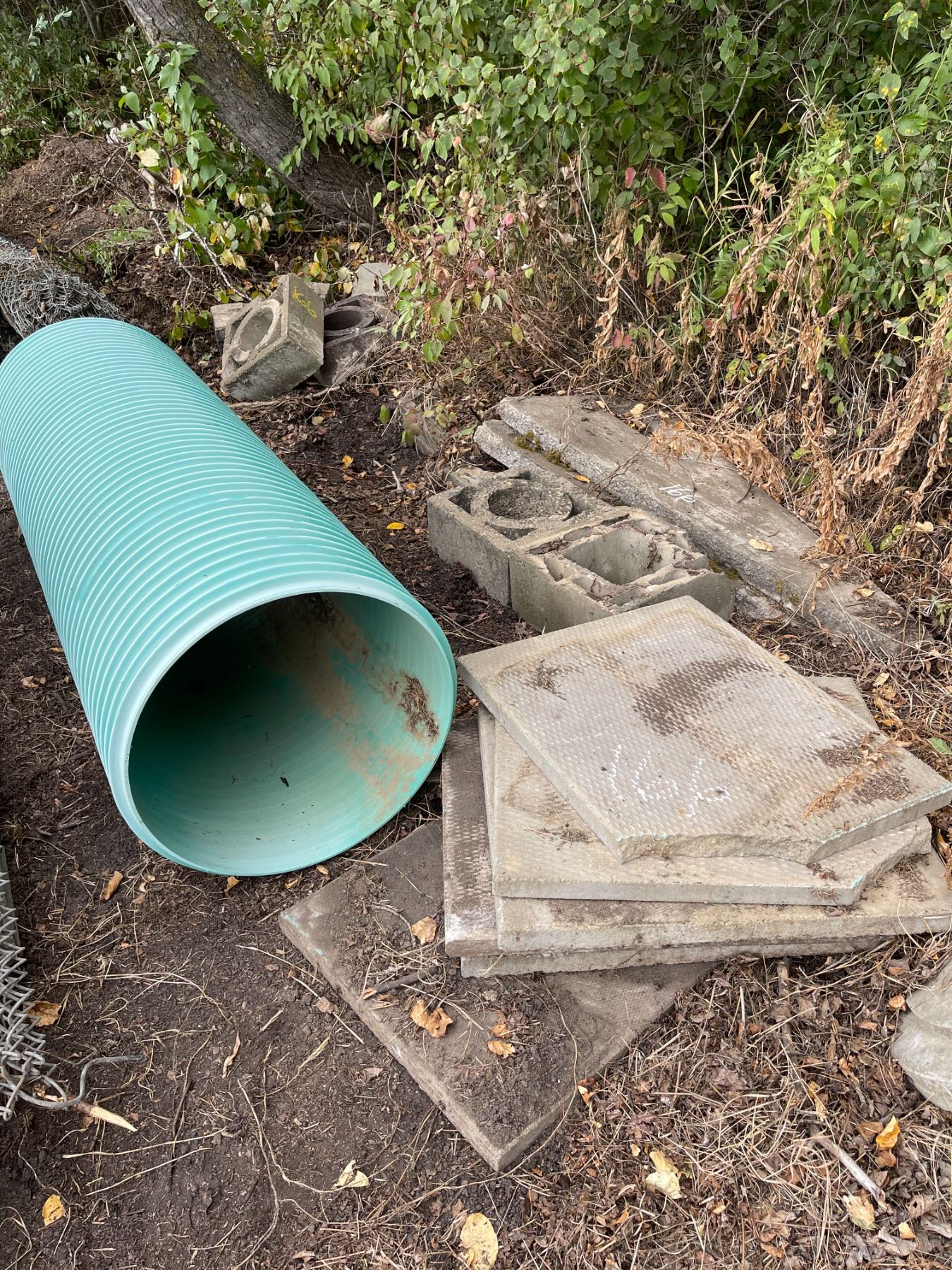 Concrete patio blocks, plastic pipe