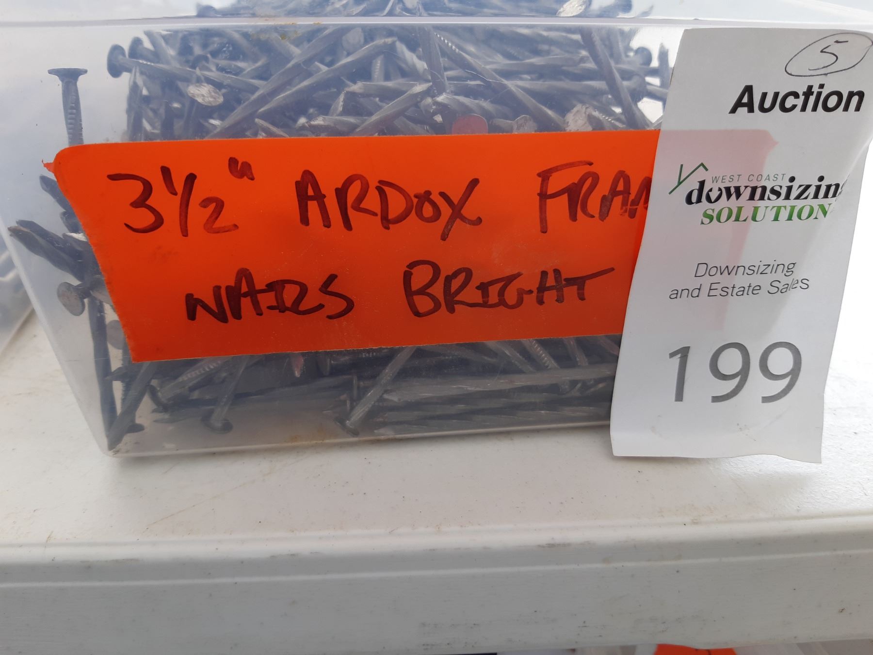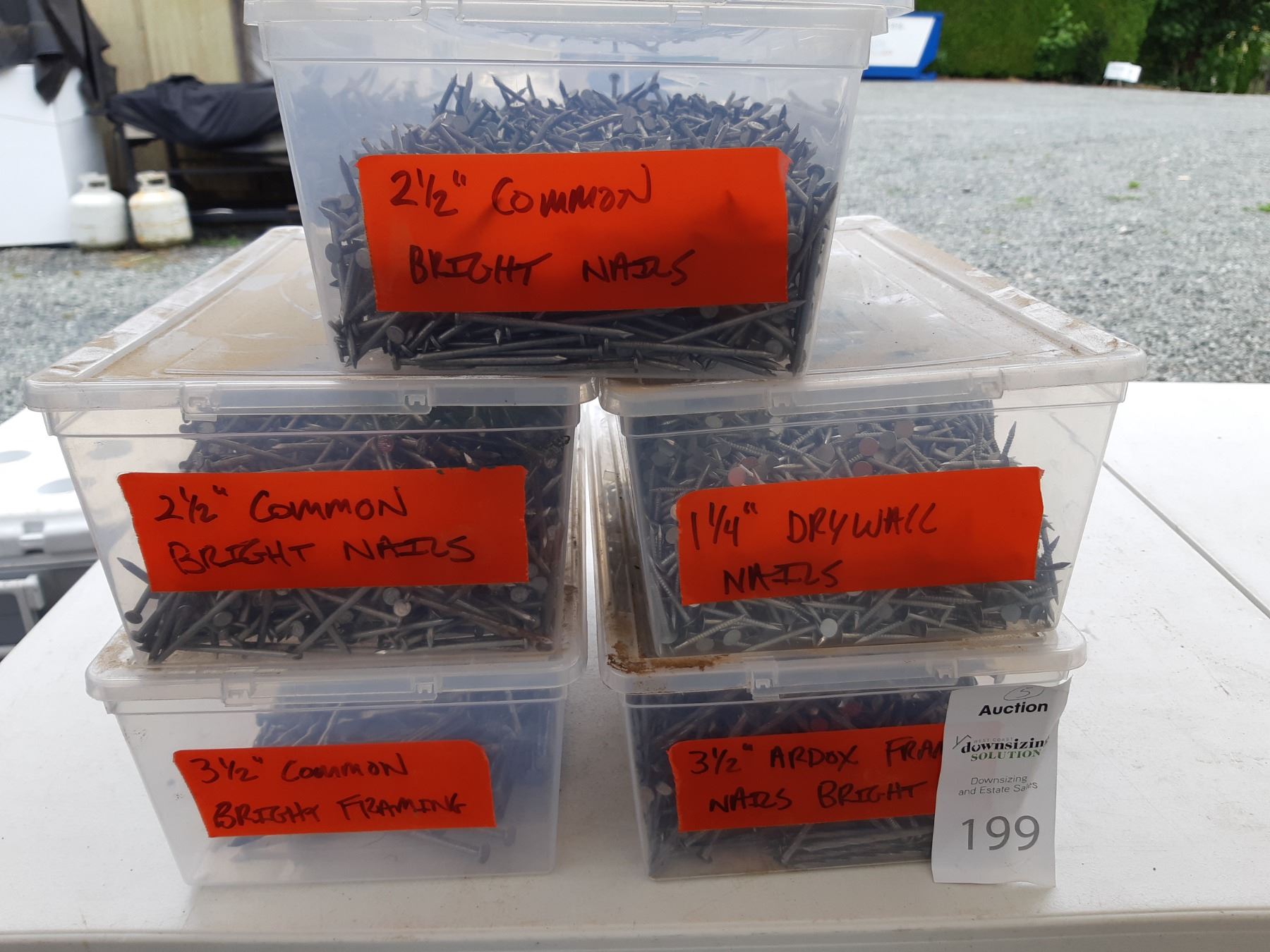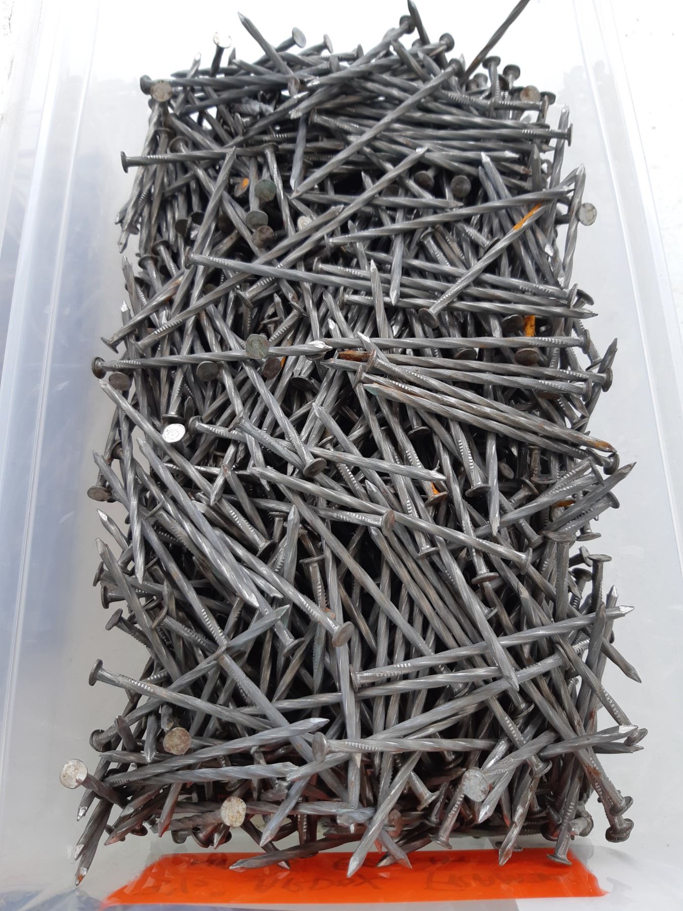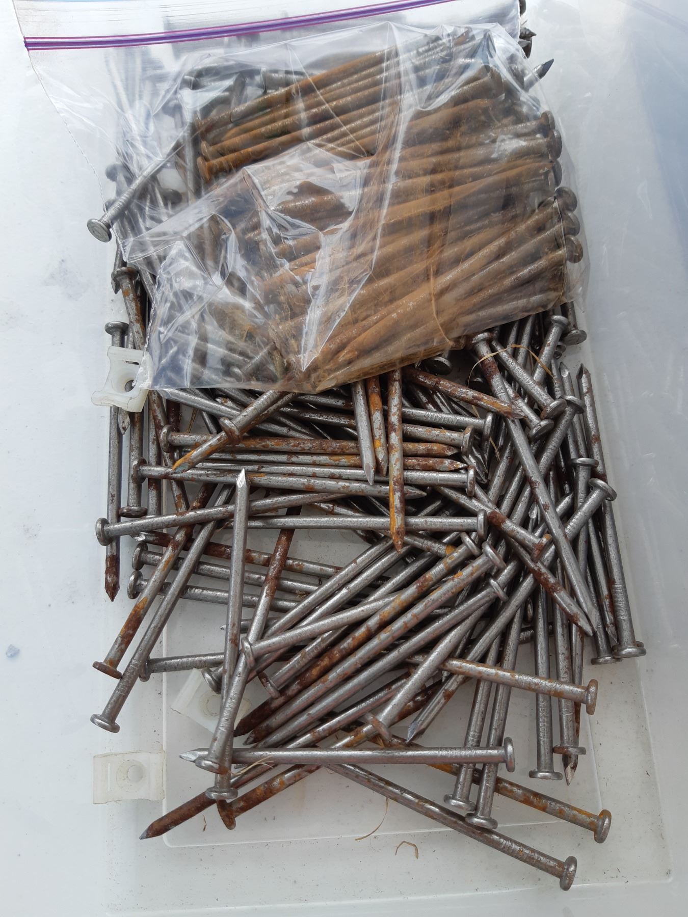 Five bins of nails, various sizes. See pictures. Unchecked for completeness.