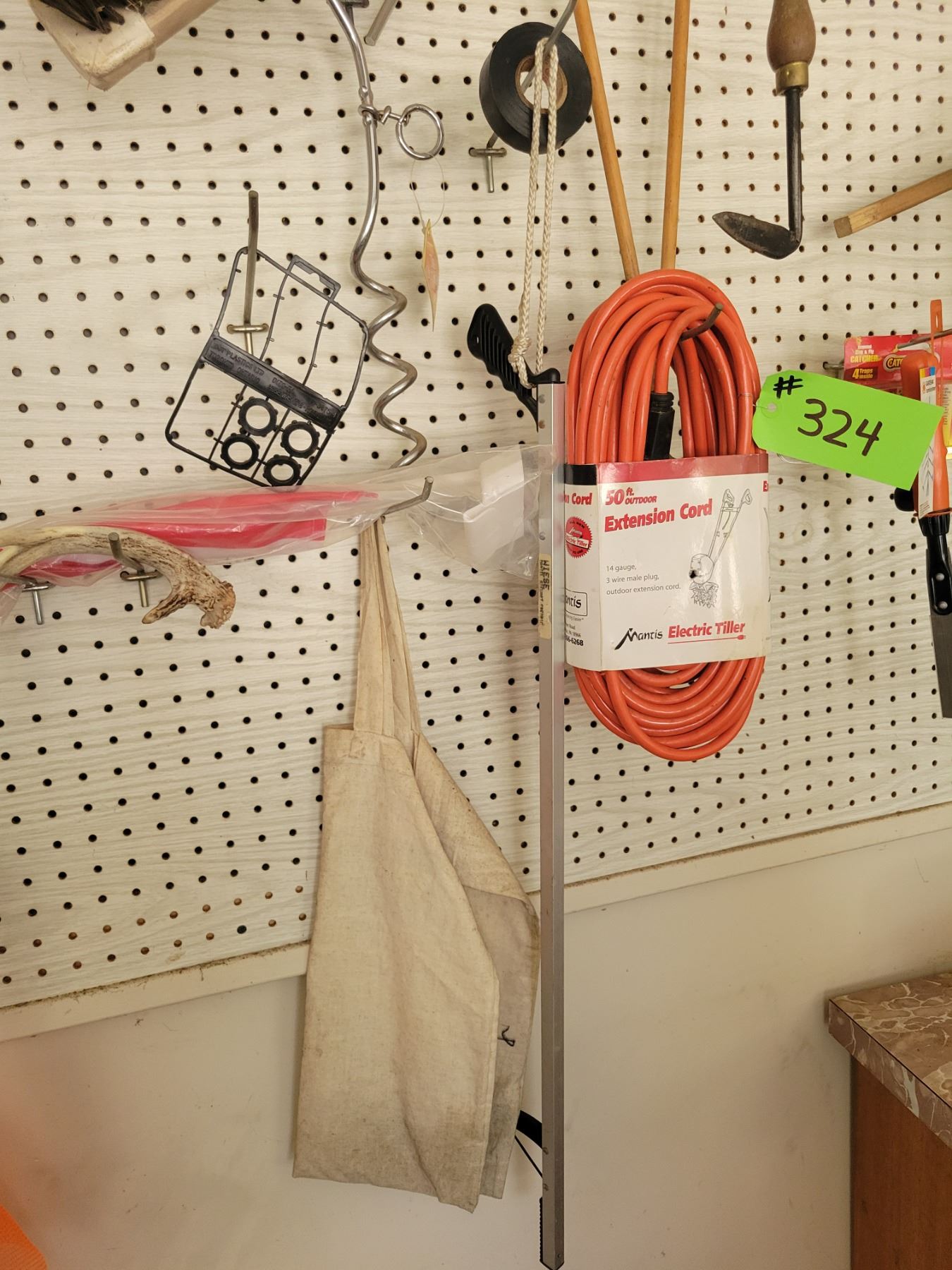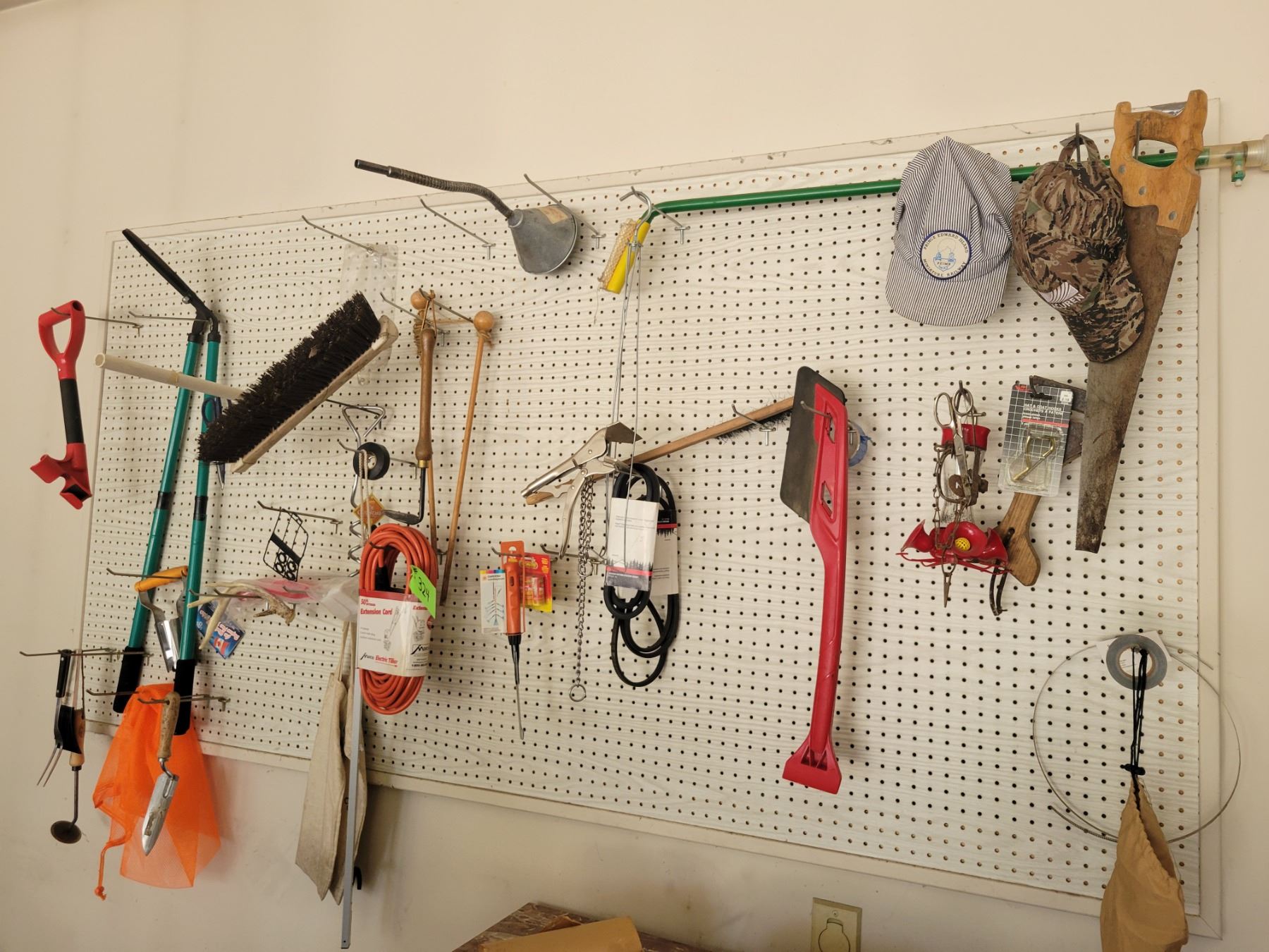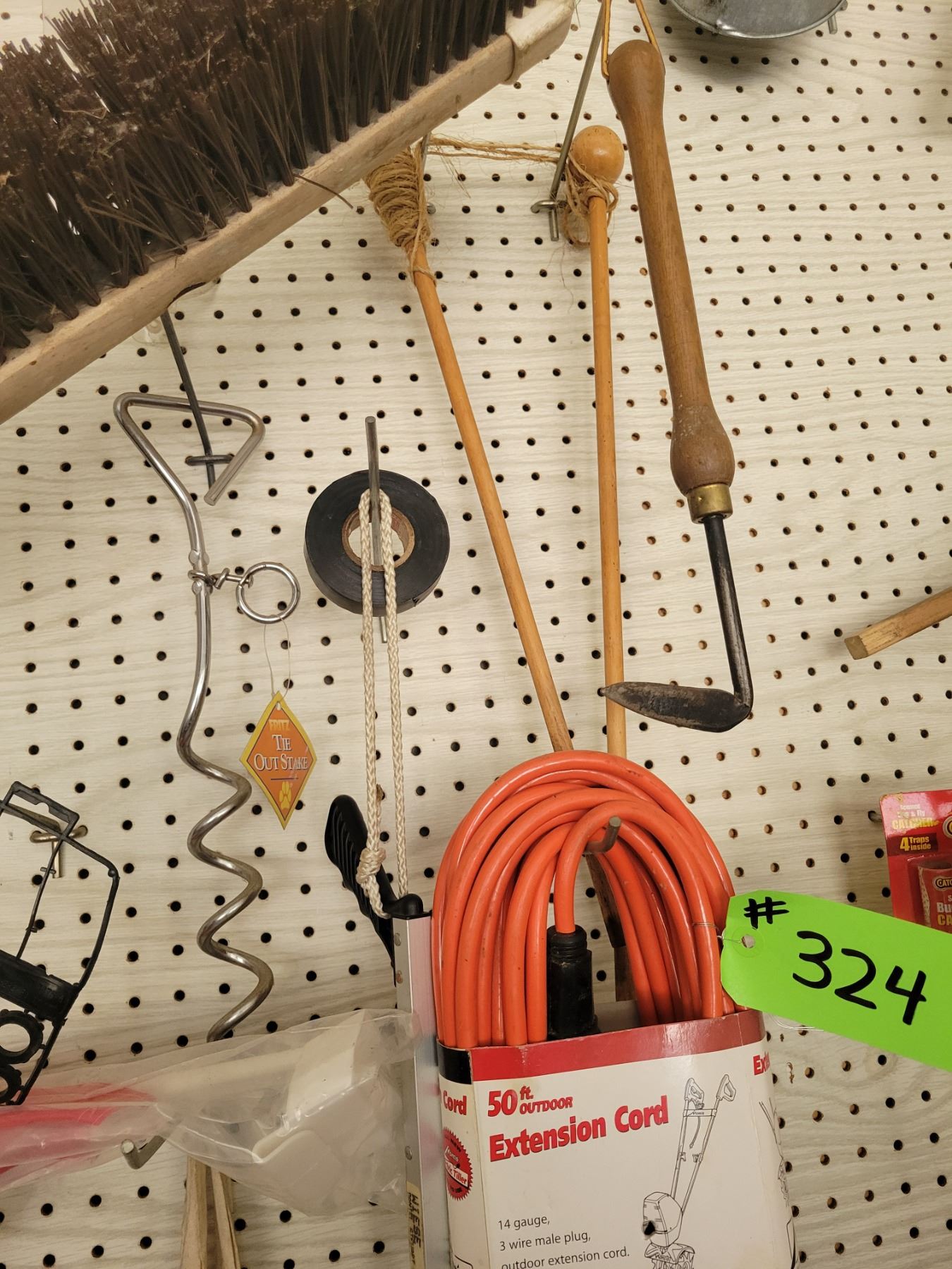 Contents of Peg Board - saw, snow blade, Bug & Fly Catcher, 50ft. Outdoor Ext. Cord, Sack, Broomhead, Clipper (Peg Board Not Included)