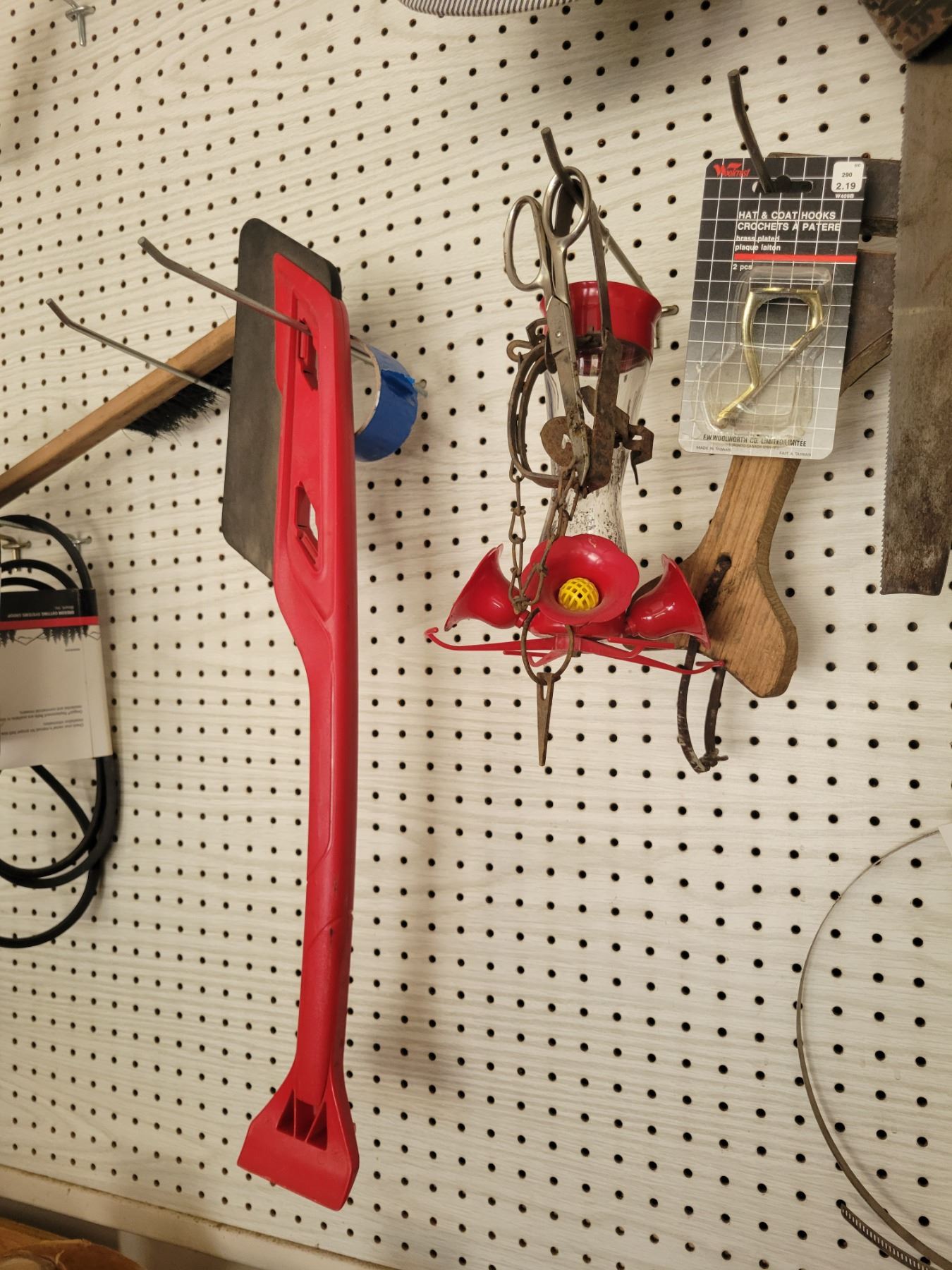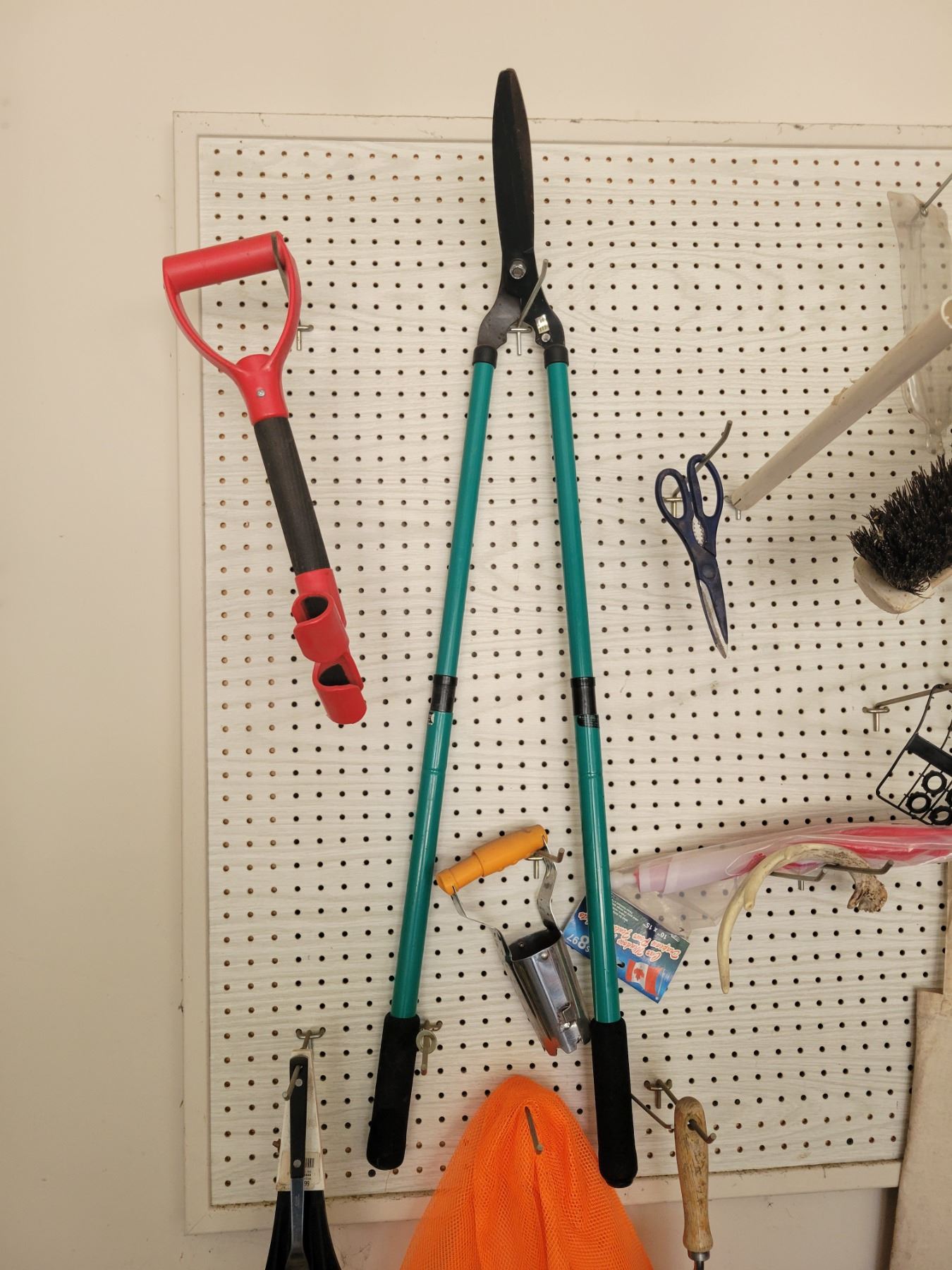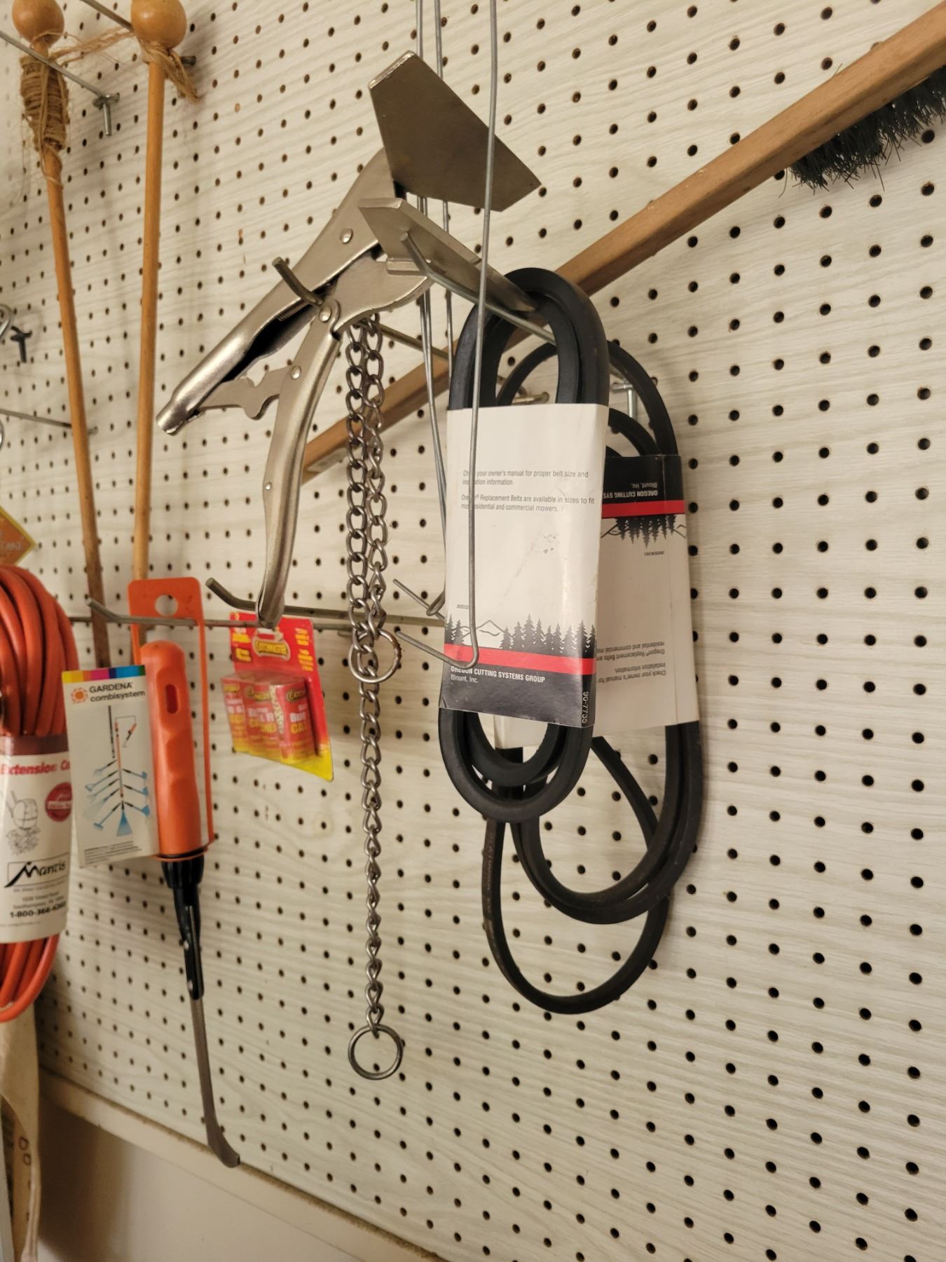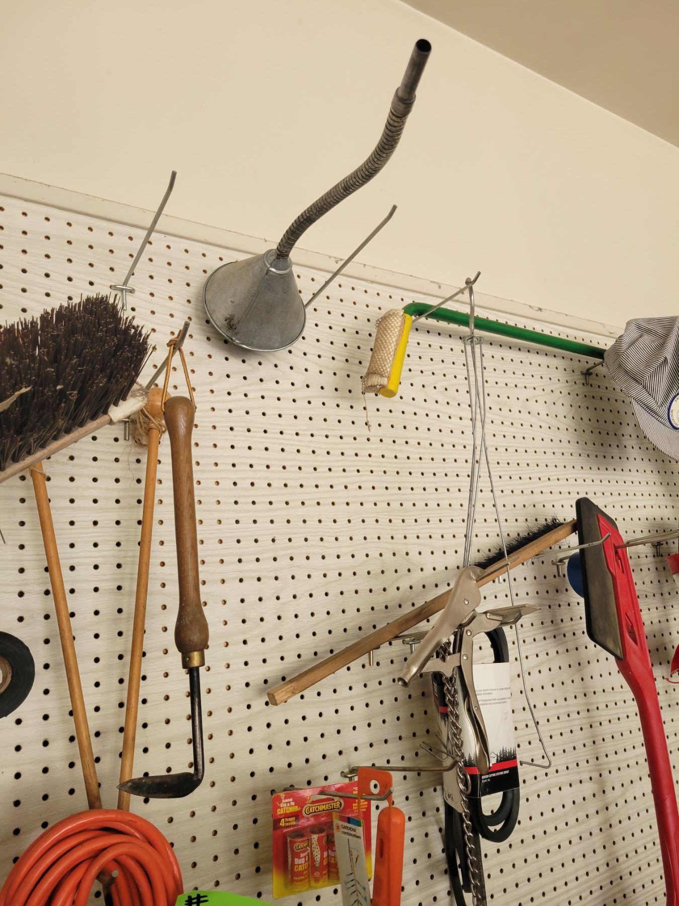 Contents of Peg Board - saw, snow blade, Bug & Fly Catcher, 50ft. Outdoor Ext. Cord, Sack, Broomhead, Clipper (Peg Board Not Included)