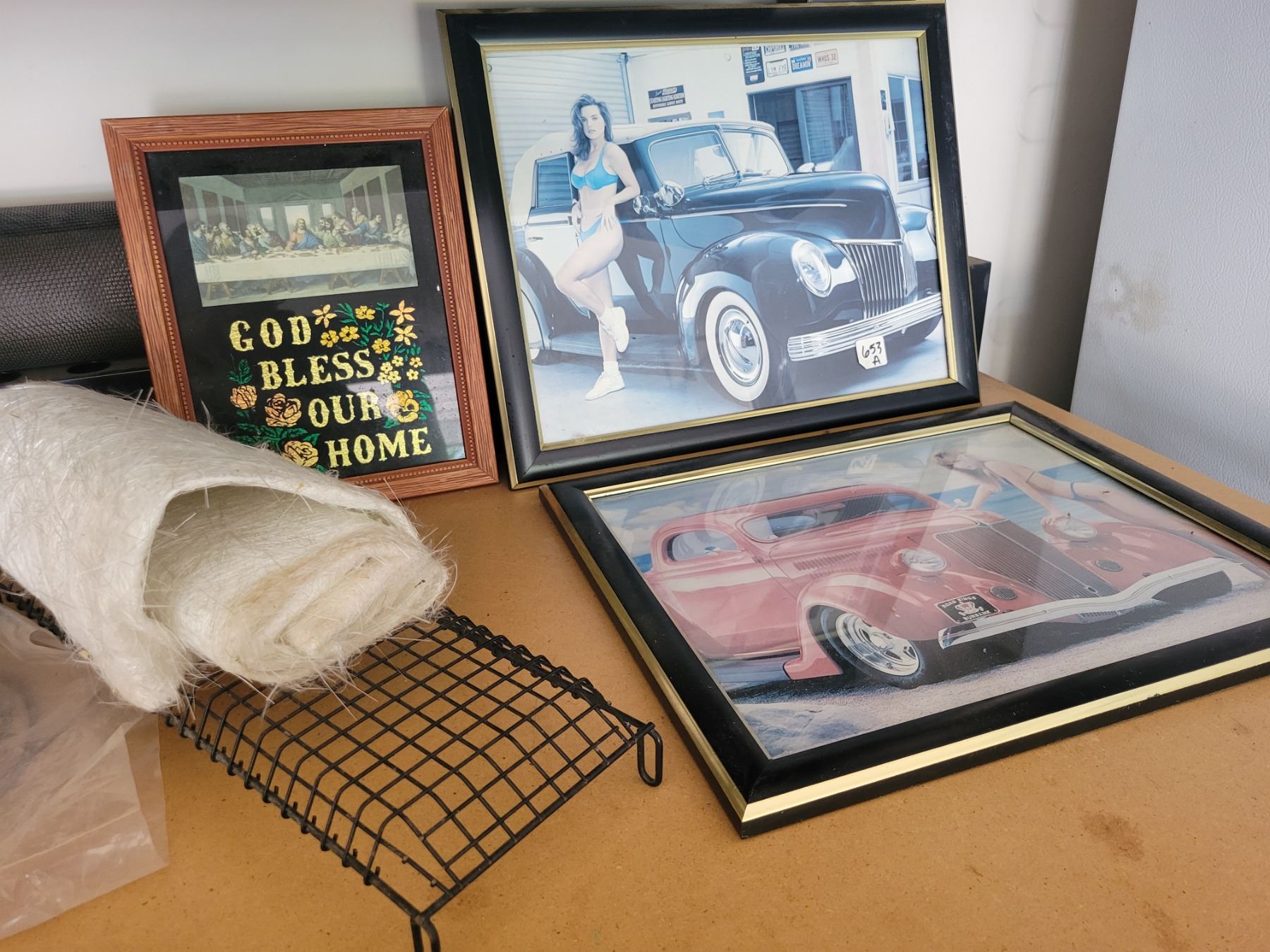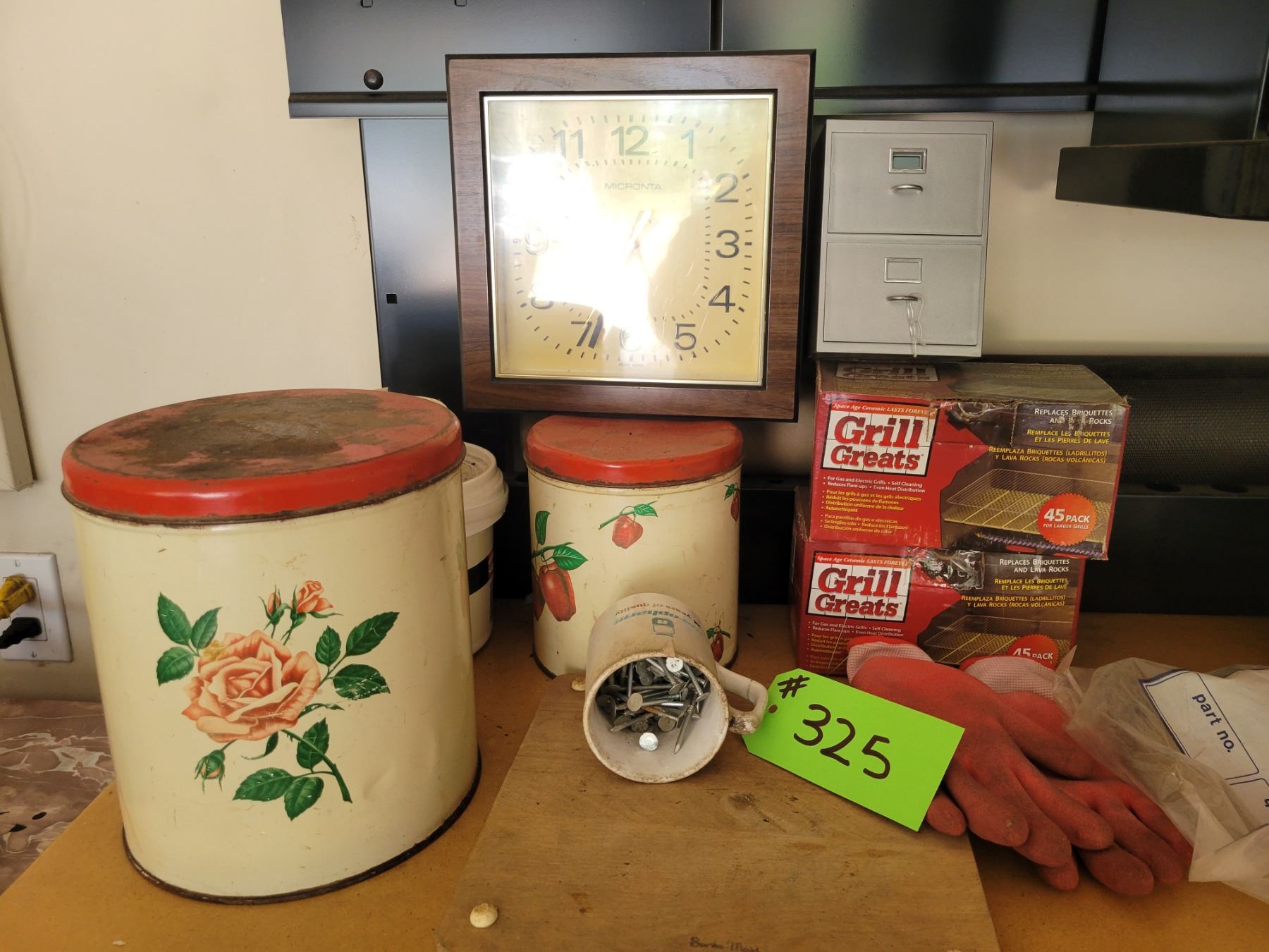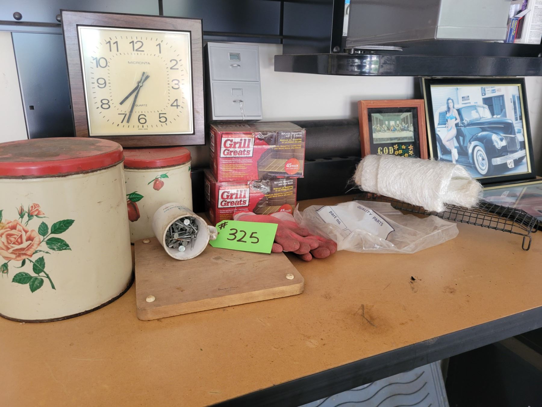 Contents on Counter - Grill Greats, 2 Tin Containers, 3 Pictures, Clock & Cup with Nails.
