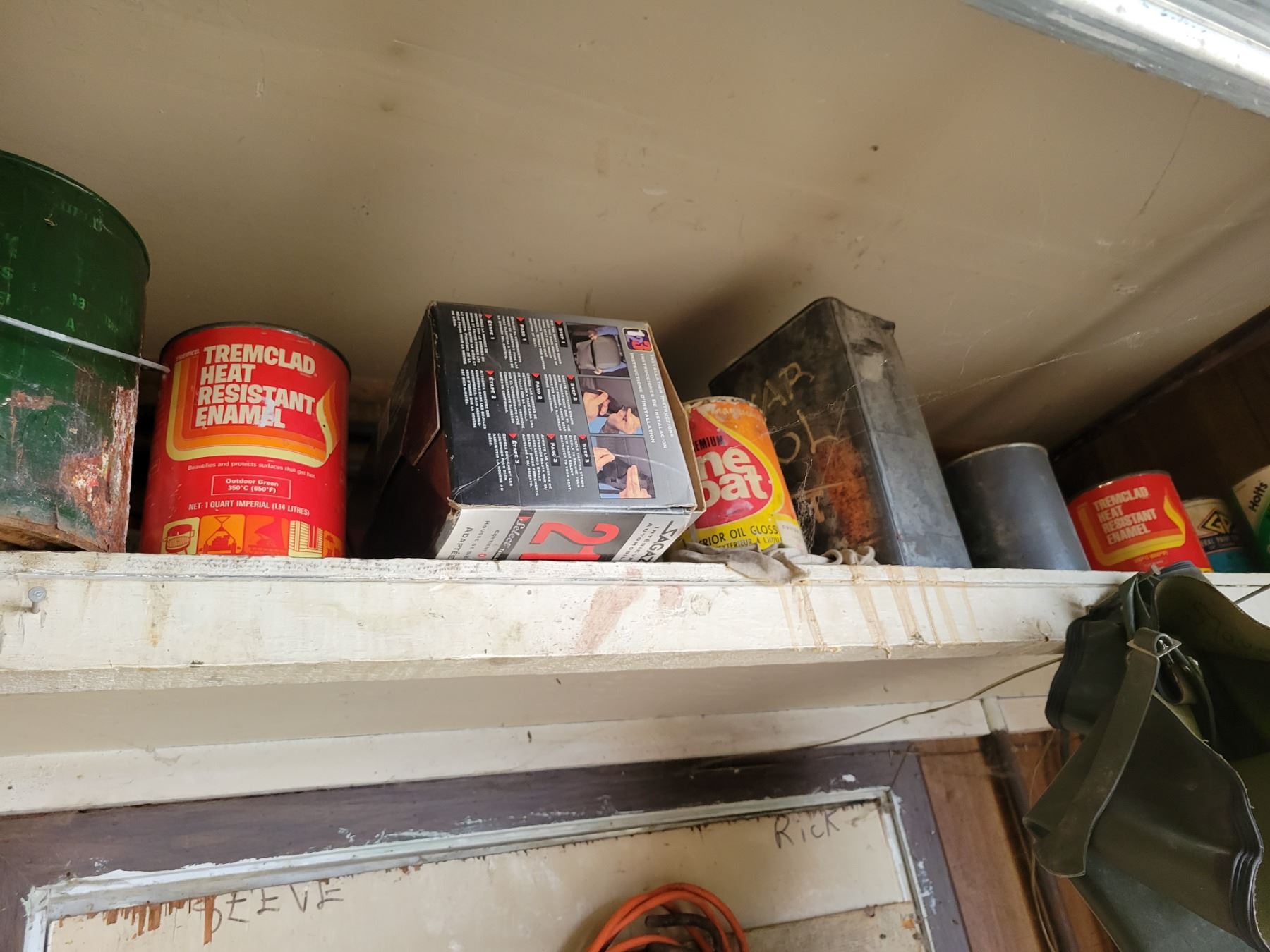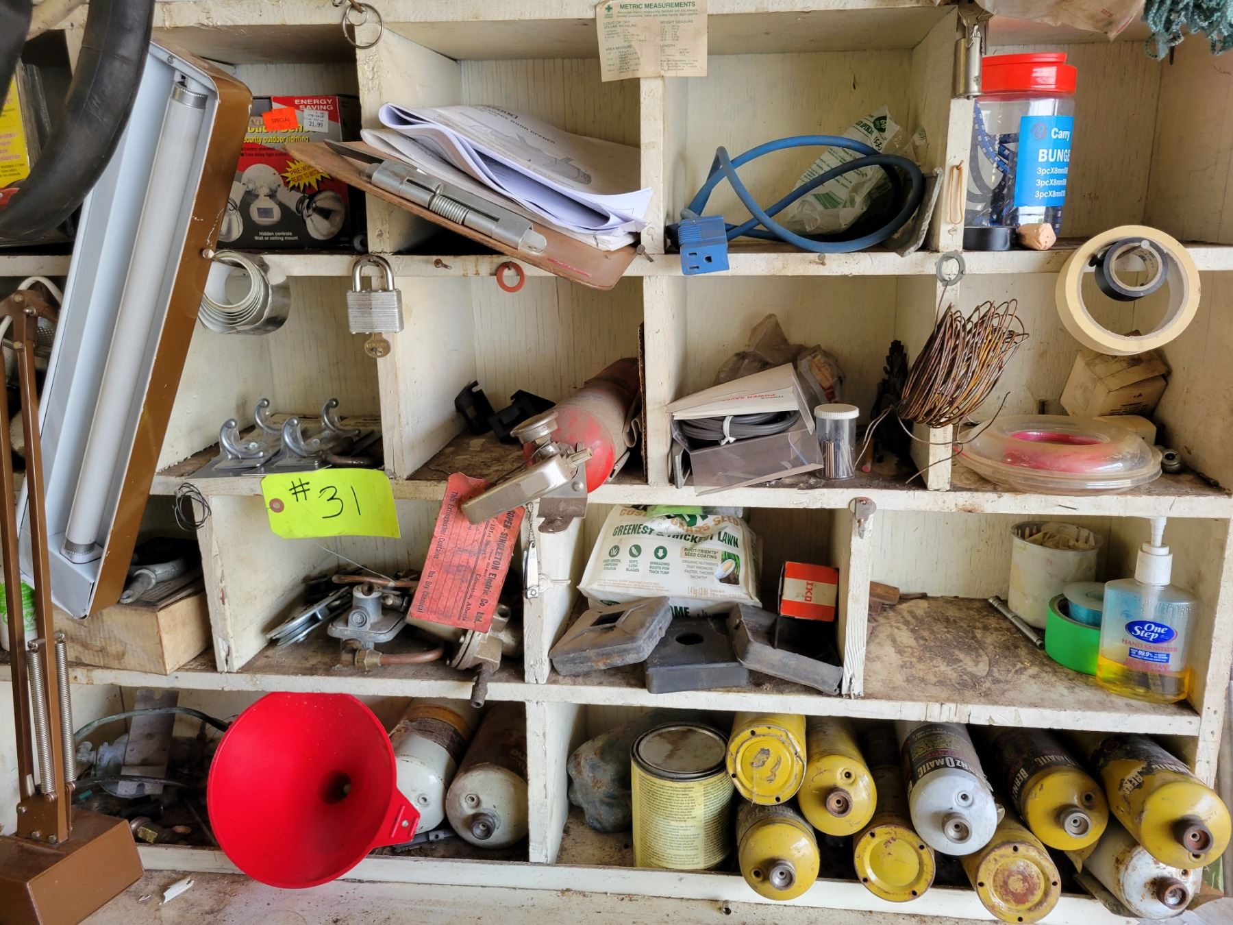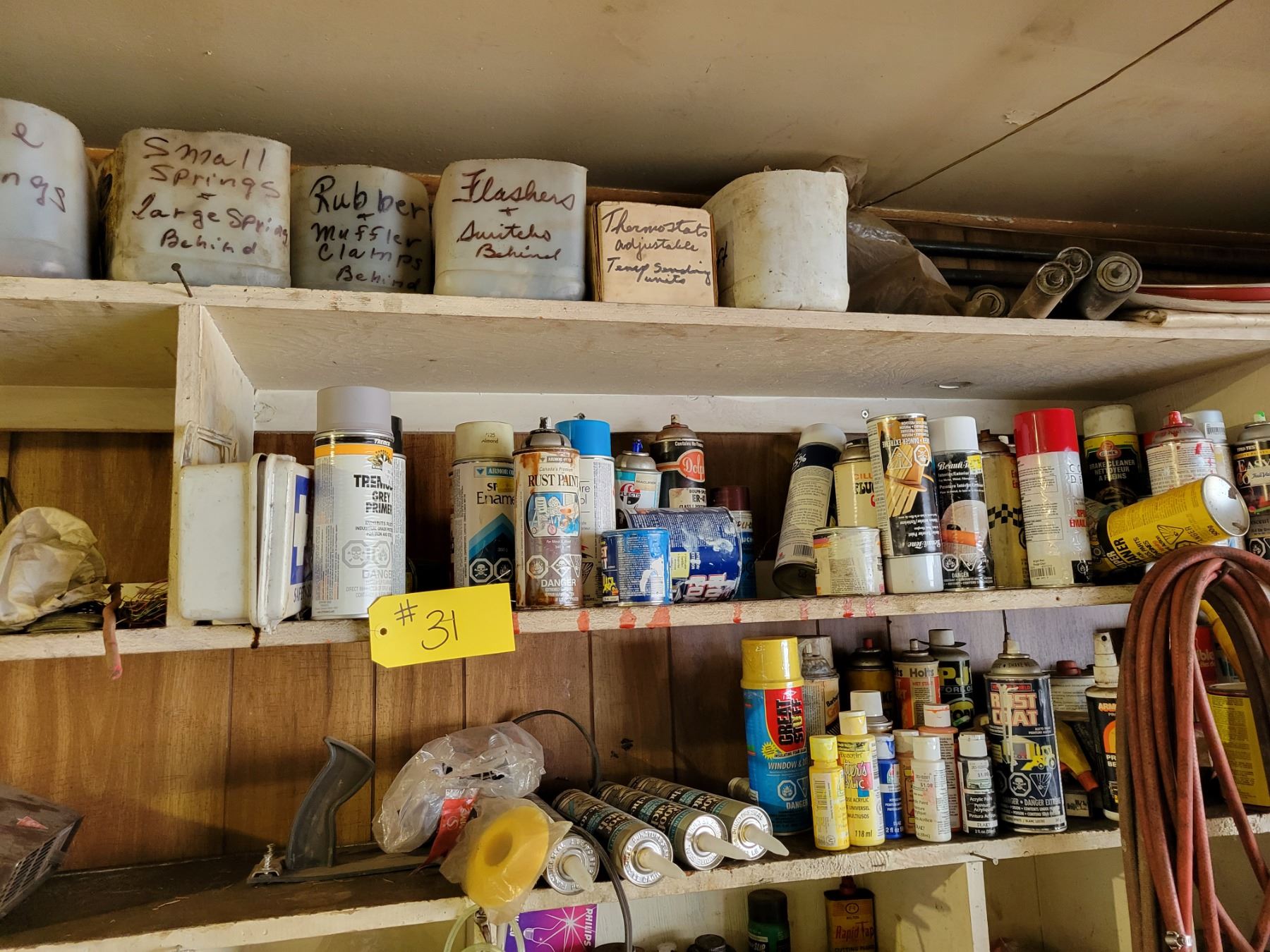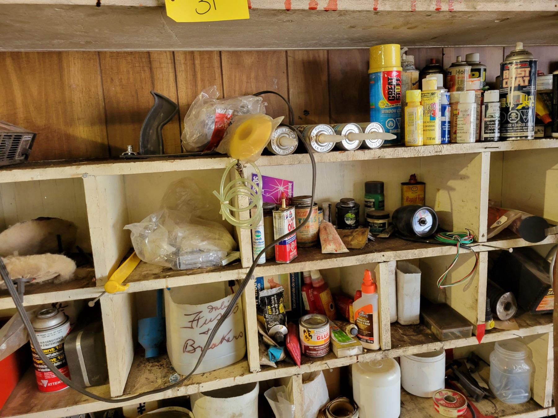 Contents on shelf; qty of paints, coatings, cleaners, glue, misc. small parts, gauges, propane, springs, plugs, grease guns etc. (Bring your own help to load & bring totes boxes or pails)