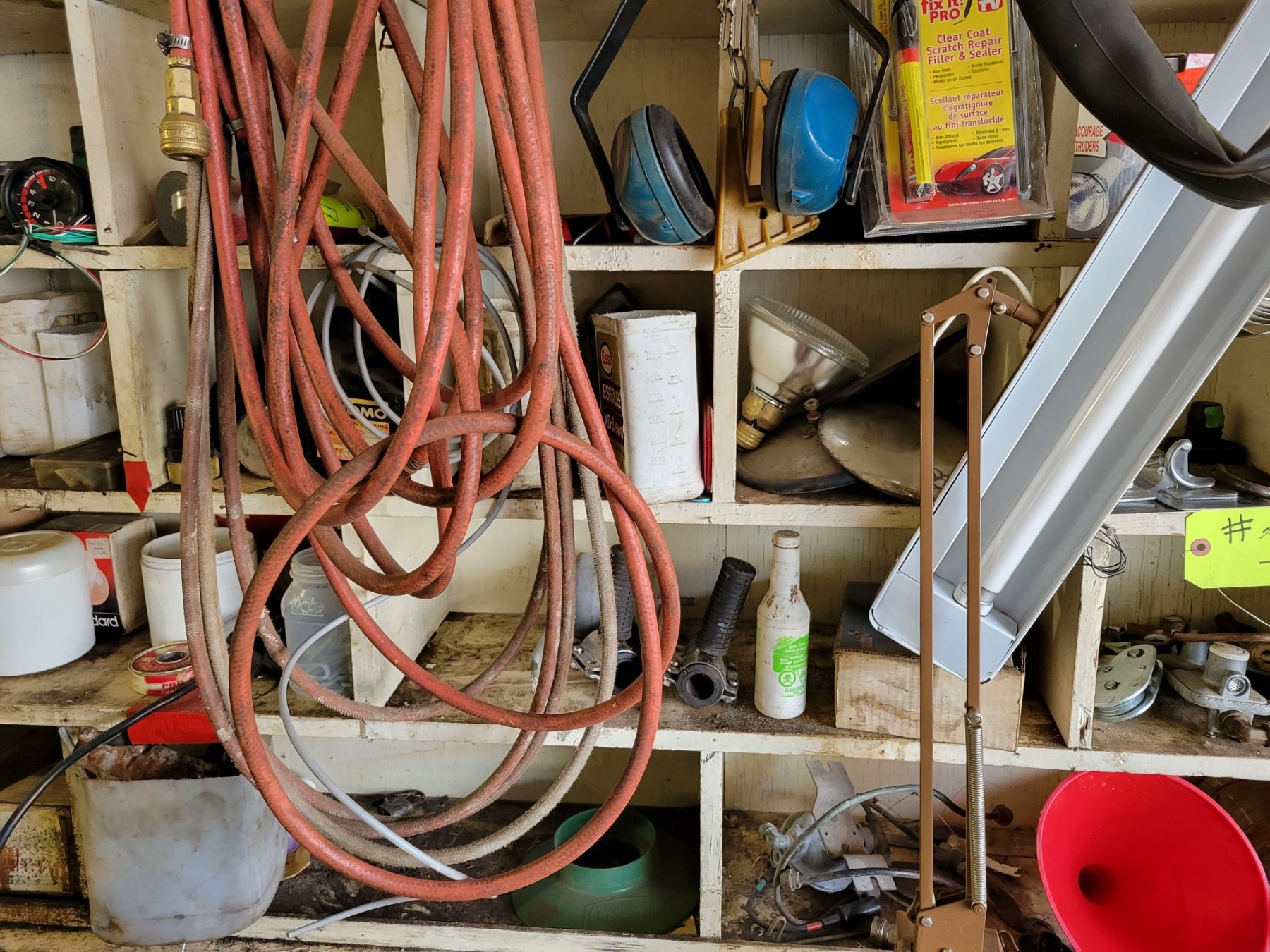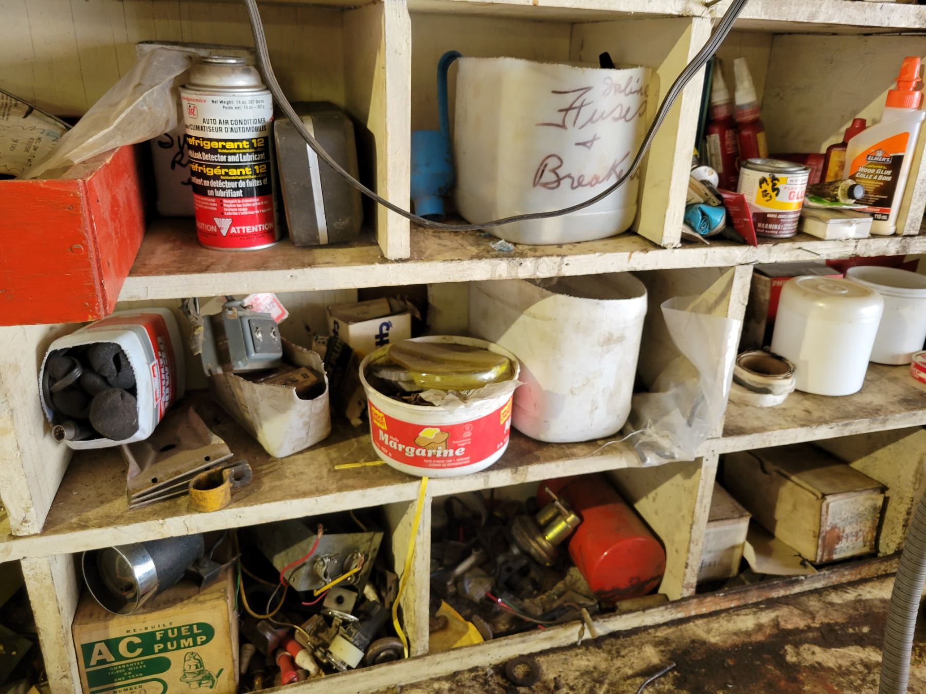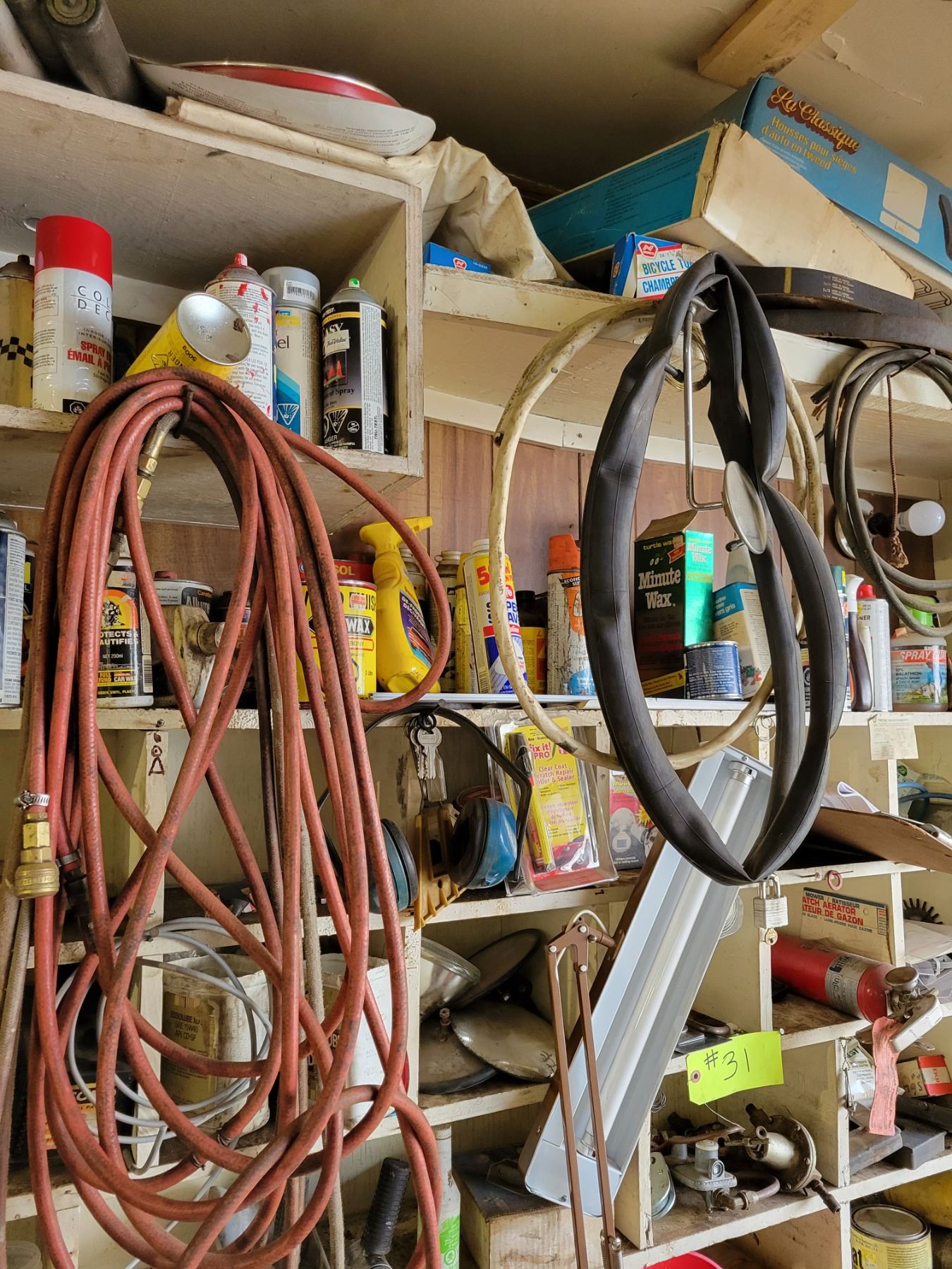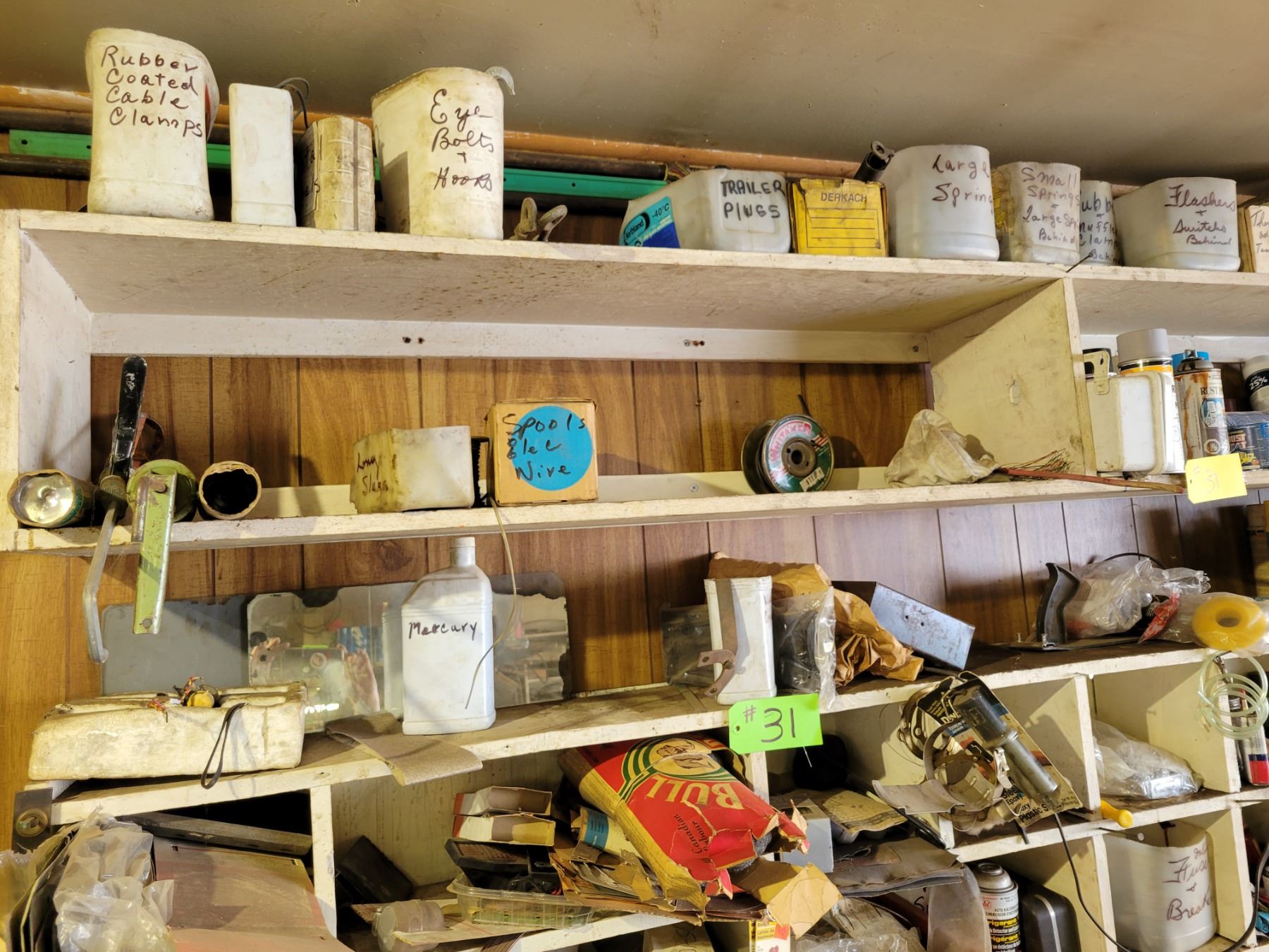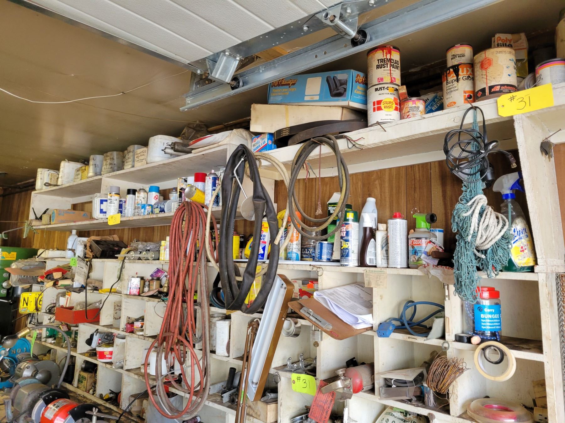 Contents on shelf; qty of paints, coatings, cleaners, glue, misc. small parts, gauges, propane, springs, plugs, grease guns etc. (Bring your own help to load & bring totes boxes or pails)