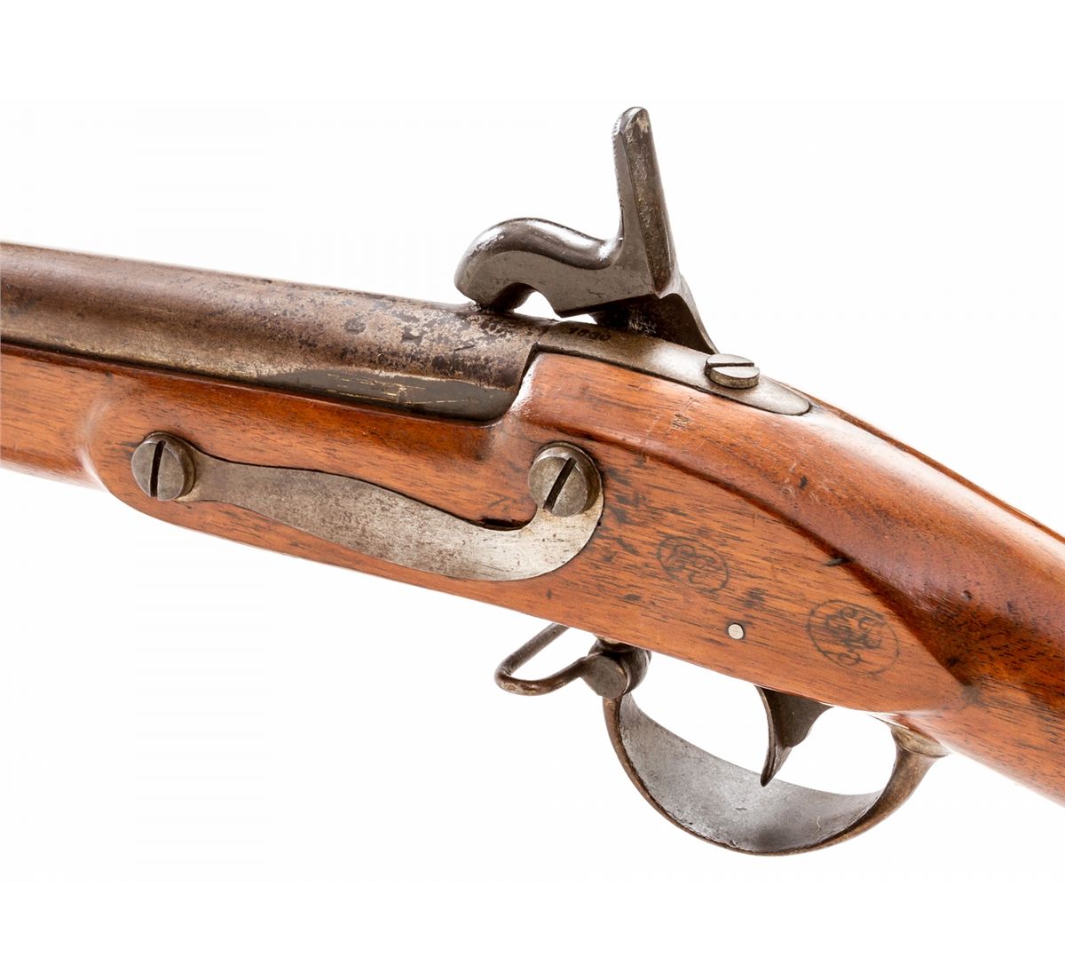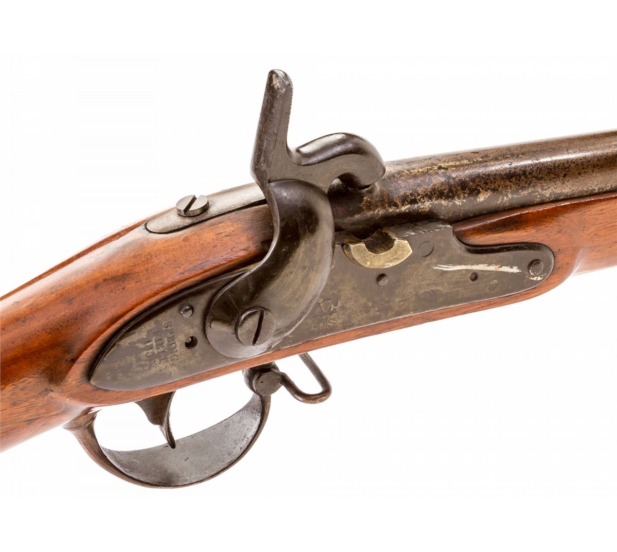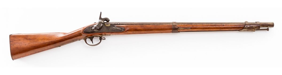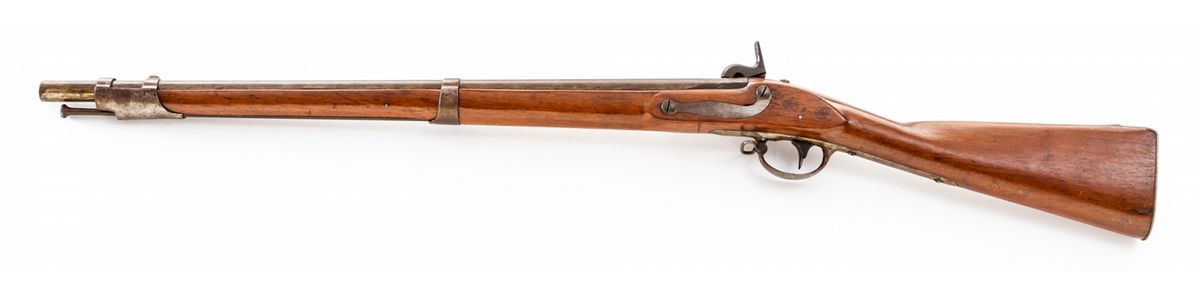 Converted Springfield Model 1830 U.S. Cadet Musket, altered to musketoon length and converted to percussion, .54 cal., 28'' barrel, blue finish, Federal eagle over ''U.S.'' to lockplate, as well as ''Springfield 1830'' to rear portion of lockplate. Full-length walnut stock, iron bands, with ramrod and ''U.S.'' marked buttplate. Condition is very good as converted, with general patination to barrel and lock. Stock with additional coat of varnish. Cartouches are mostly clear. Action may need some adjustment. Est.: $1,800-$2,400. (Antique)