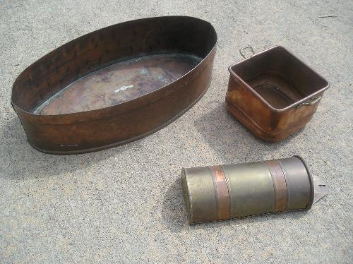 Three copper items. Oval & Square container, hanging pot.