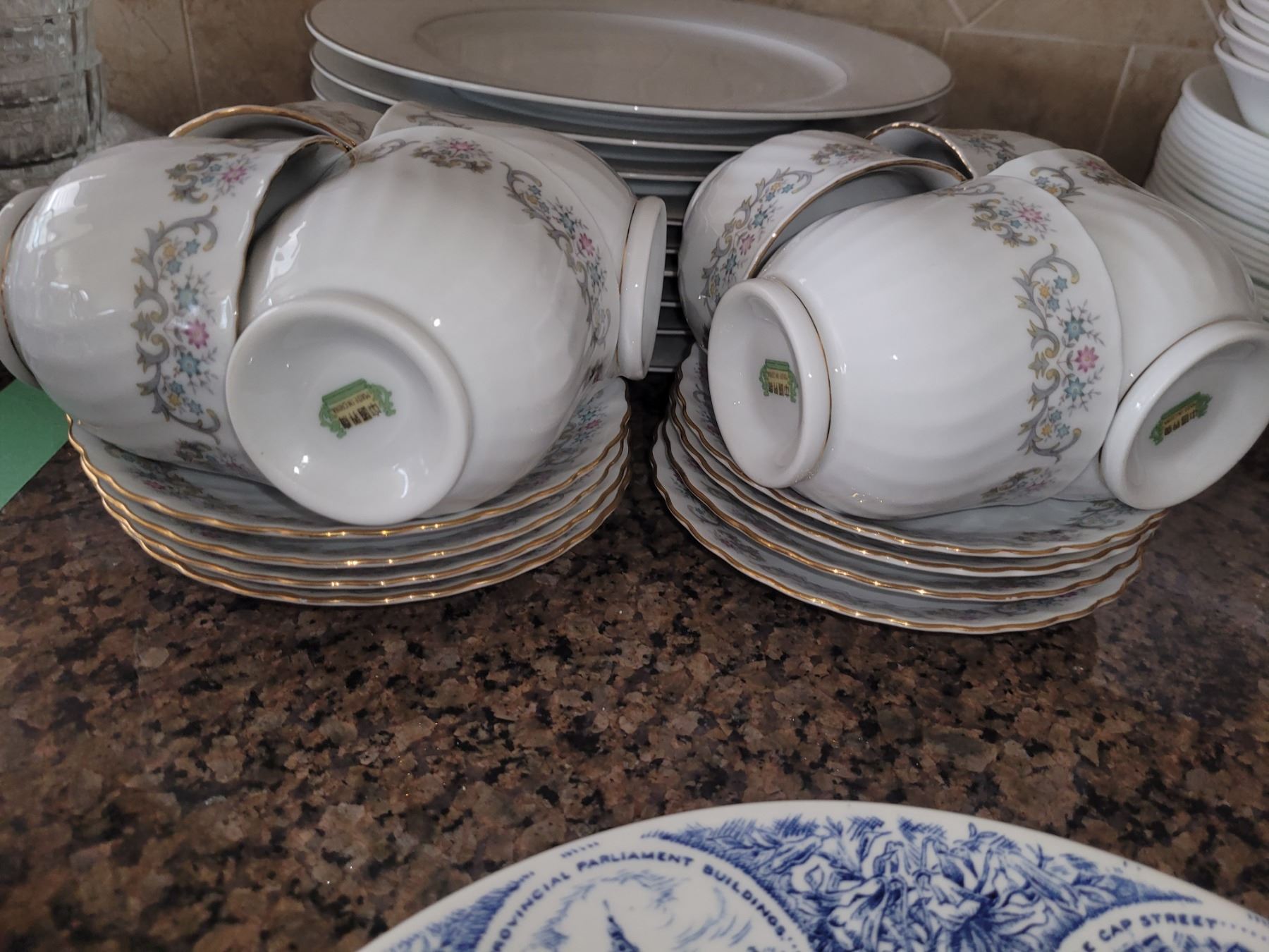 9 Crown Victoria plates, Lovelace pattern, 20 platter septuplets Corelle plates, 8 china tea cups, more. Pick up 9-10